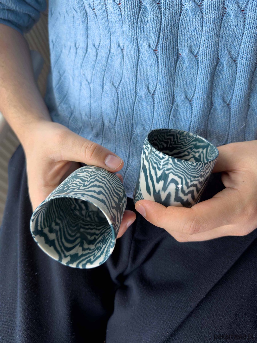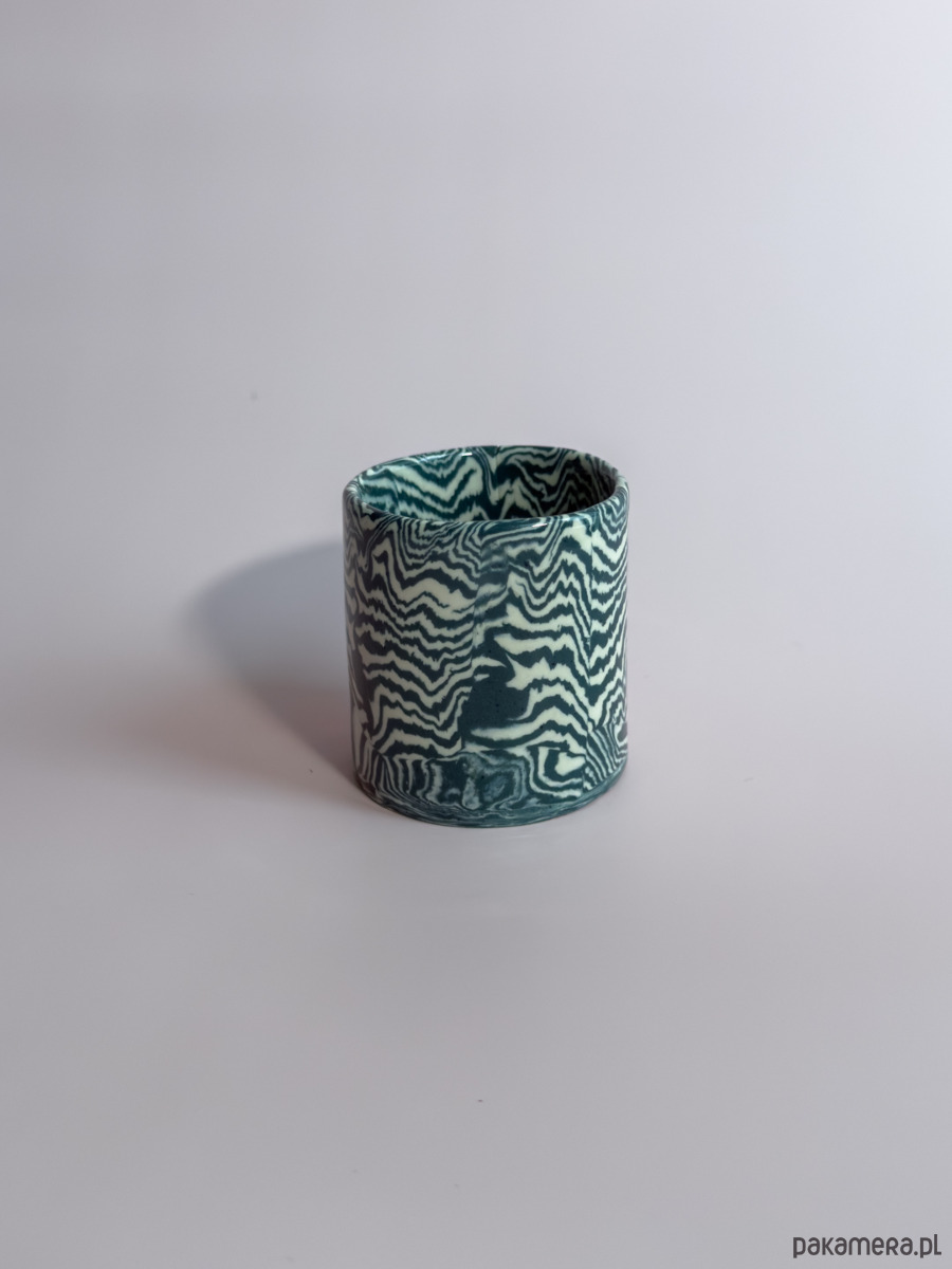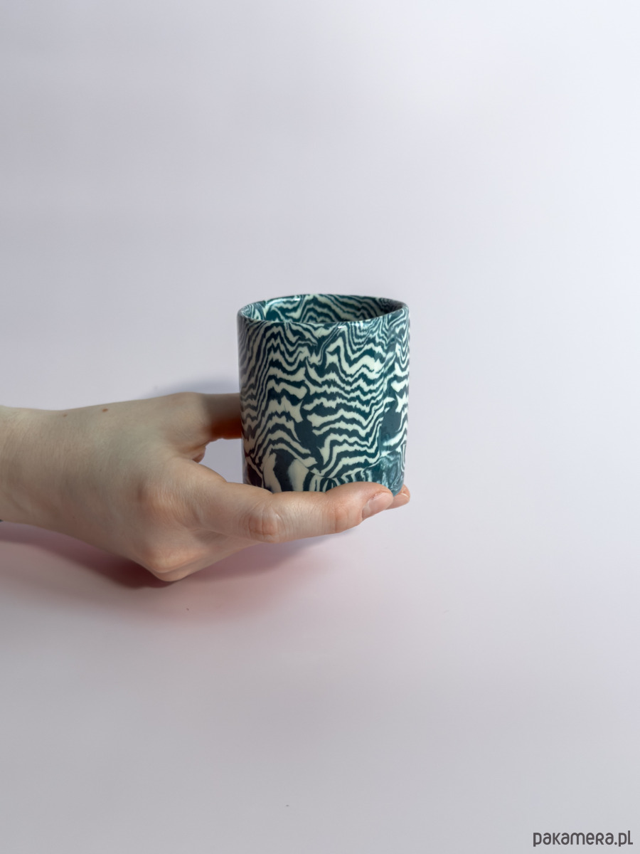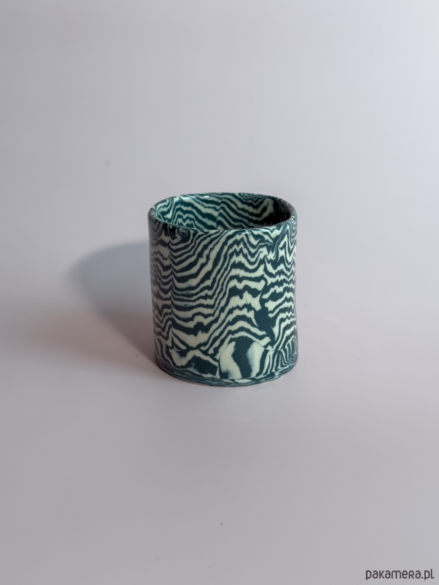 Kubek bez ucha, wykonany ręcznie w technice nerikomi, w której wzór powstaje z połączenia barwionych mas gliny i jest częścią samego materiału.