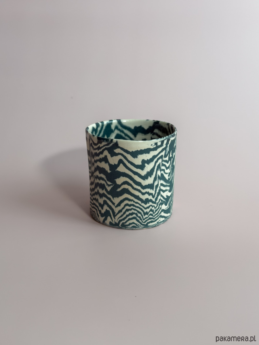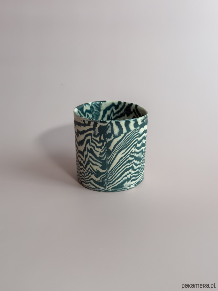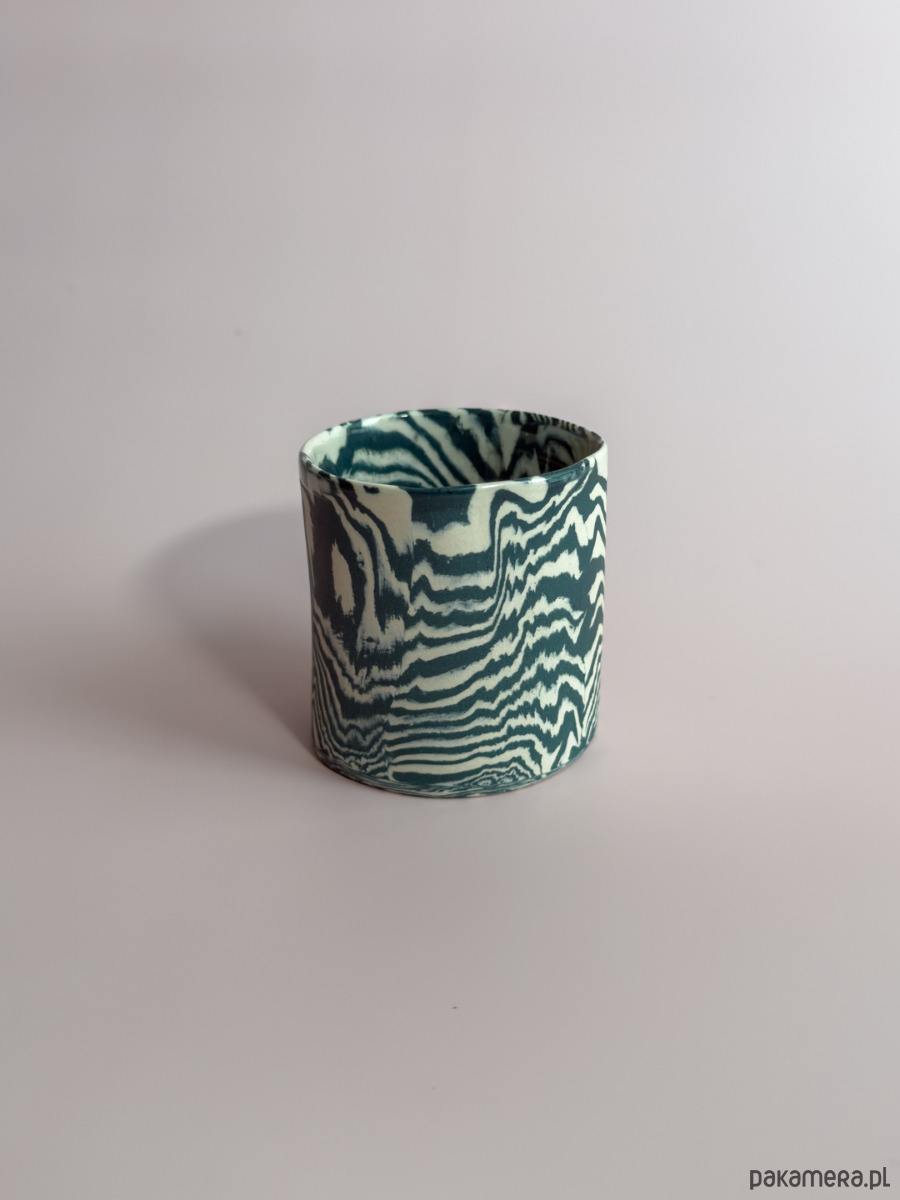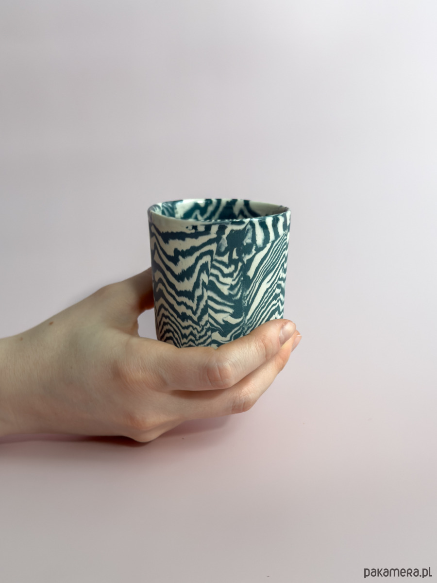 Kubek bez ucha, wykonany ręcznie w technice nerikomi, w której wzór powstaje z połączenia barwionych mas gliny i jest częścią samego materiału.