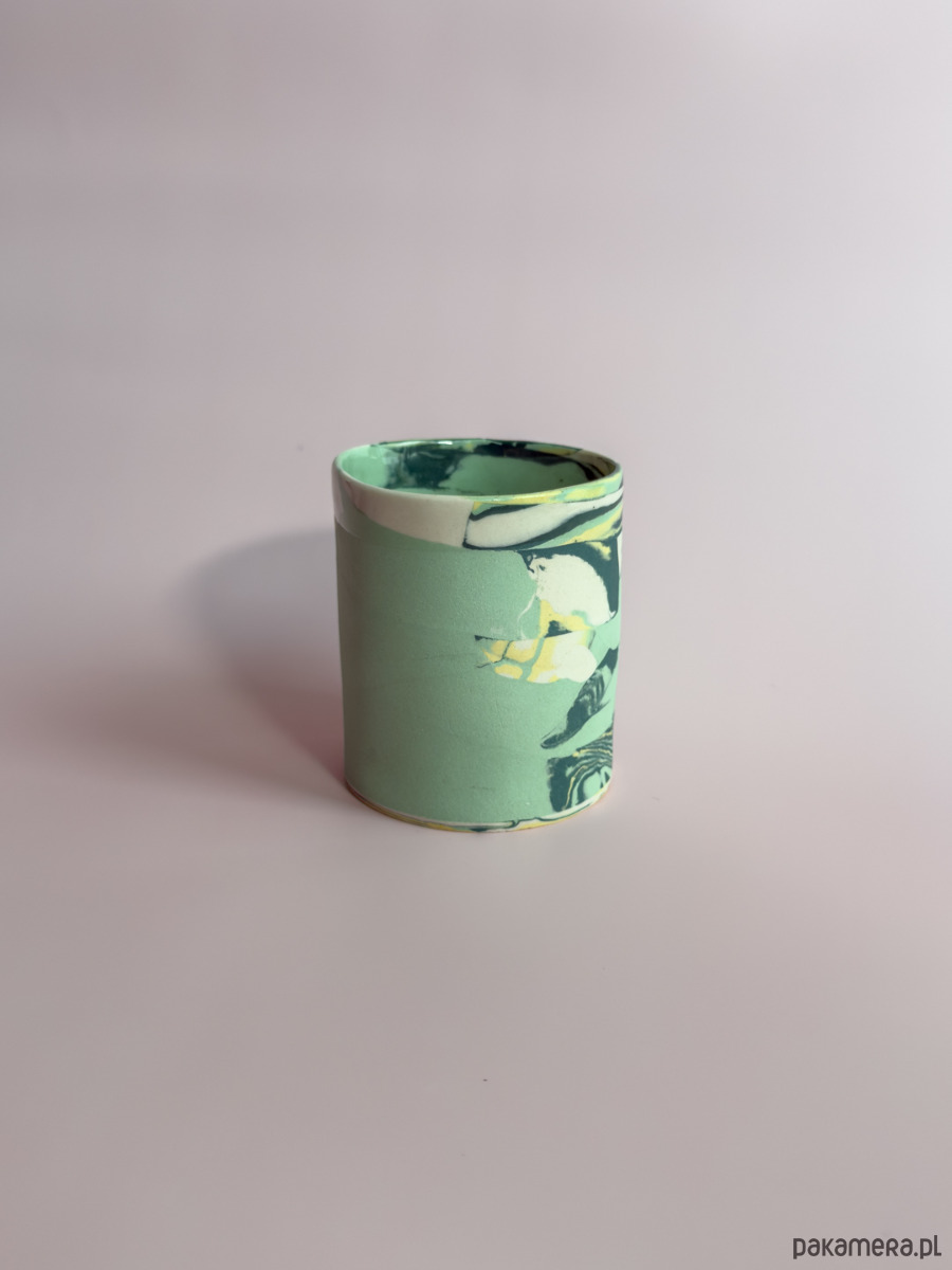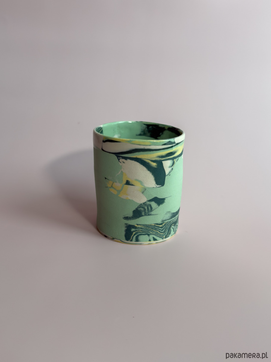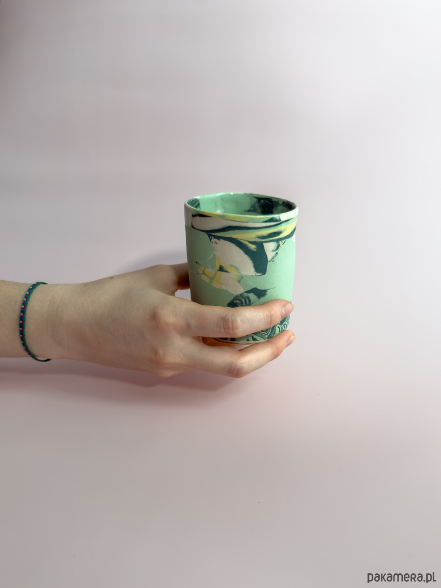 Kubek bez ucha, wykonany ręcznie w technice nerikomi, w której wzór powstaje z połączenia barwionych mas gliny i jest częścią samego materiału.