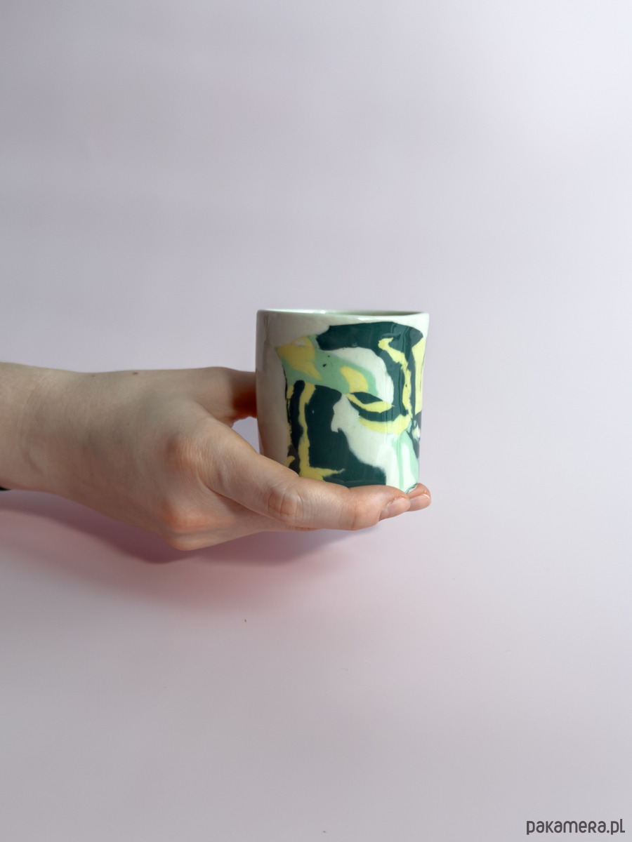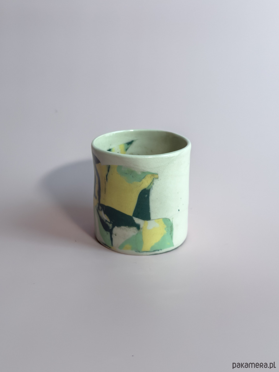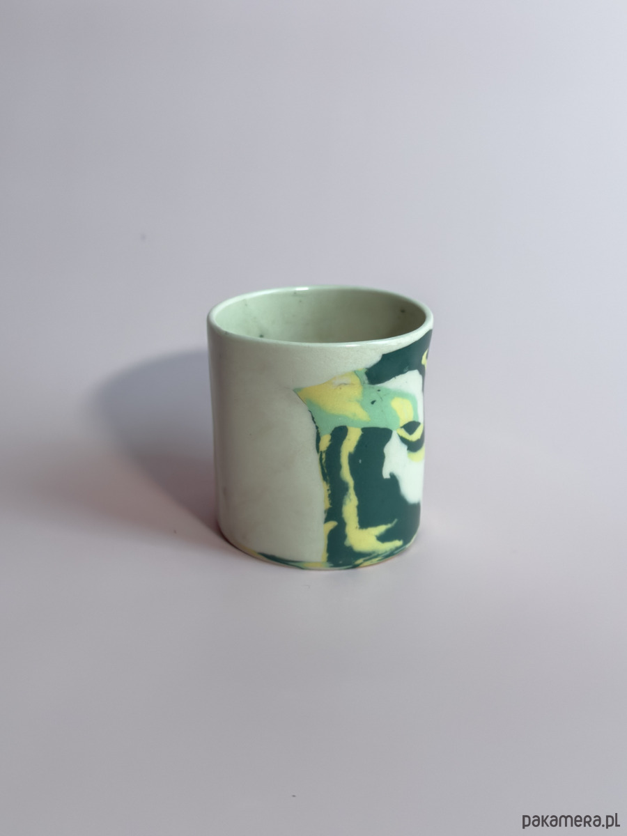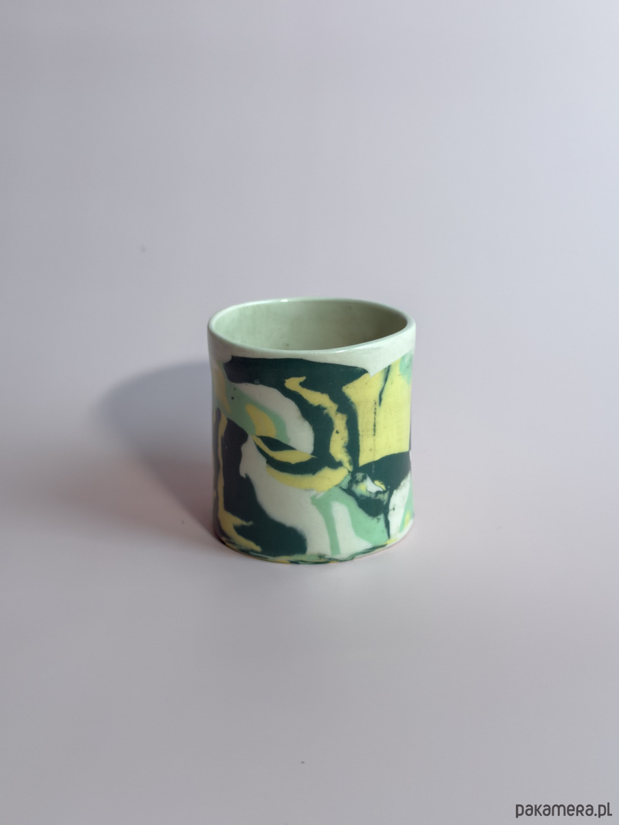 Kubek bez ucha, wykonany ręcznie w technice nerikomi, w której wzór powstaje z połączenia barwionych mas gliny i jest częścią samego materiału.