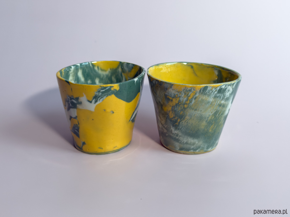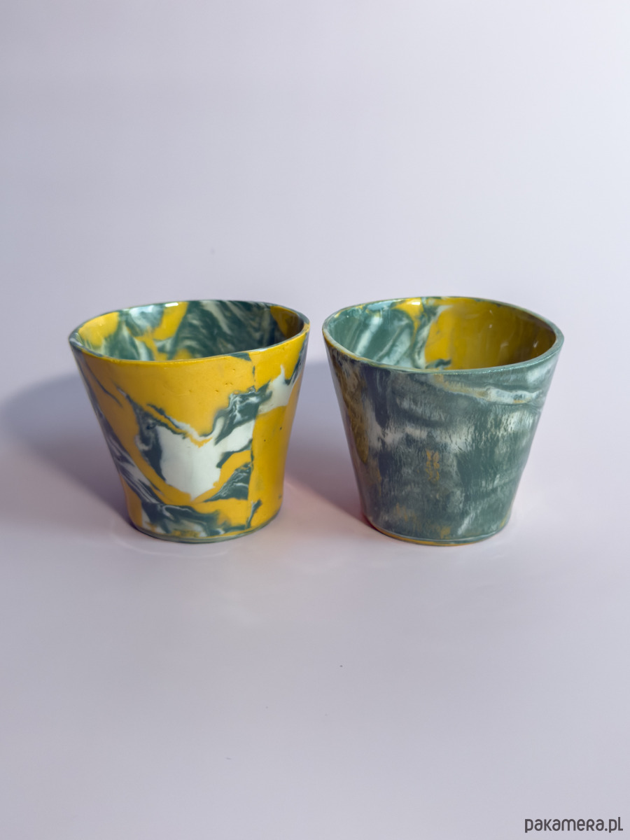 Kubeczki bez ucha, wykonane ręcznie w technice nerikomi, w której wzór powstaje z połączenia barwionych mas gliny i jest częścią samego materiału.