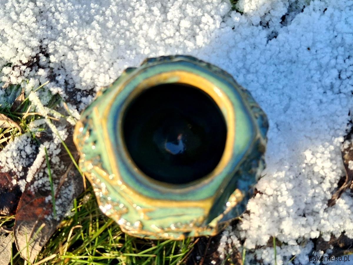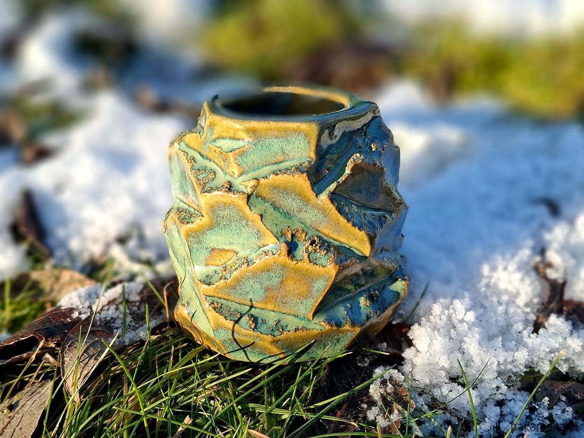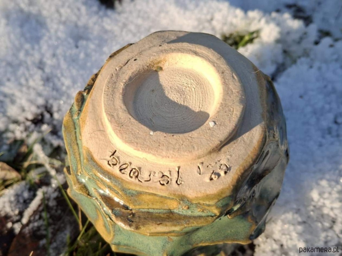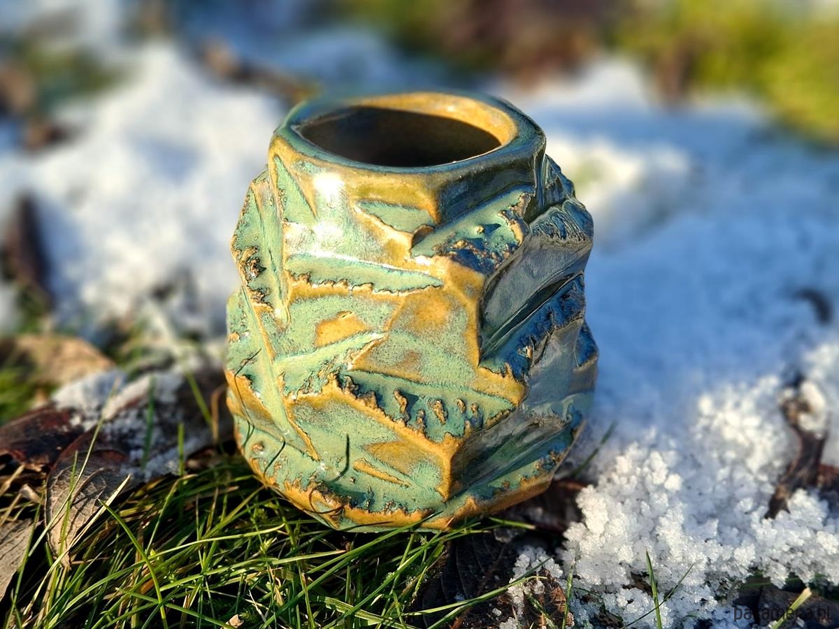 Ta czarka wygląda, jakby nie została wykonana ludzką ręką, lecz odnaleziona w głębokim, wilgotnym jarze po ulewnym deszczu. To mały monument ku czci nieposkromionej przyrody. Powierzchnia naczynia przypomina mchami porośnięty głaz. Głębokie bruzdy wyglądają jak ścieżki wyżłobione przez wodę w korze starego drzewa. Jasna zieleń szkliwa ma w sobie spokój leśnej gęstwiny. Tam, gdzie światło załamuje się na krawędziach, pojawiają się ciepłe, miodowe błyski – jak promienie słońca przebijające się przez korony drzew i rozgrzewające wilgotną ziemię. To czarka dla osoby, która pije kawę czy herbatę nie tylko dla smaku, ale dla rytuału – dla kogoś, kto będzie obracać naczynie w dłoniach, podziwiając jak „Moss” lśni w porannym słońcu.