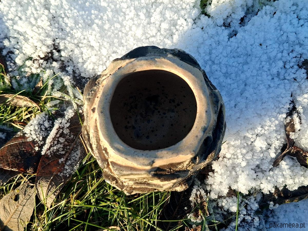 Czarka zrobiona jest z ciemnej gliny, dwukrotnie wypalana w wysokiej temperaturze, poszkliwiona. Jej wymiary: 6 x 8 cm.