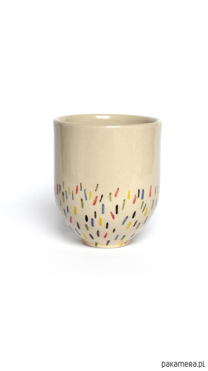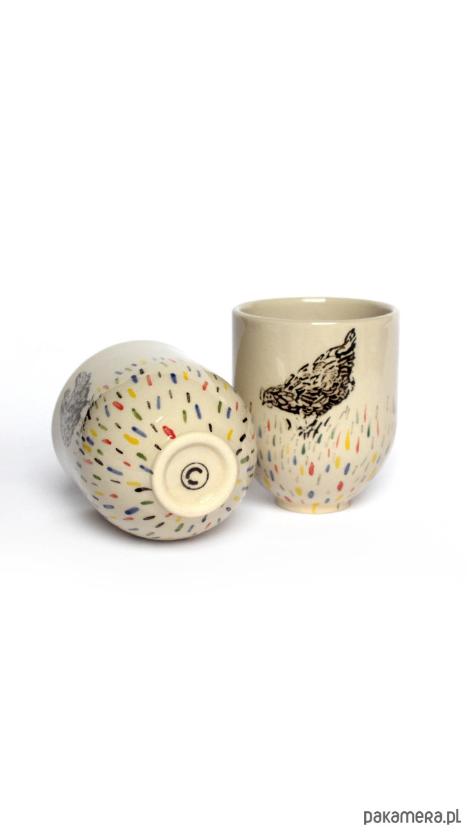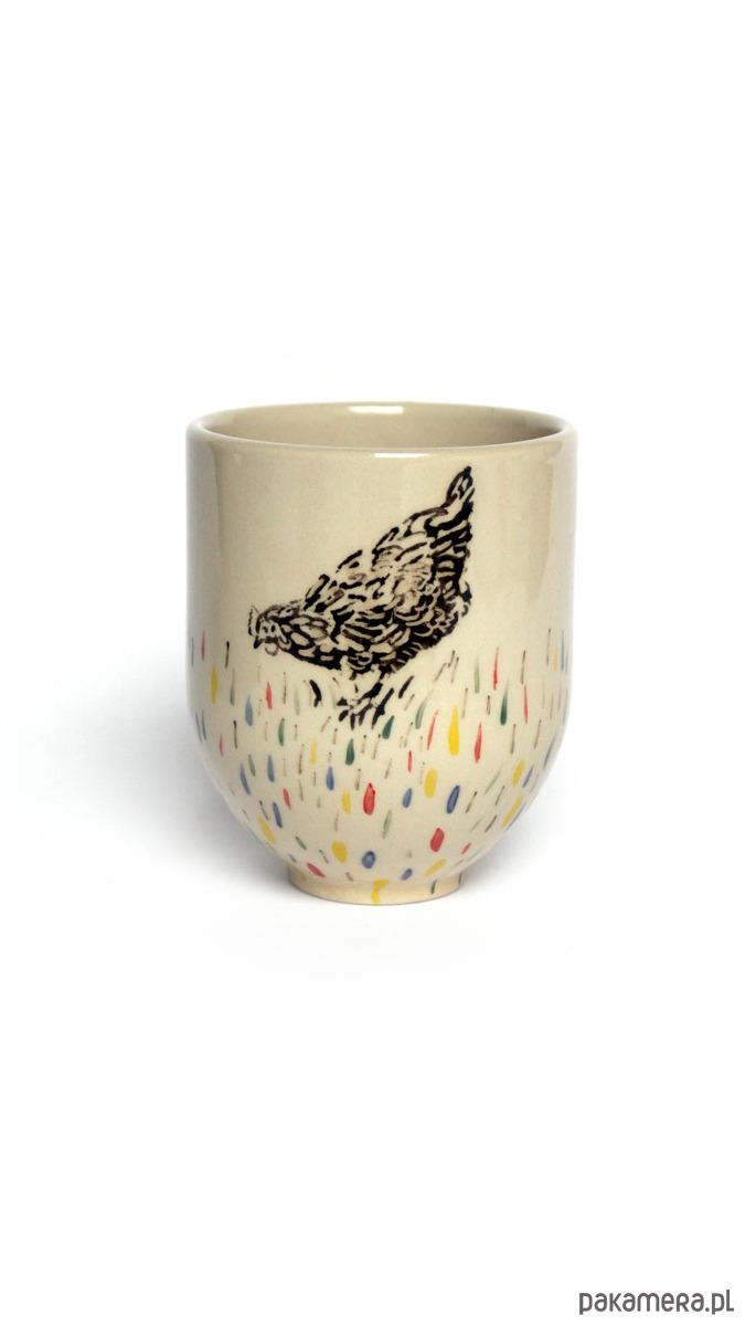 Grafika ręcznie malowana farbami podszkliwnymi. Czarka wykonana w małej krakowskiej pracowni ceramicznej. Zastosowano wysokiej jakości kremową glinę kamionkową, 100% handmade. Szkliwiona błyszczącym, transparentnym szkliwem. Sygnowany. Kubeczek można myć w zmywarce.