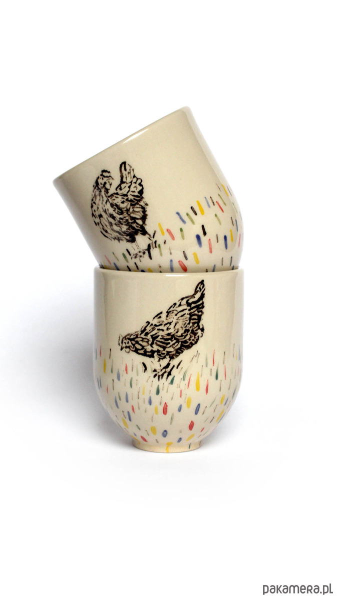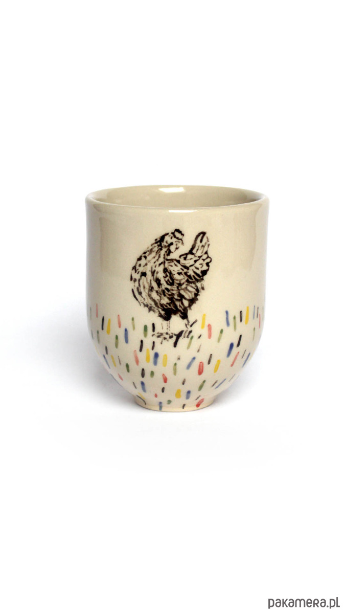 Grafika ręcznie malowana farbami podszkliwnymi. Czarka wykonana w małej krakowskiej pracowni ceramicznej. Zastosowano wysokiej jakości kremową glinę kamionkową, 100% handmade. Szkliwiona błyszczącym, transparentnym szkliwem. Sygnowany. Kubeczek można myć w zmywarce.