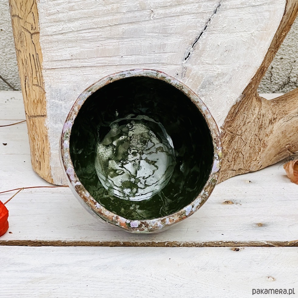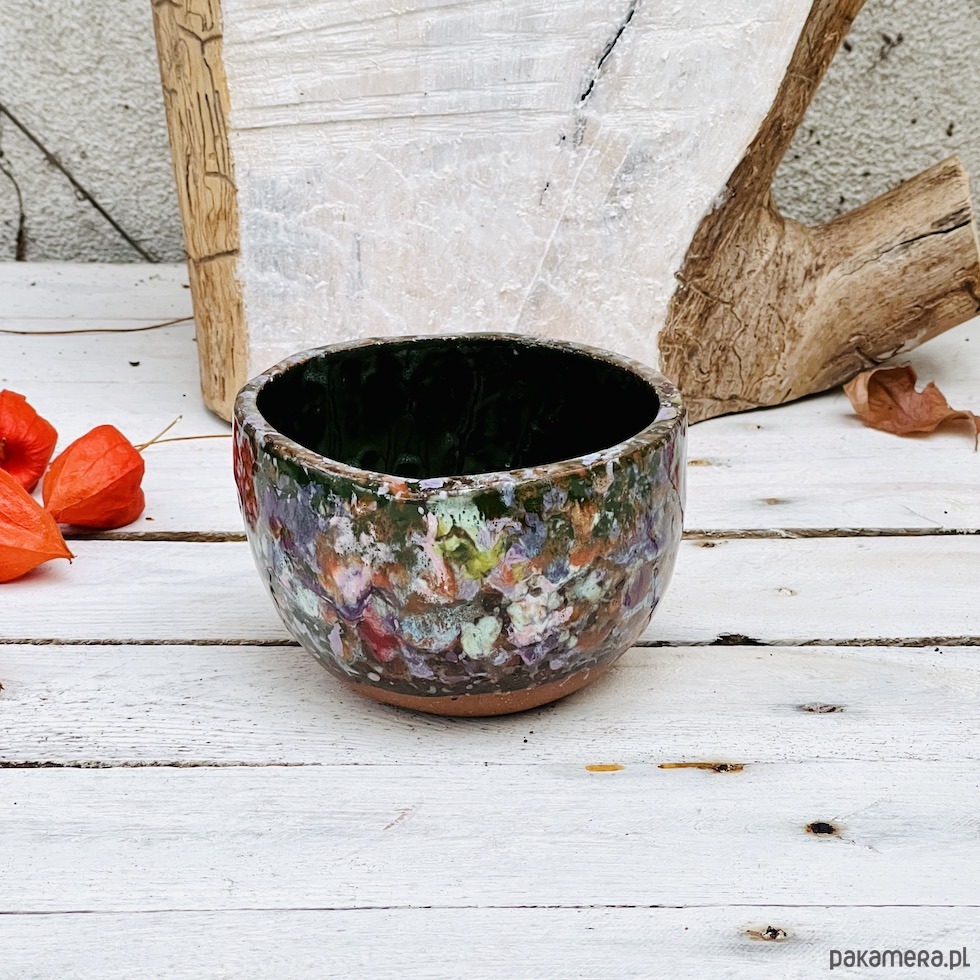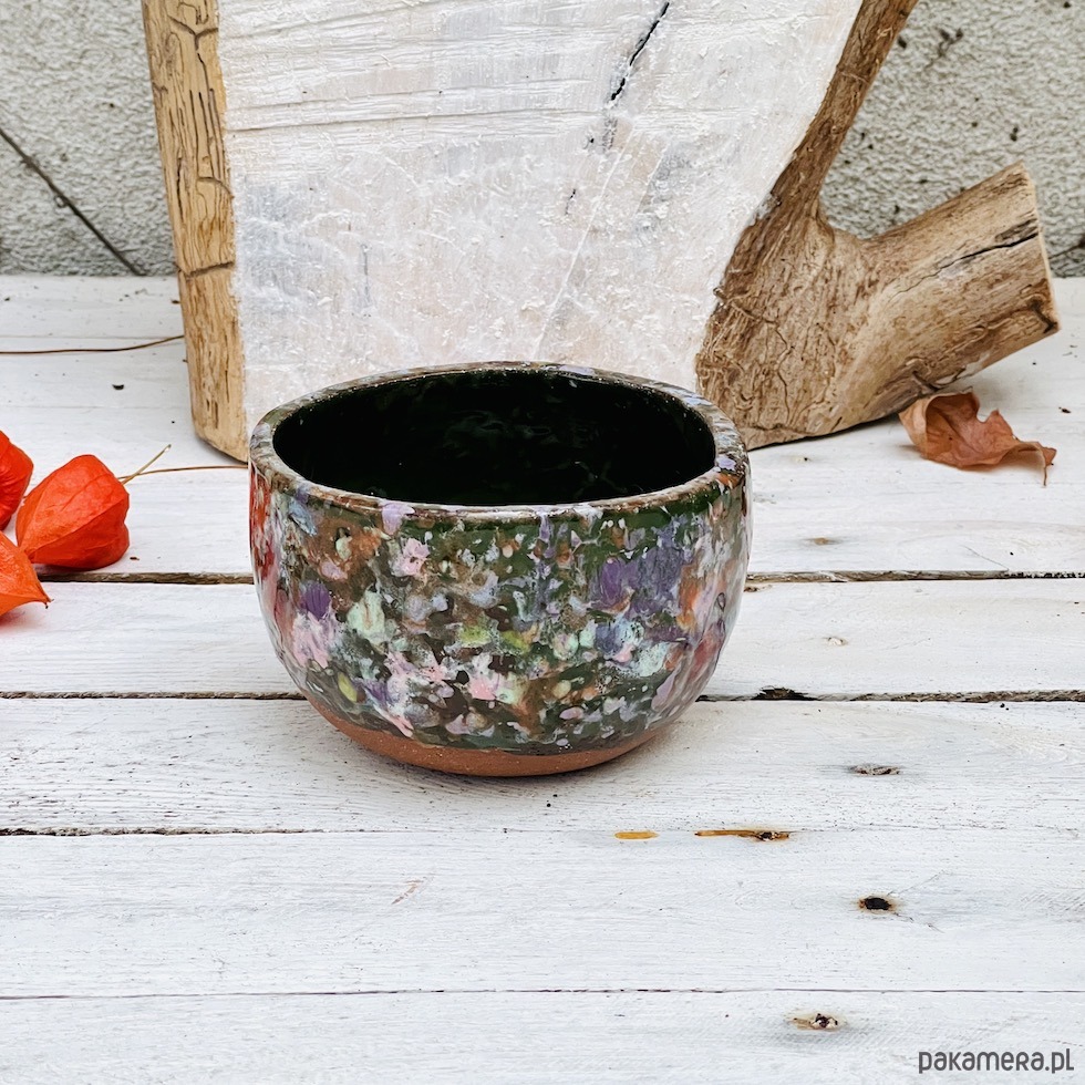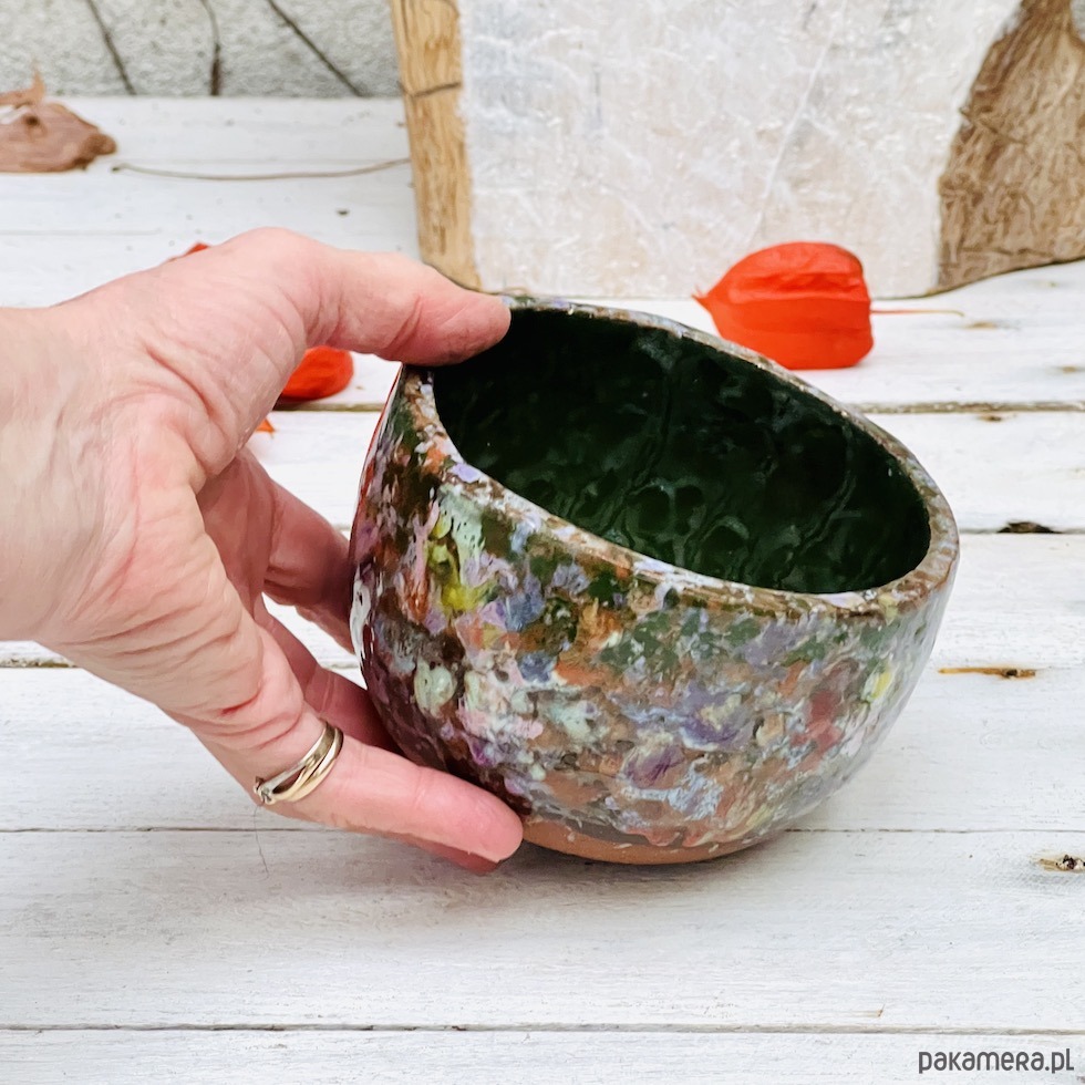 Spora czarka ceramiczna o pojemności 400 ml została uformowana ręcznie i ozdobiona zlewającymi się kolorowymi szkliwami. Nadaje się do serwowania herbaty matcha, innych gorących i zimnych napojów oraz zupy lub płatków z mlekiem. Idealna do serwowania przekąsek i jako miska na owoce. Będzie ciekawym akcentem dekoracyjnym w kuchni, łazience lub na półce z książkami. To idealny prezent dla osoby ceniącej sobie ręcznie wykonaną ceramikę.