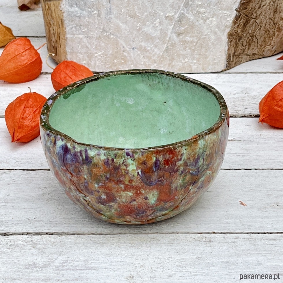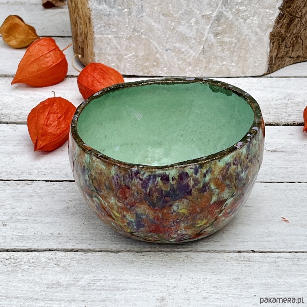Spora czarka ceramiczna o pojemności 400 ml została uformowana ręcznie i ozdobiona zlewającymi się kolorowymi szkliwami, wnętrze w kolorze pistacjowo zielonym. Nadaje się do serwowania herbaty matcha, innych gorących i zimnych napojów oraz zupy lub płatków z mlekiem. Idealna do serwowania przekąsek i jako miska na owoce. Będzie ciekawym akcentem dekoracyjnym w kuchni, łazience lub na półce z książkami. To idealny prezent dla osoby ceniącej sobie ręcznie wykonaną ceramikę.