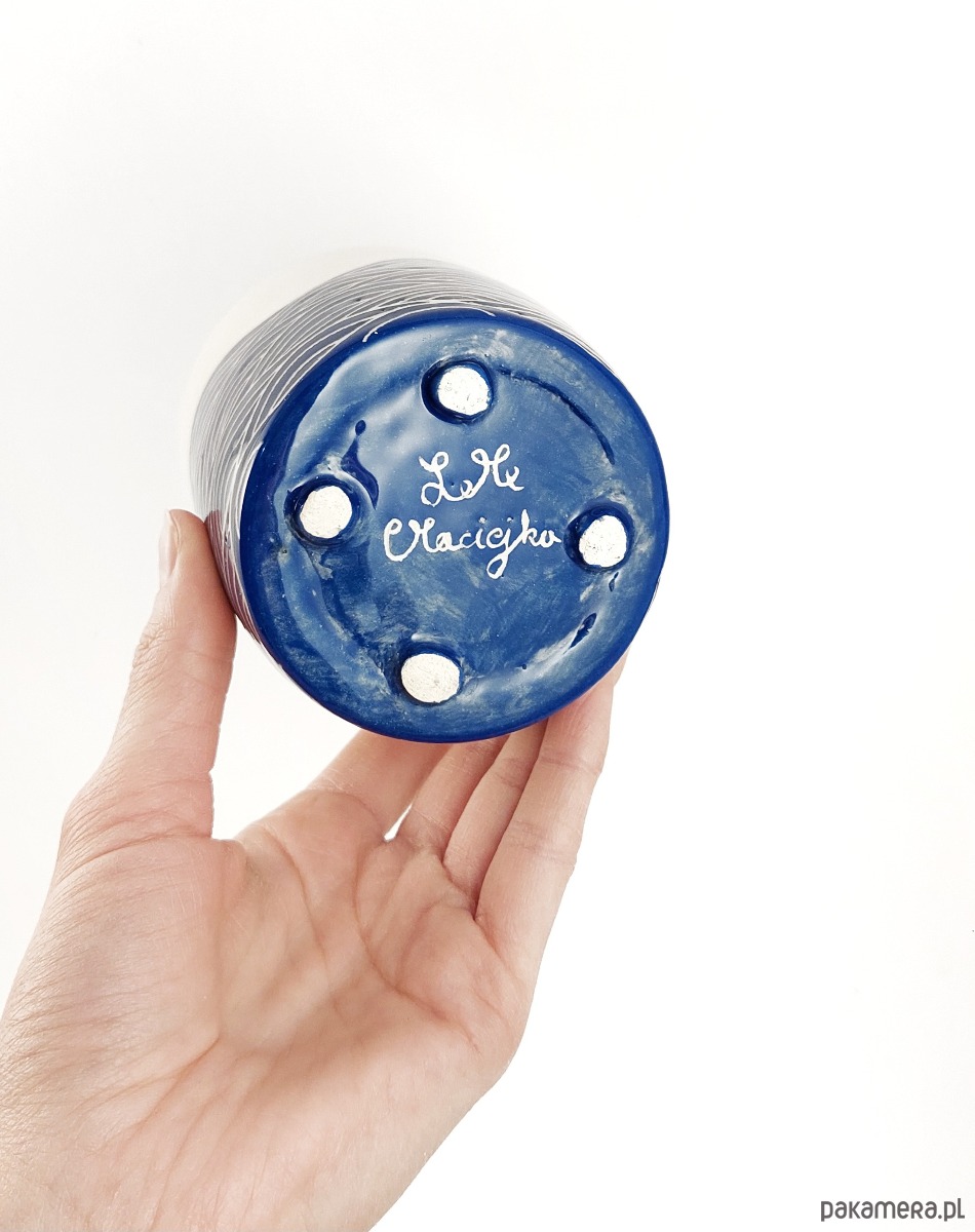Kubeczek został ulepiony i ozdobiony ręcznie, dlatego posiada delikatnie nieregularny kształt, który nadaje mu unikatowy charakter.