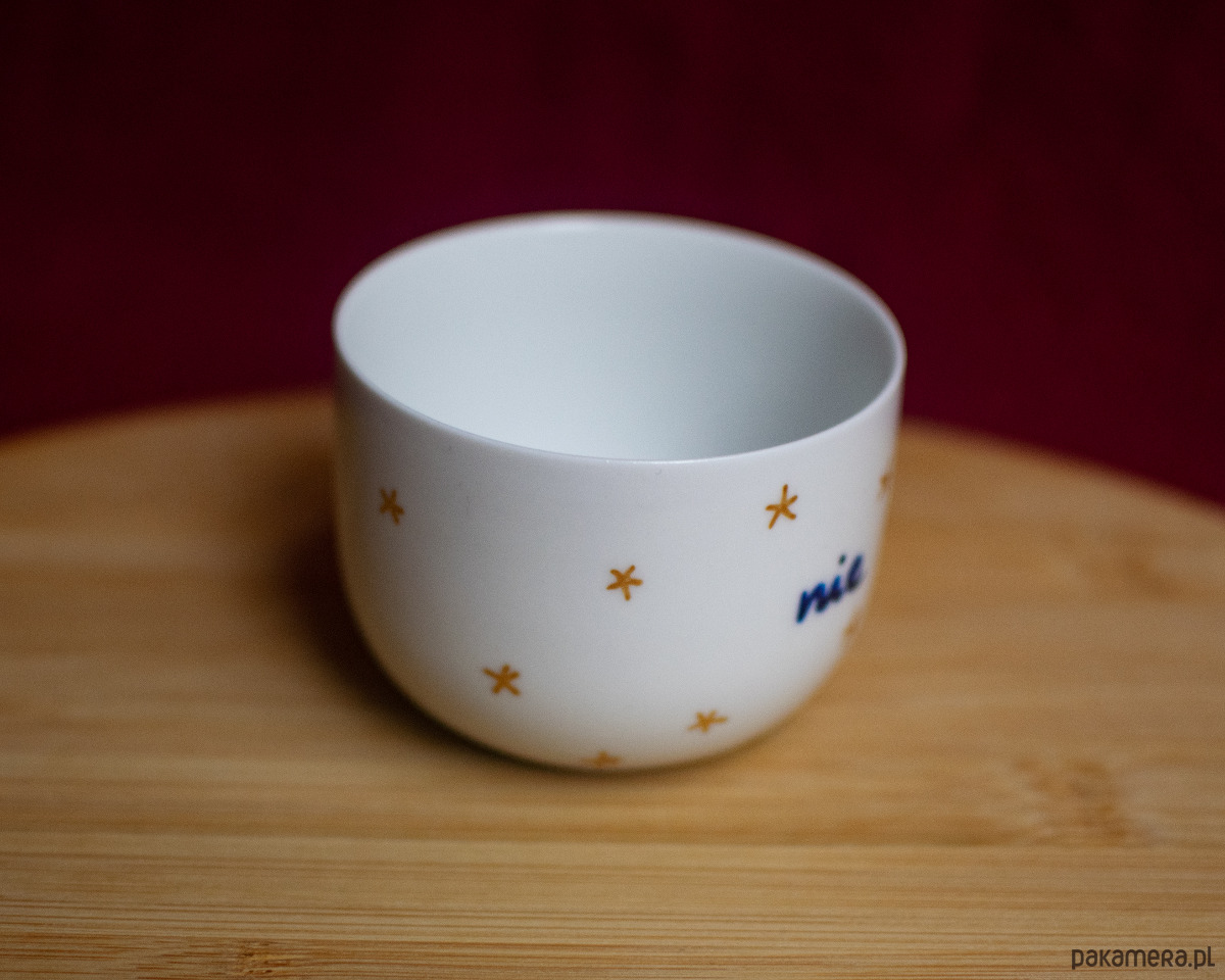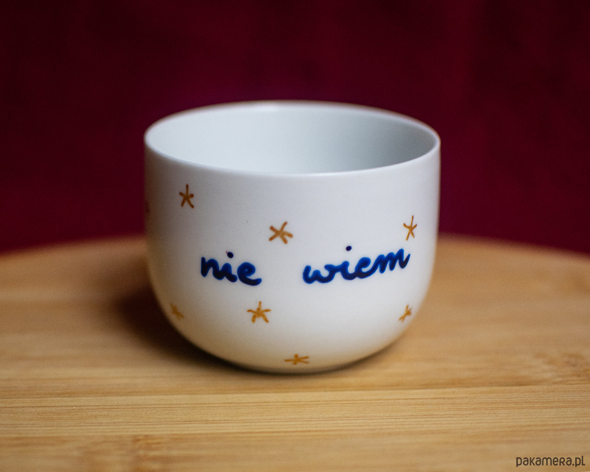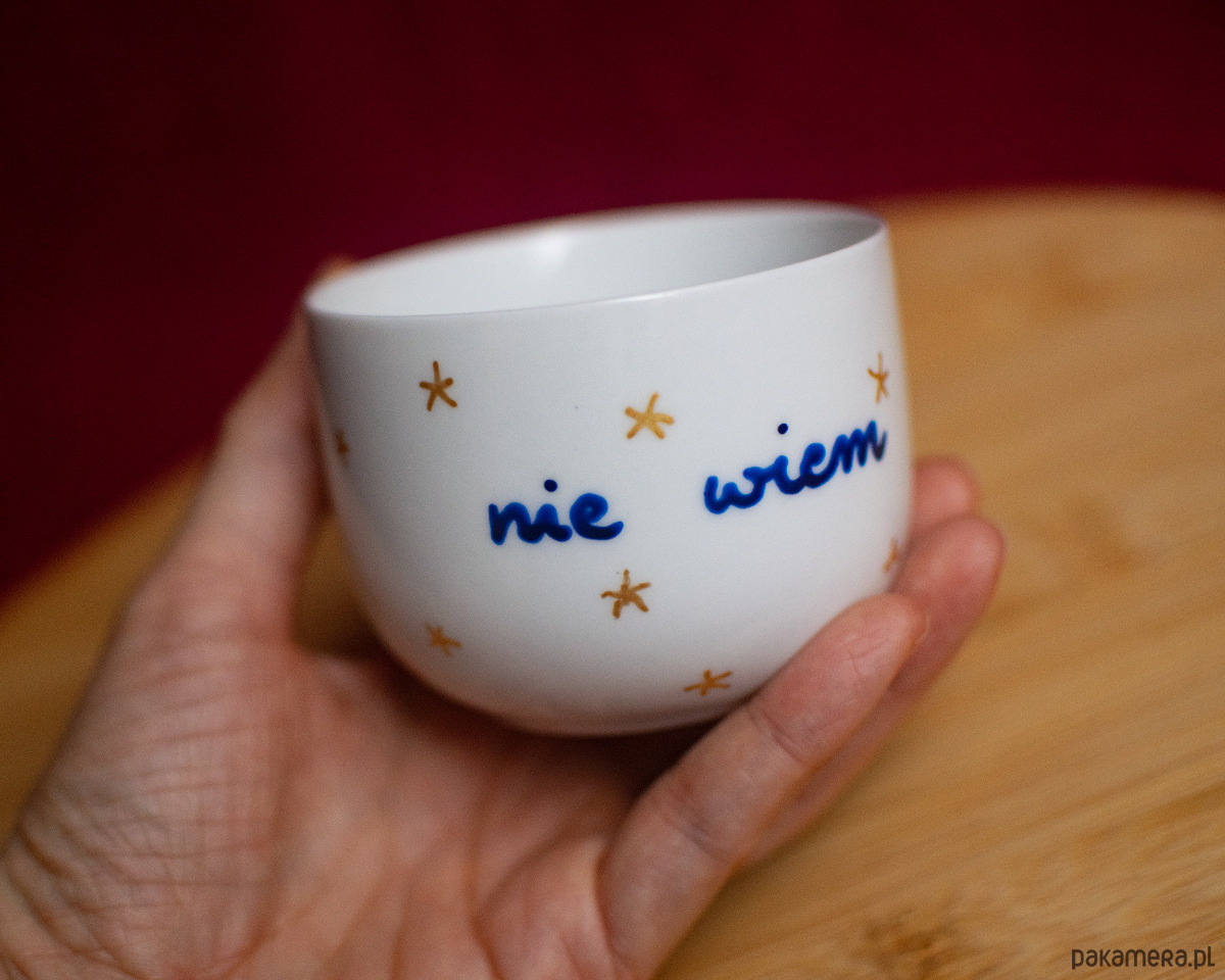 Ręcznie malowana biała czarka z drugiego obiegu. Ozdobiona napisem NIE WIEM oraz złotymi gwiazdkami.
