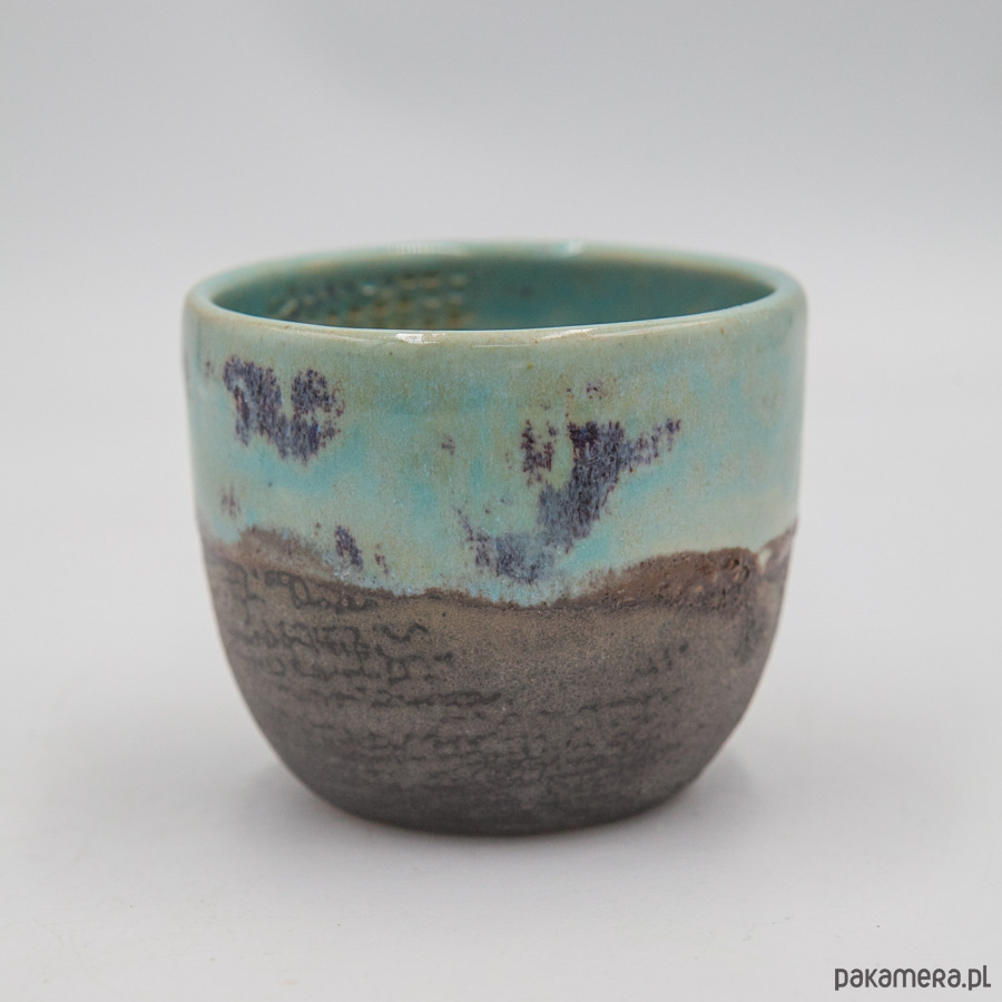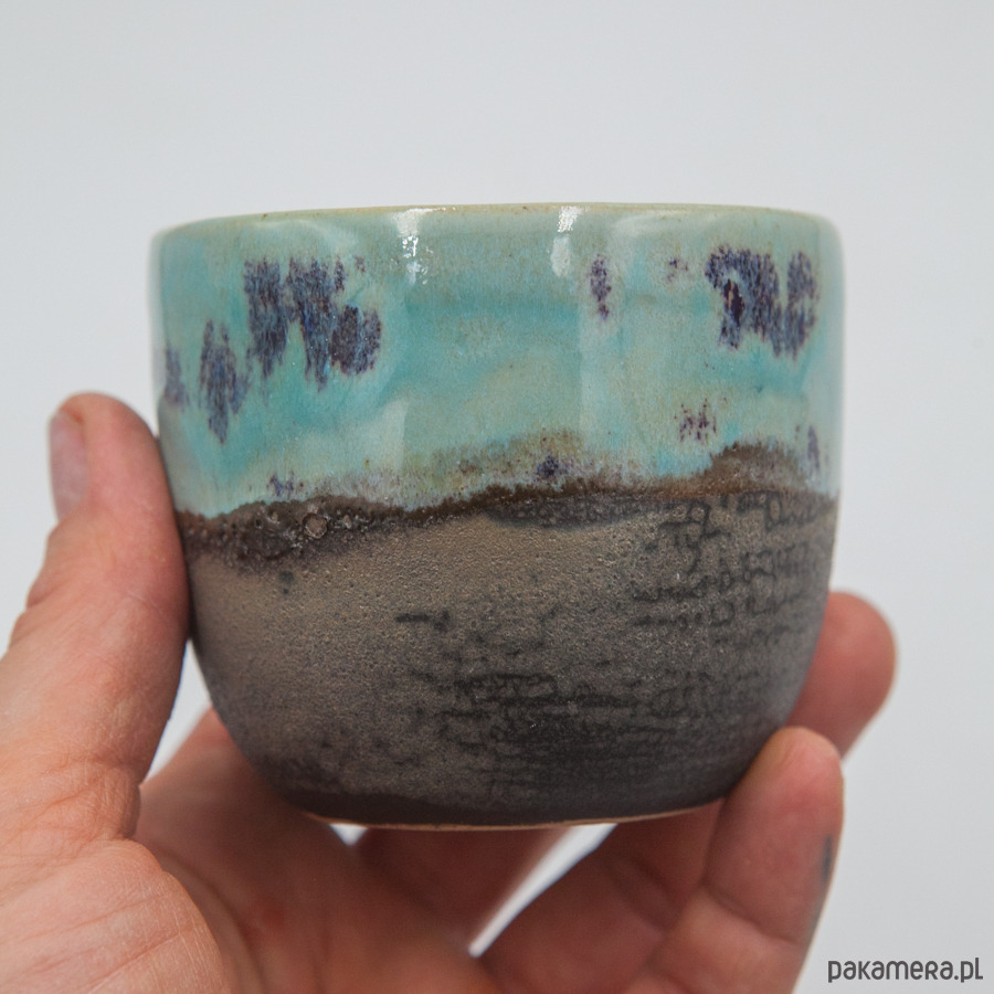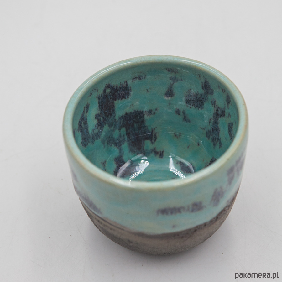 Kolorystyka czarki: dół szkliwiony czarnym szkliwem przypominającym magmę, góra szkliwiona kolorem niebieskim z fioletowymi zaciekami.