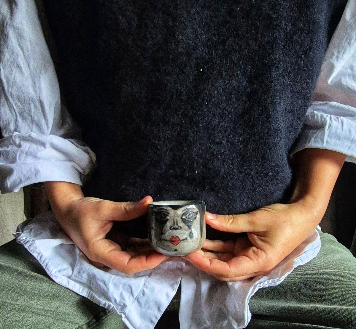 Na powierzchni naczynia znajduje się autorska, ręcznie malowana ilustracja twarzy, wykonana bez użycia kalek. Delikatne pociągnięcia pędzla i subtelna faktura gliny nadają jej wyjątkowy charakter i ekspresję.