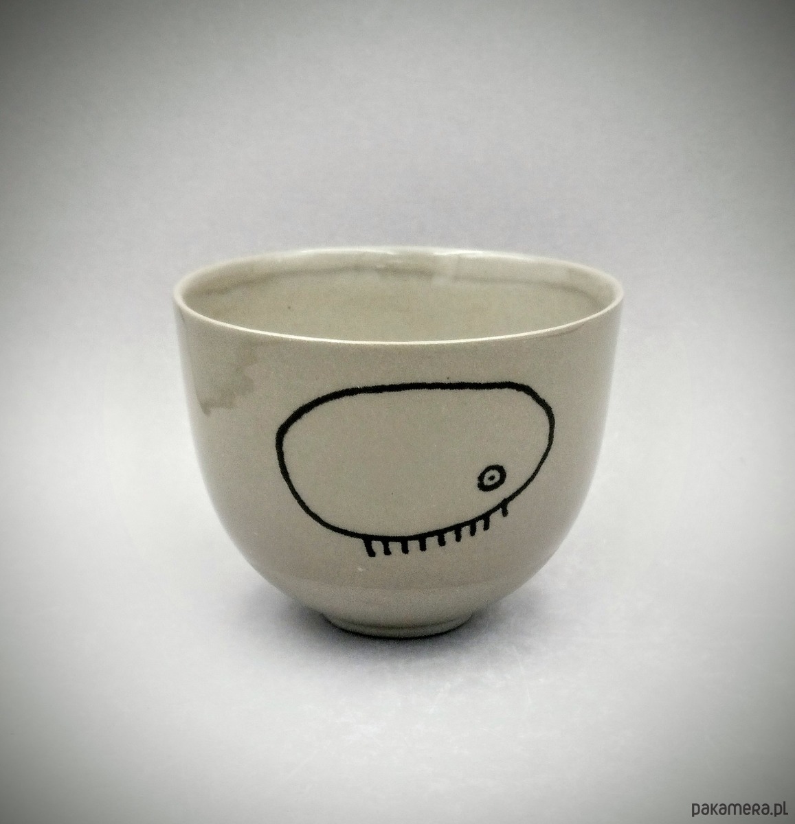 Ceramiczna czarka ręcznie wykonana z barwionej kamionki, pokryta błyszczącym szkliwem, przeznaczonym do kontaktu z żywnością, dekorowana autorskim wzorem. Wymiary: wysokość ok.8cm, średnica ok.5,5cm, pojemność około 200ml