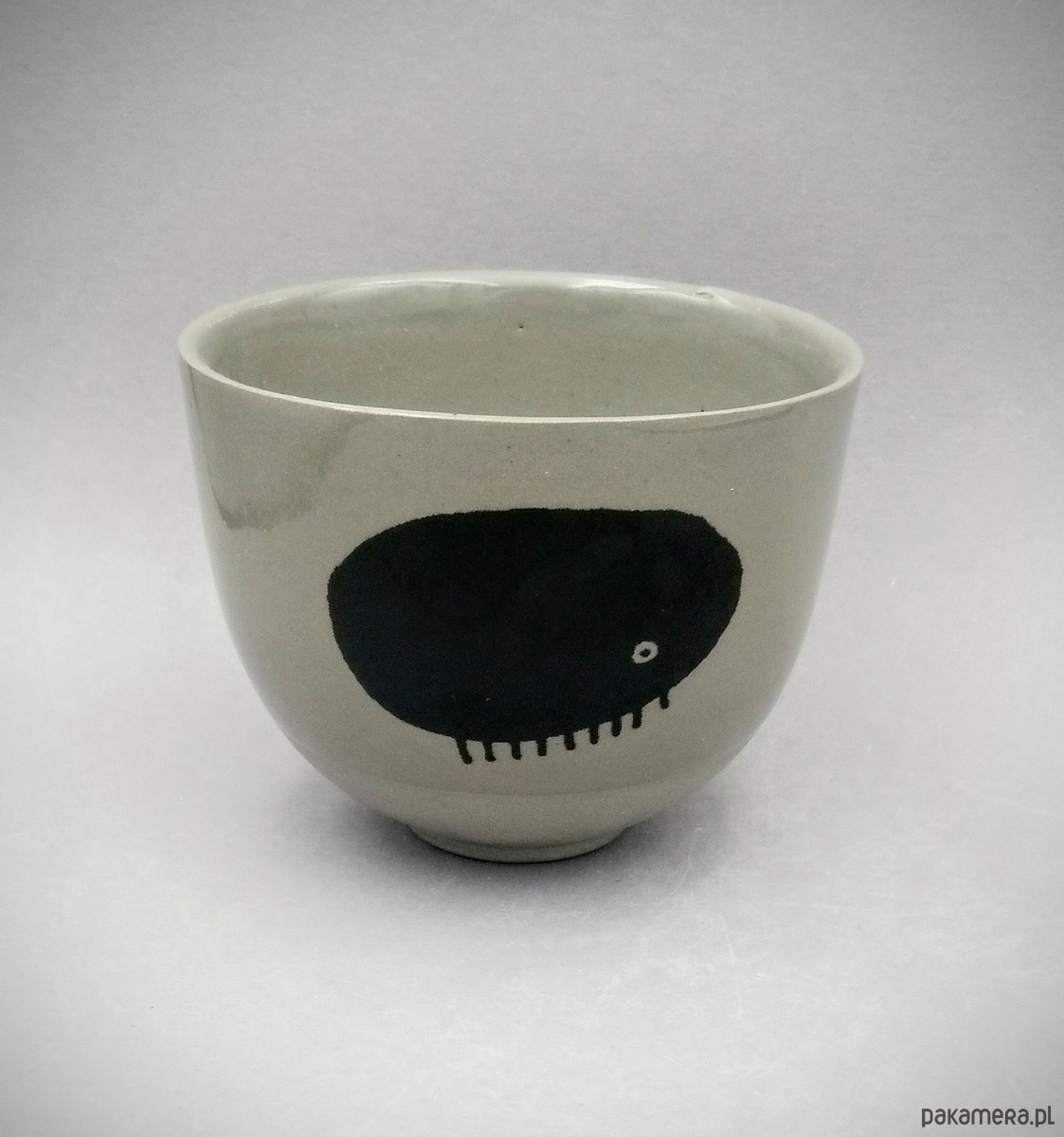 Ceramiczna czarka ręcznie wykonana z barwionej kamionki, pokryta błyszczącym szkliwem, przeznaczonym do kontaktu z żywnością, dekorowana autorskim wzorem. Wymiary: wysokość ok.8cm, średnica ok.5,5cm, pojemność około 200ml
