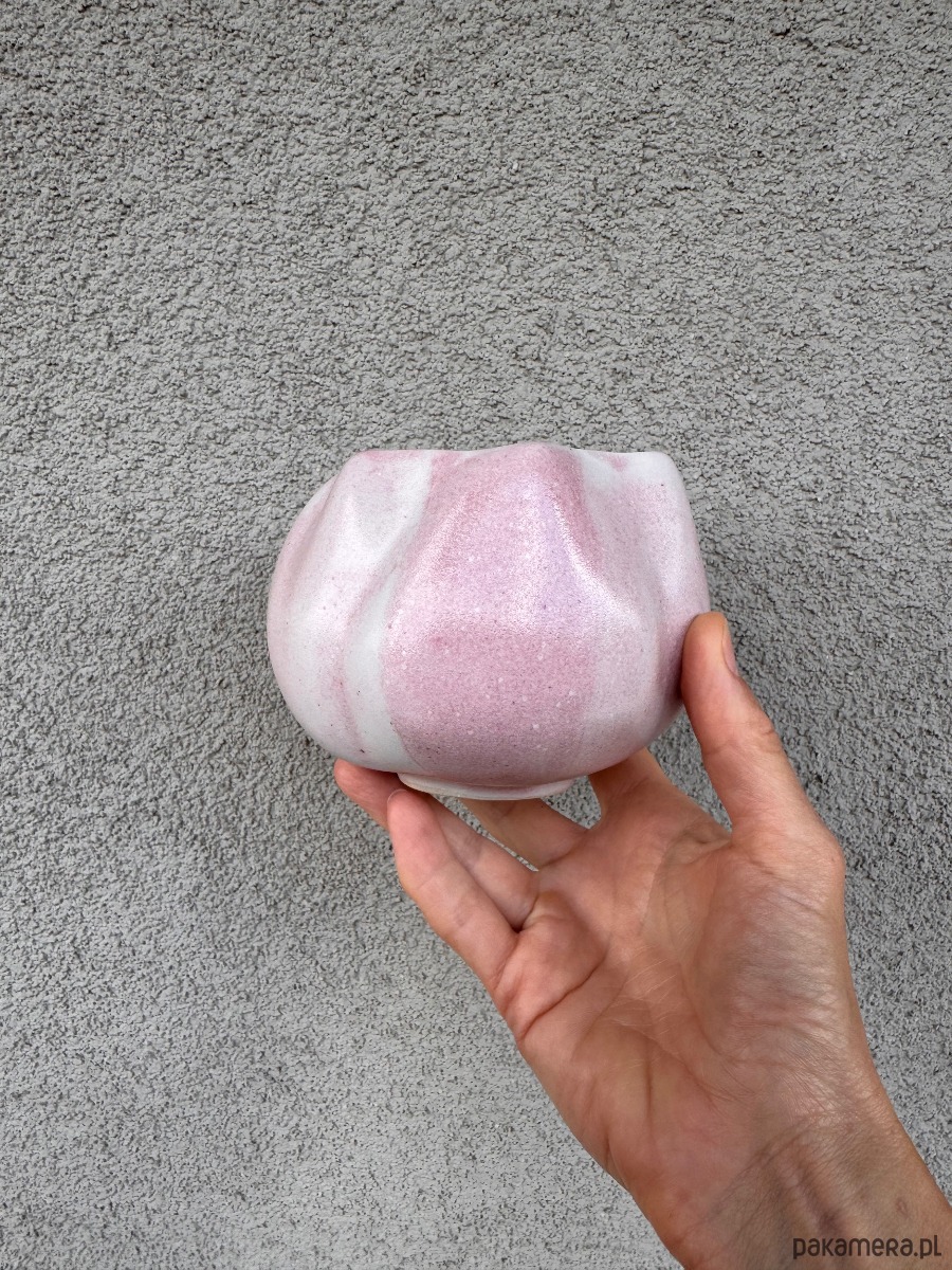 Duża asymetryczna czarka na herbatę inspirowana kwiatem lotosu. Pojemność 500ml gwarantuje porządną ilość naparu w jej wnętrzu. Od ciebie zależy czy zaparzysz tam jerbę, imbir czy dziką różę. Możesz też włożyć do niej waciki, pianki lub biżuterię by zrobić z niej dekorację twojej toaletki i móc patrzeć na nią codziennie:) Czarka pokryta jest efektowym( czyli niejednorodnym, z efektami smug i przetarć) różowo kremowym szkliwem, odpowiednim do mycia w zmywarce.