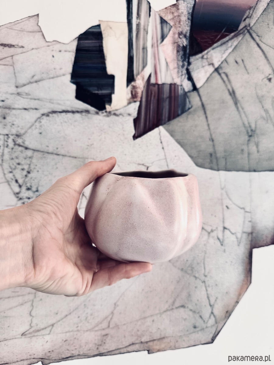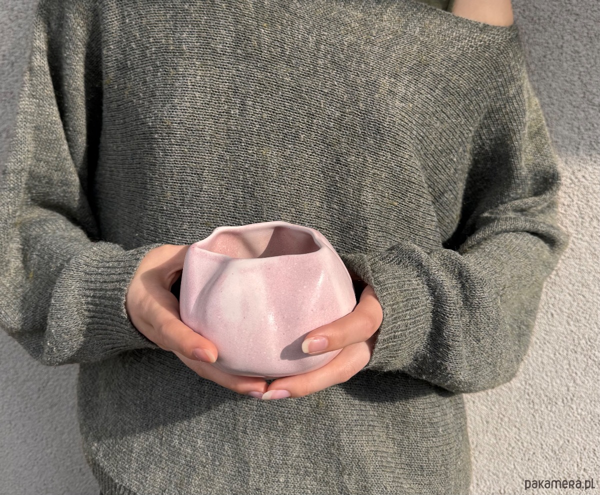 Duża asymetryczna czarka na herbatę inspirowana kwiatem lotosu. Pojemność 500ml gwarantuje porządną ilość naparu w jej wnętrzu. Od ciebie zależy czy zaparzysz tam jerbę, imbir czy dziką różę. Możesz też włożyć do niej waciki, pianki lub biżuterię by zrobić z niej dekorację twojej toaletki i móc patrzeć na nią codziennie:) Czarka pokryta jest efektowym( czyli niejednorodnym, z efektami smug i przetarć) różowo kremowym szkliwem, odpowiednim do mycia w zmywarce.