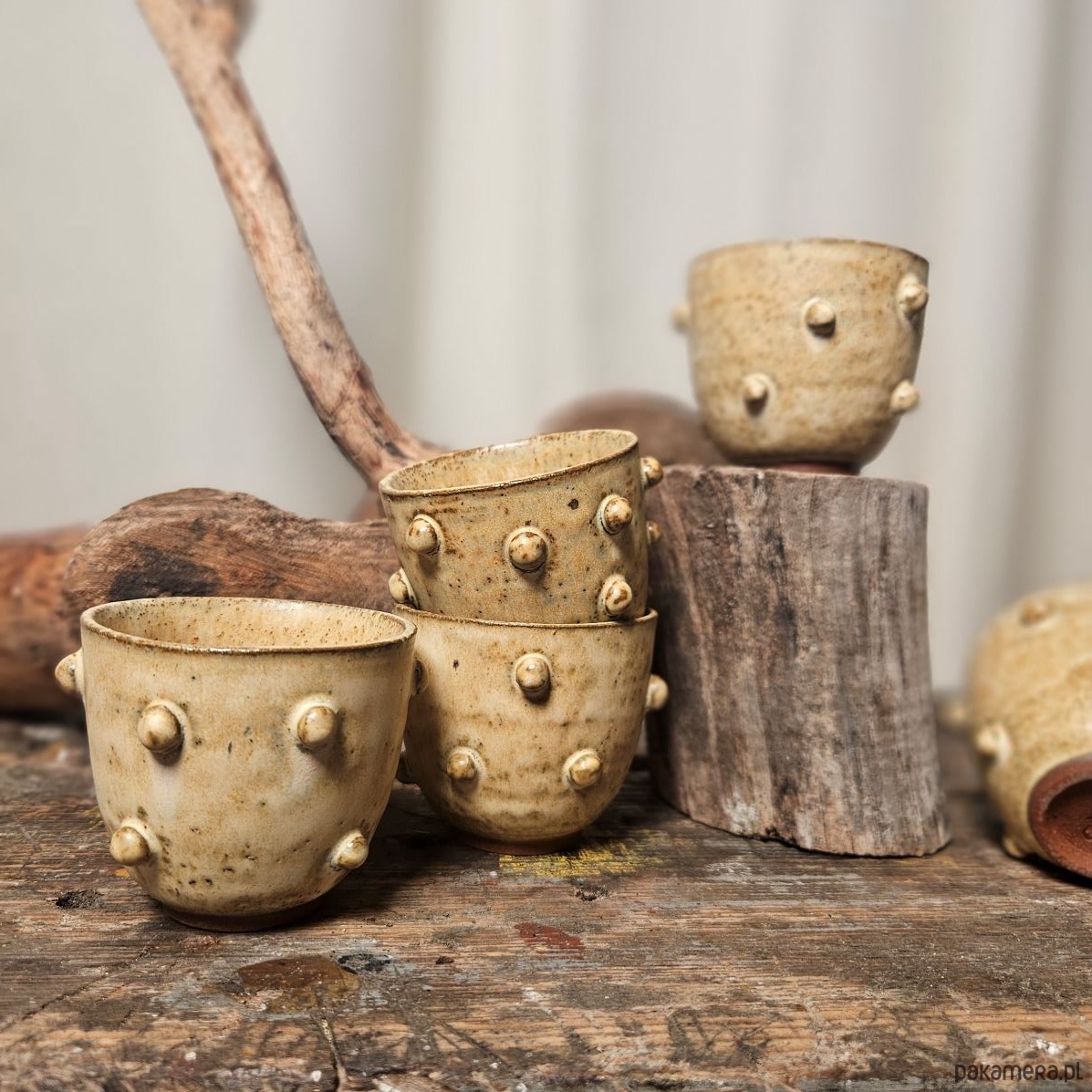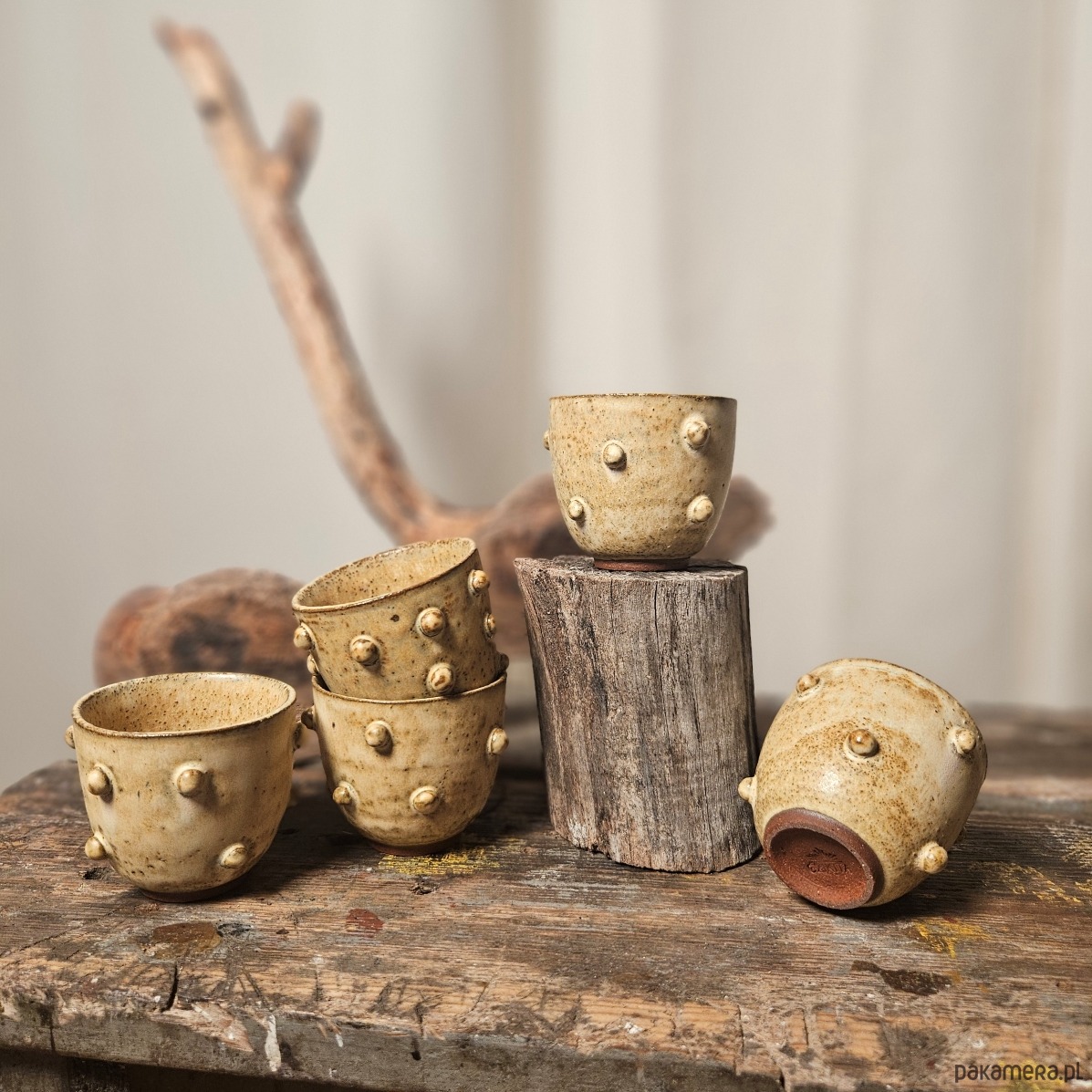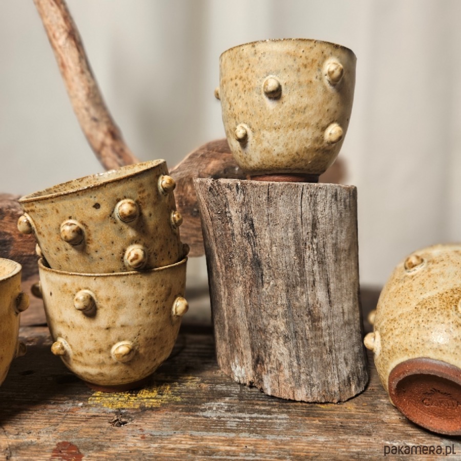 Mała czarka na stopce, ozdobiona drobnymi kuleczkami i pokryta satynowym szkliwem w odcieniach beżu i kości słoniowej. Szkliwo posiada nierówności i przetarcia nadające czarkom rustykalny, surowy charakter.