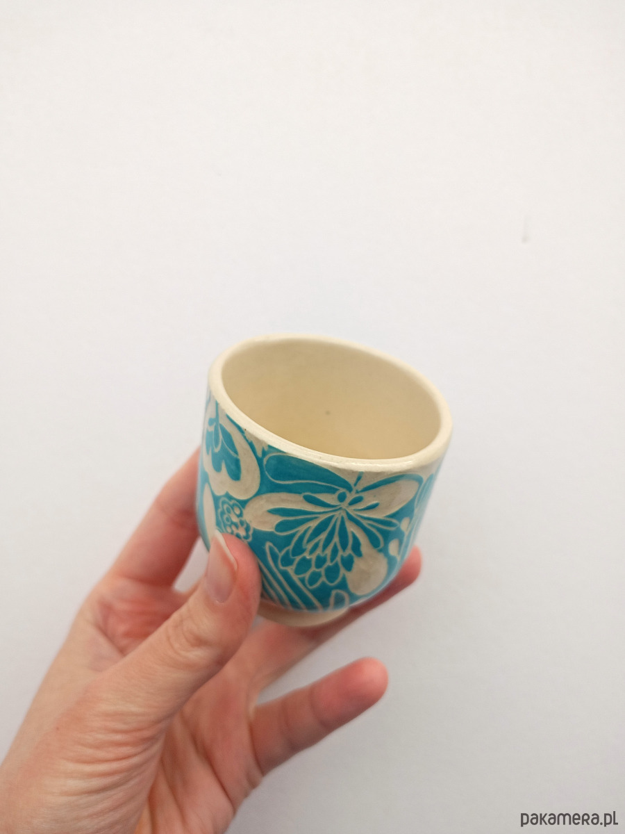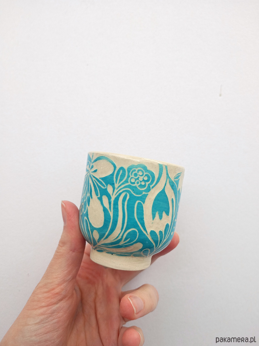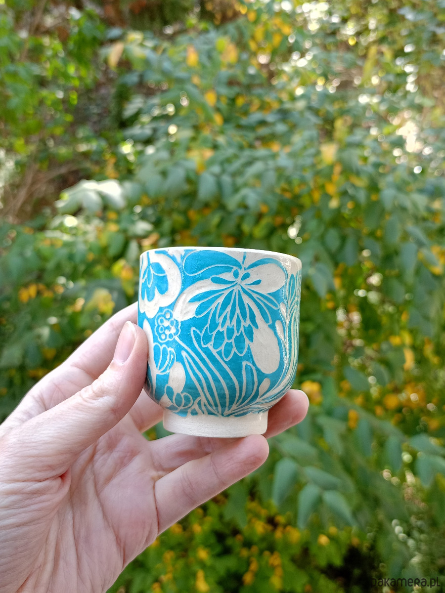 Wykonana w technice sgraffito - wzór jest ręcznie wyryty na czarce przez co jest niepowtarzalny!