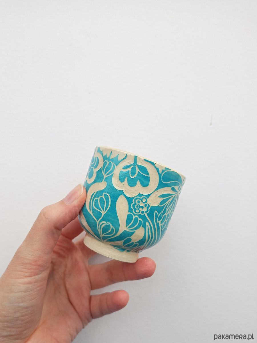 Ceramiczna czarka ozdobiona turkusowym roślinnym wzorem.