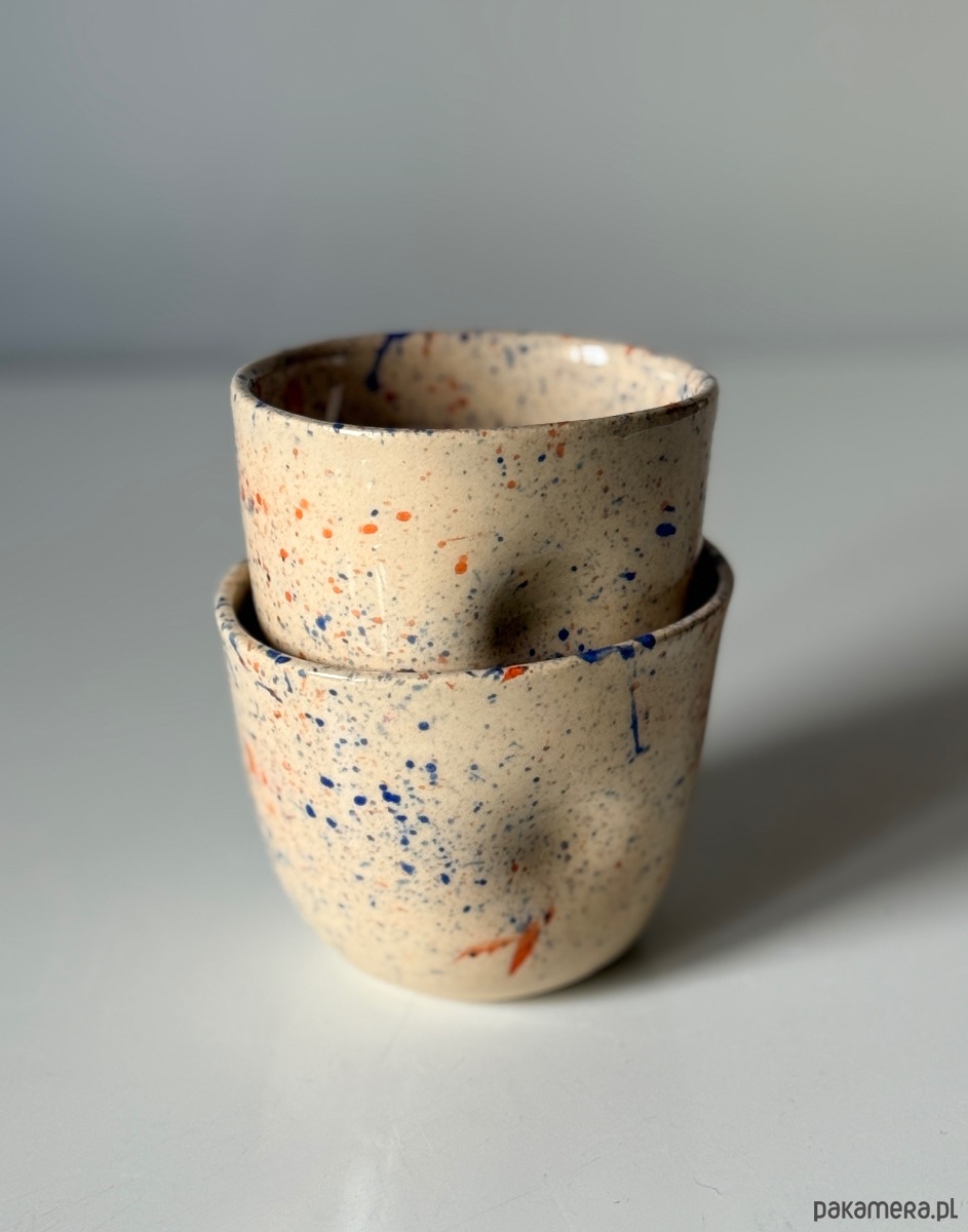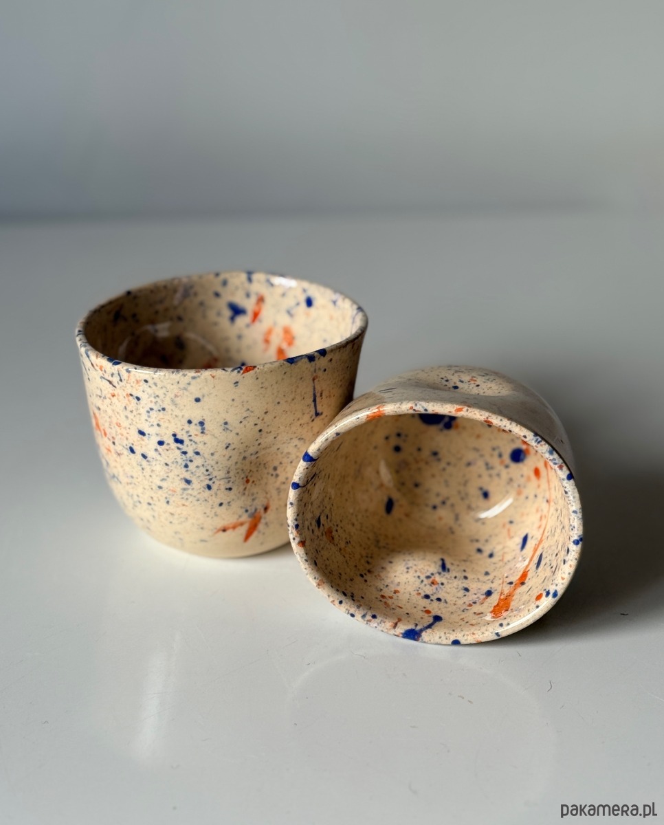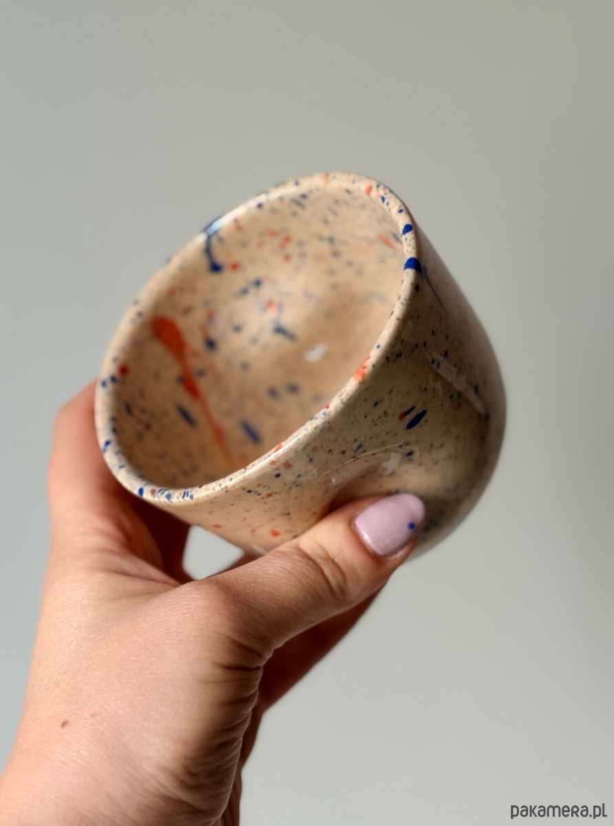 Ręcznie wykonana czarka, z wgłębieniami na palce. Stworzona na kole garncarskim z jasnej gliny w abstrakcyjny kolorowy wzór.