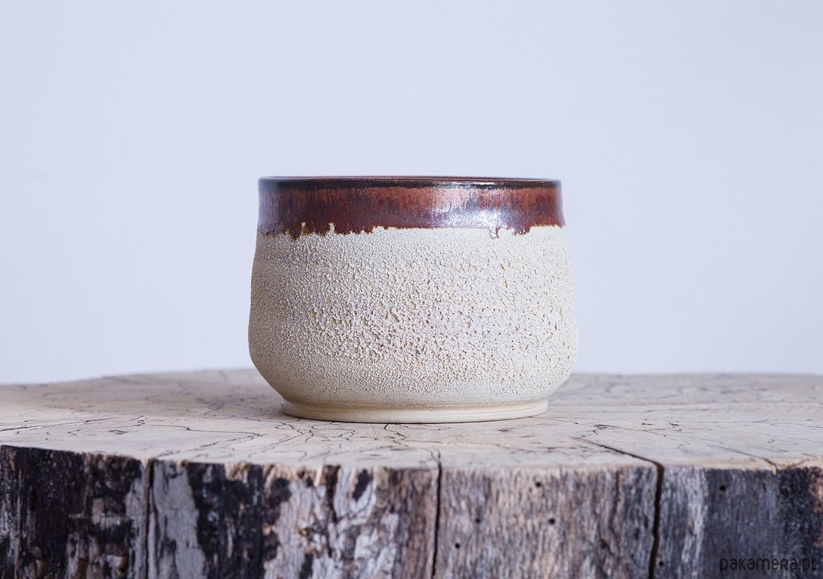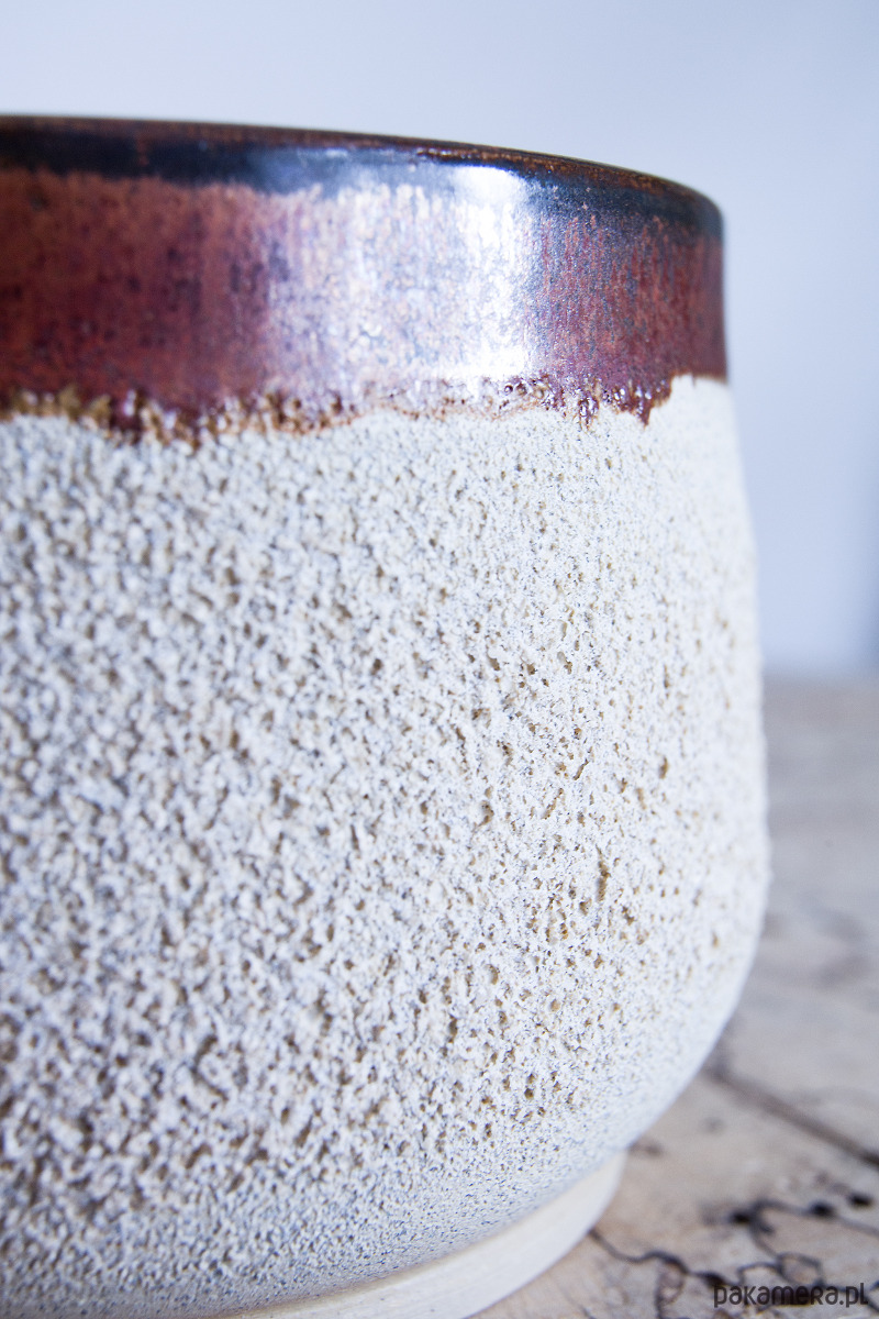 szkliwiona wewnątrz pięknym szkliwem o barwie starej miedzi a na zewnątrz unikatowym szkliwem z fakturą lawy. ciekawa faktura lawy przykuwa wzrok i sprawia że przyjemnie leży w dłoni.