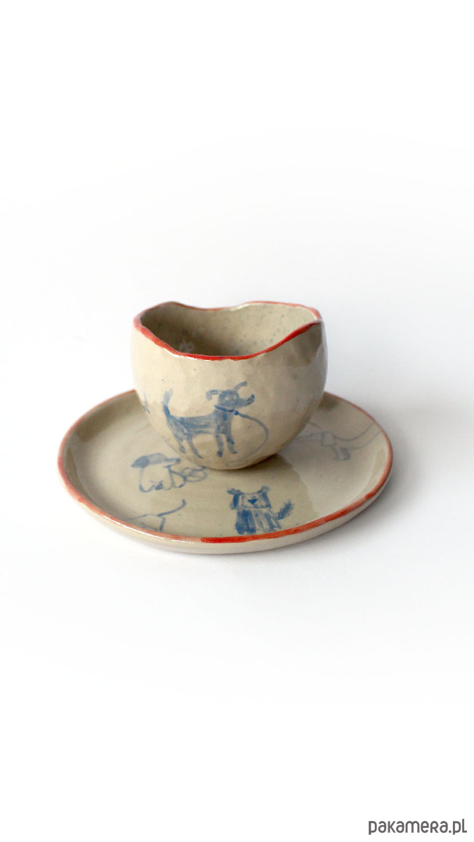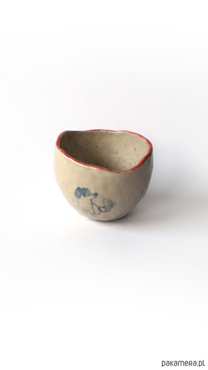 Czarka z ręcznie malowanym motywem piesków - farbami podszkliwnymi w kolorze niebieskim i rant w kolorze czerwonym. Czarka ręcznie lepiona metodą pinch pot- nieregularna krawędź oraz widoczne slady odciskania typowe dla metody. Wykonana w małej krakowskiej pracowni ceramicznej. Zastosowano wysokiej jakości kremową glinę kamionkową, 100% handmade. Sygnowana. Zastosowane szkliwo nadaje się do kontaktu z żywnością. Czarkę można myć w zmywarce.