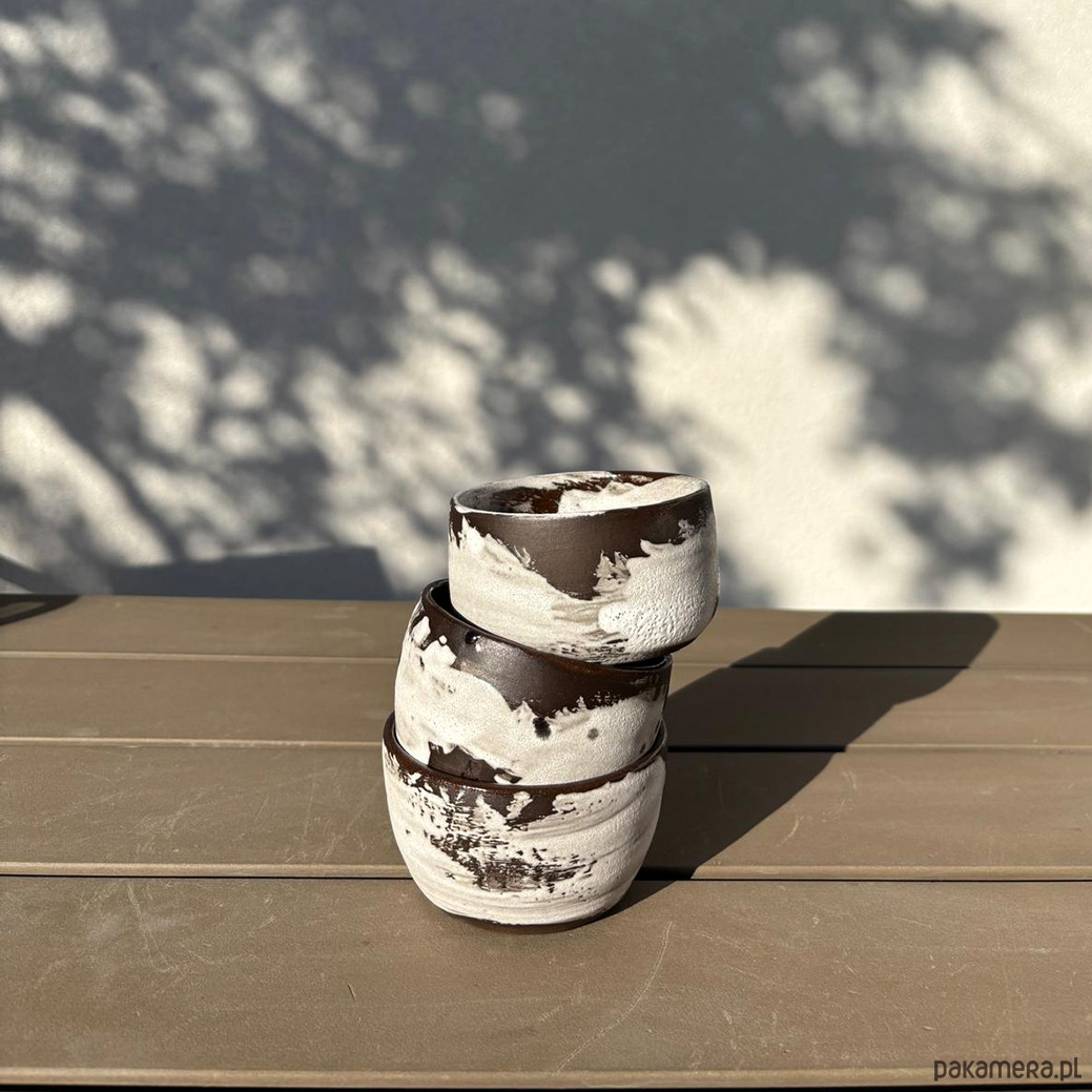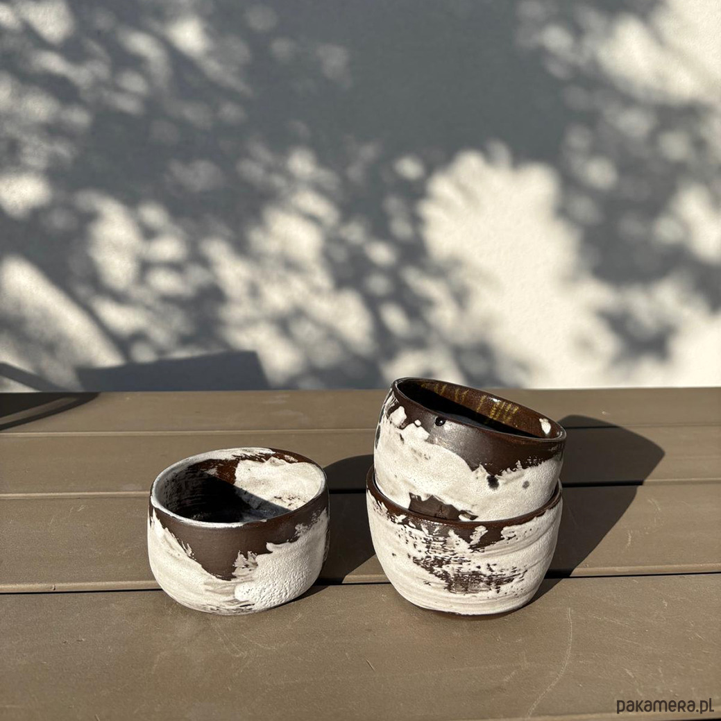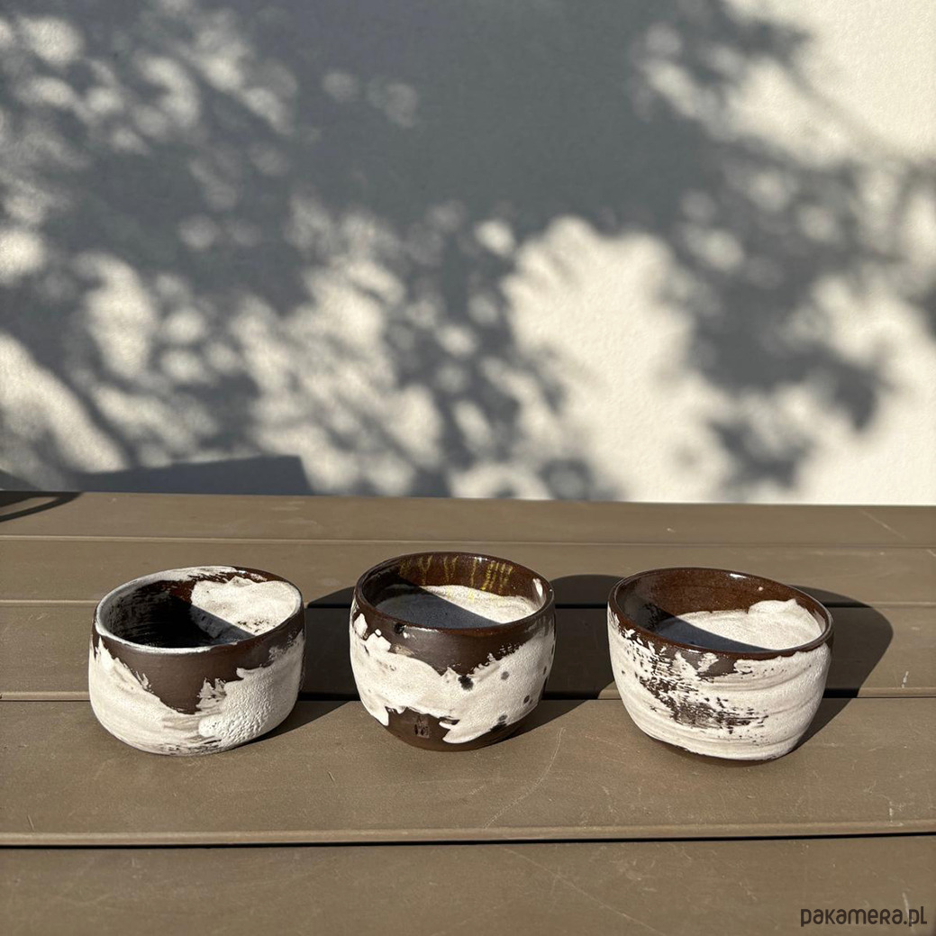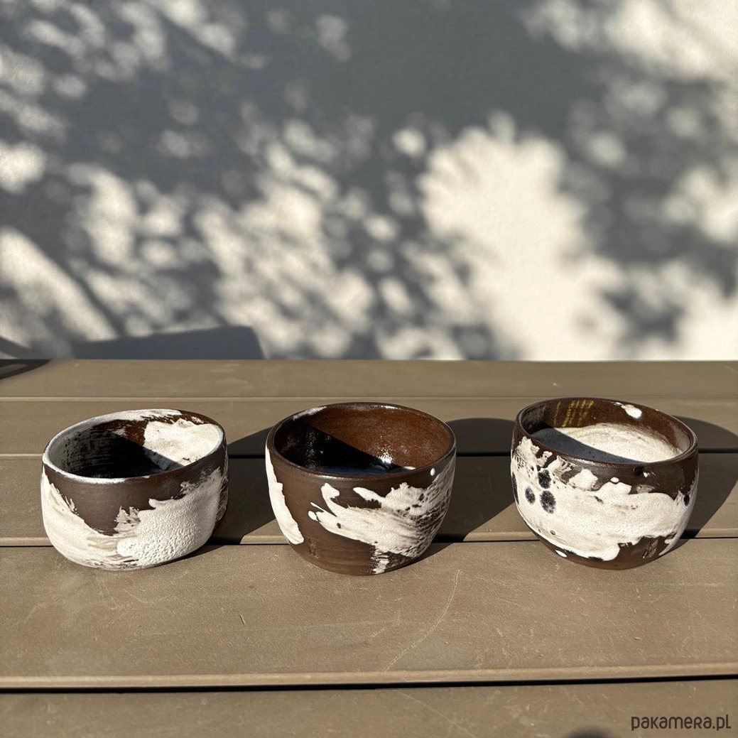 Ciemnobrązowe czarki lepione na kole z brązowej gliny. Malowane pędzlem, surowe w formie i strukturze.