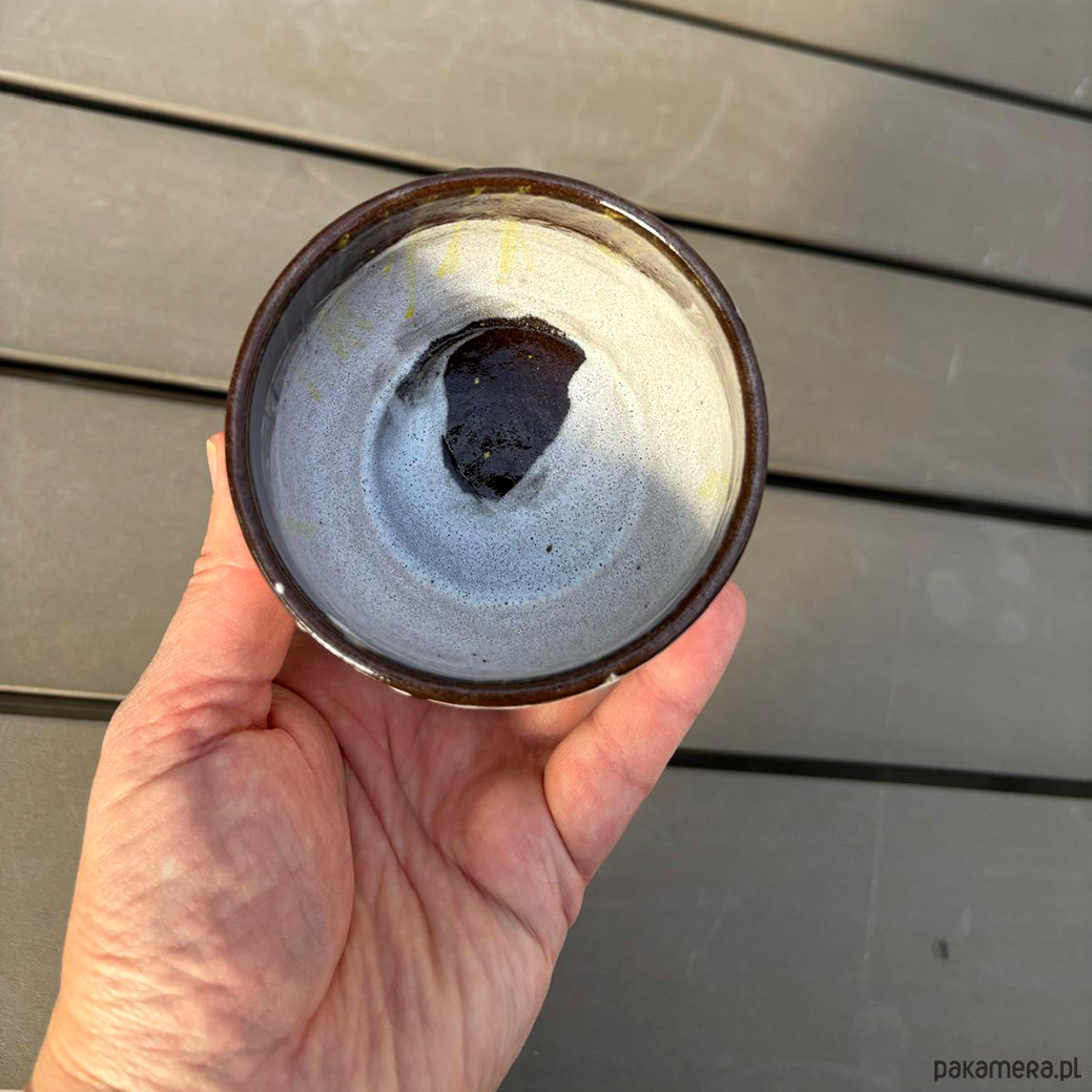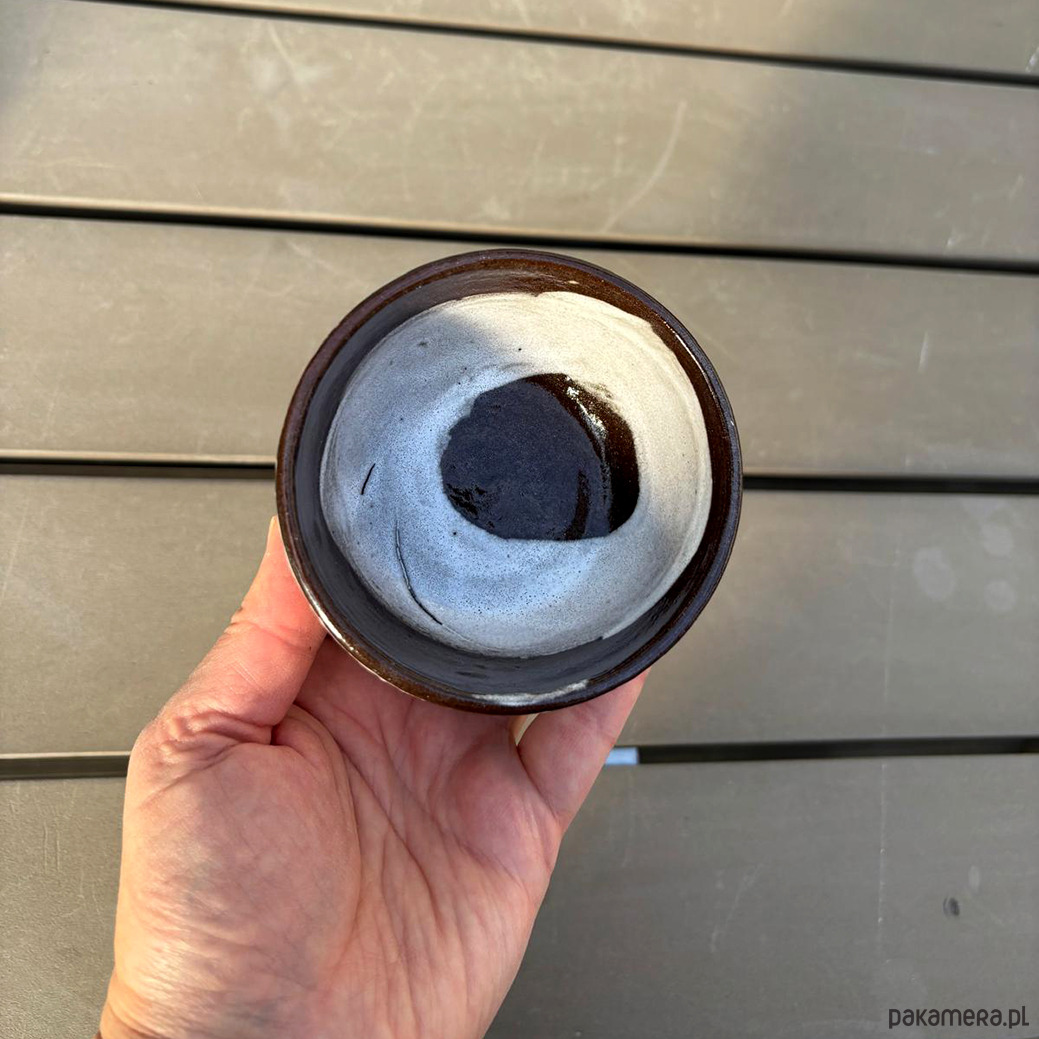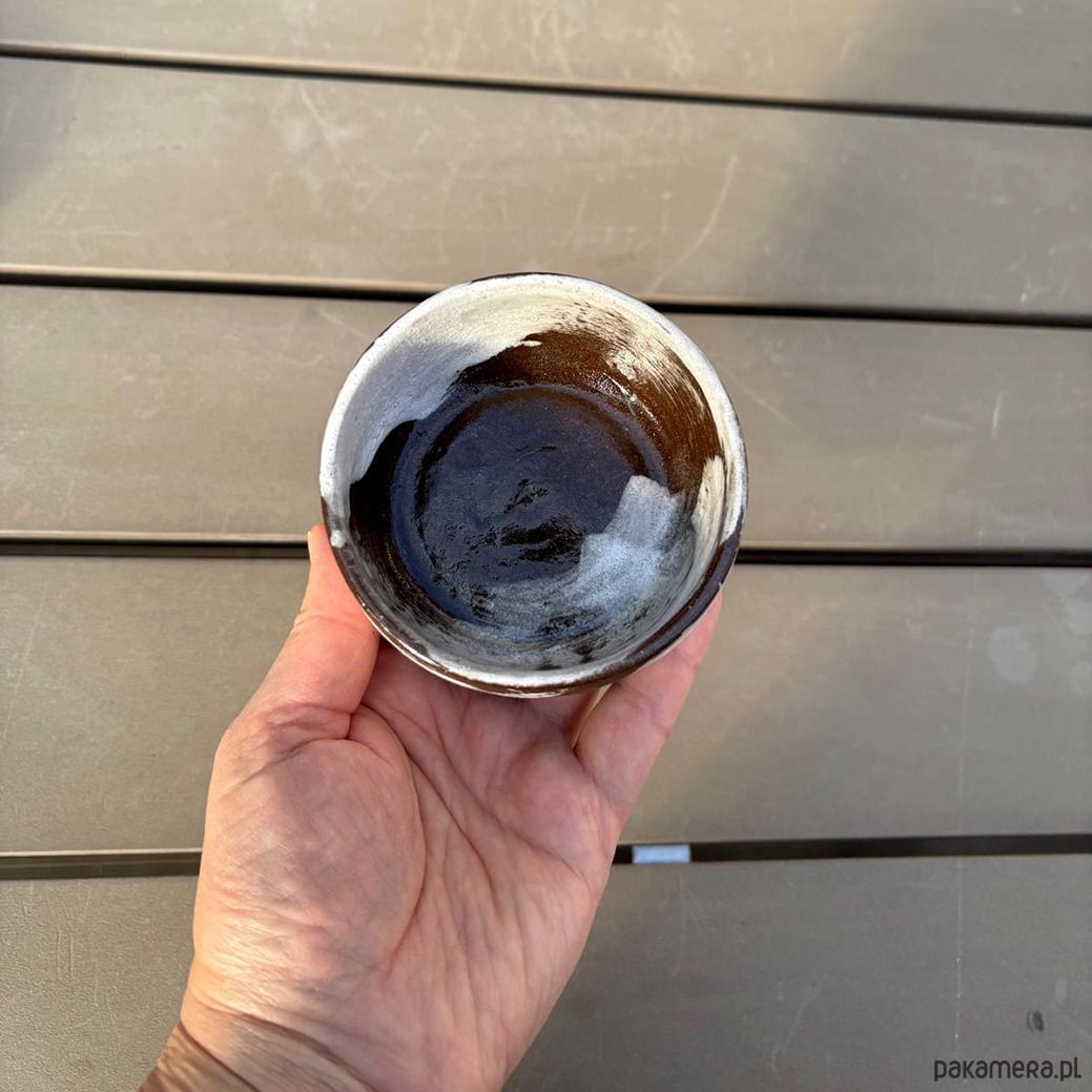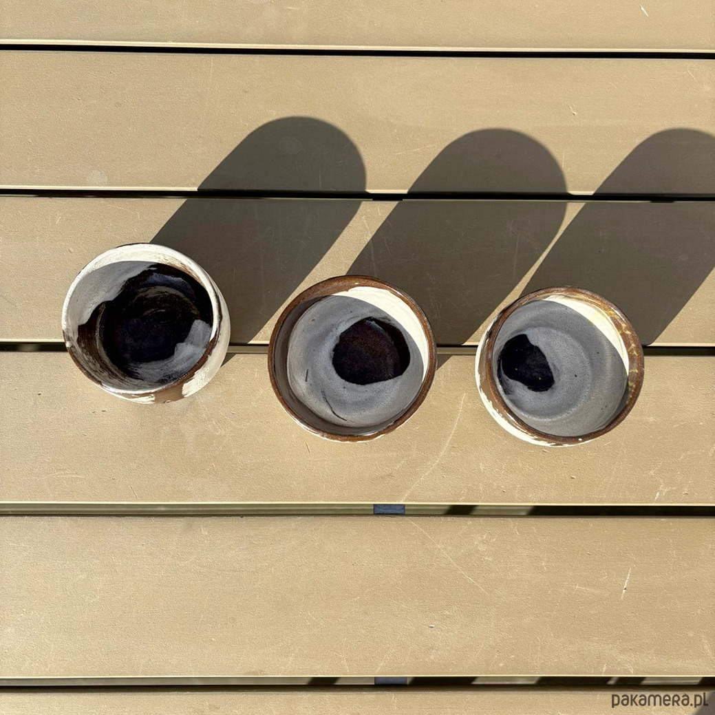 Ciemnobrązowe czarki lepione na kole z brązowej gliny. Malowane pędzlem, surowe w formie i strukturze.