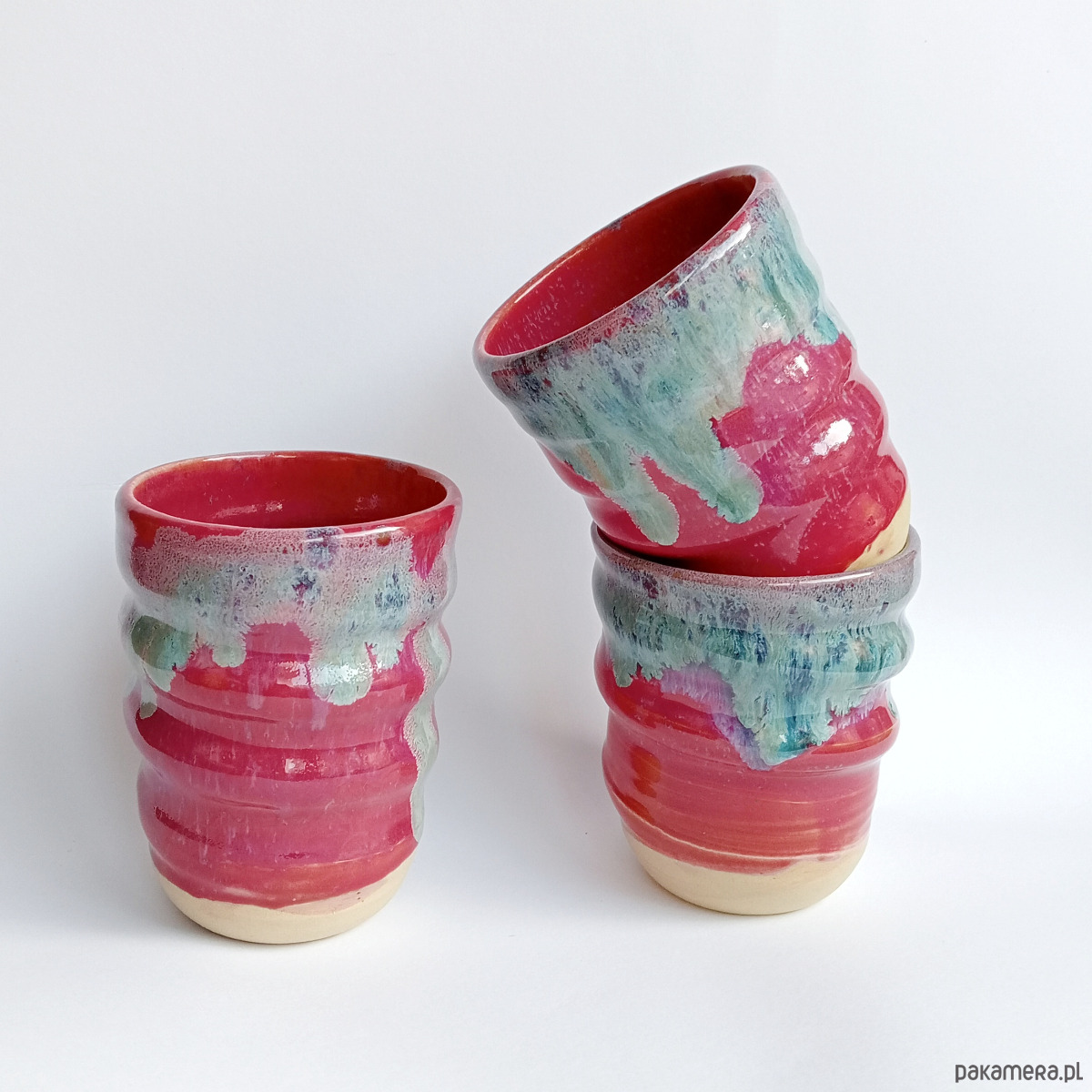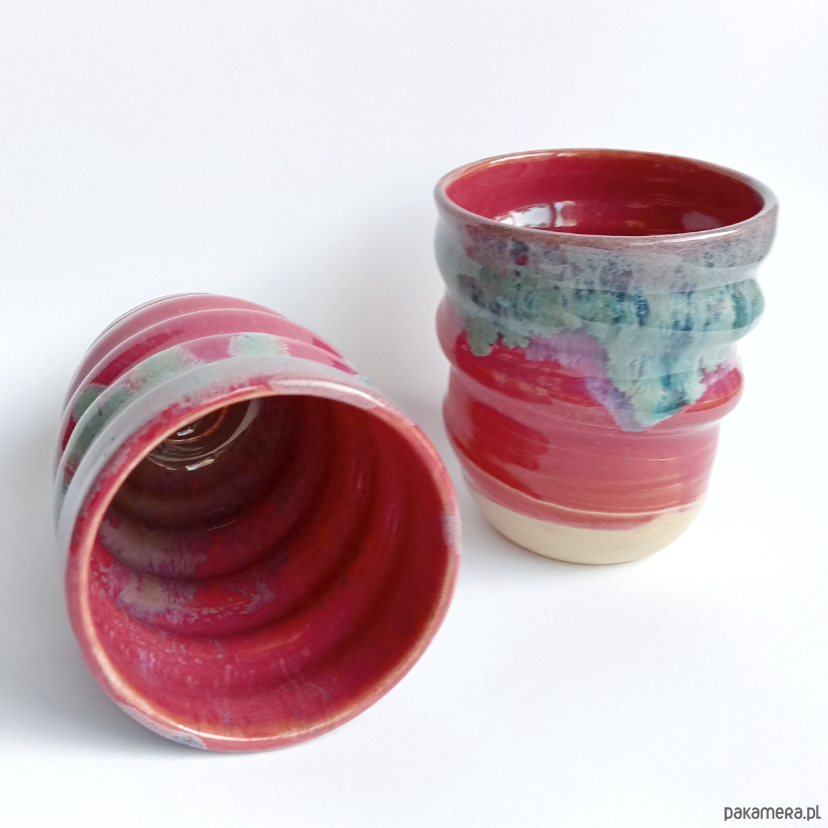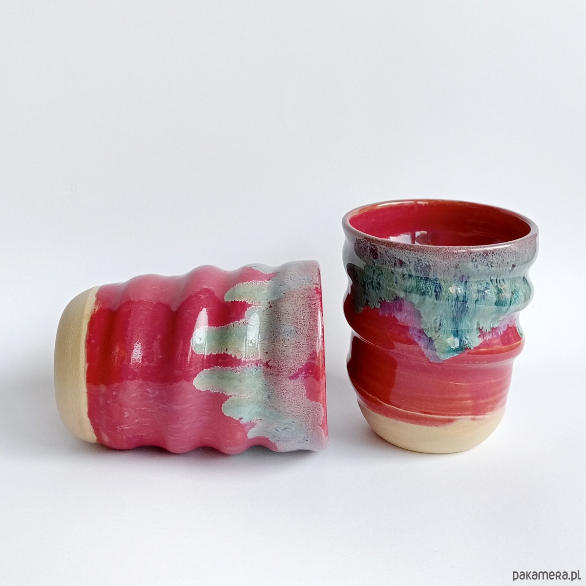Zakręcone czarki szkliwione intensywnym, różowym szkliwem z wtrąceniami z uroczą, niebieskawą "polewą" wokół brzegu.