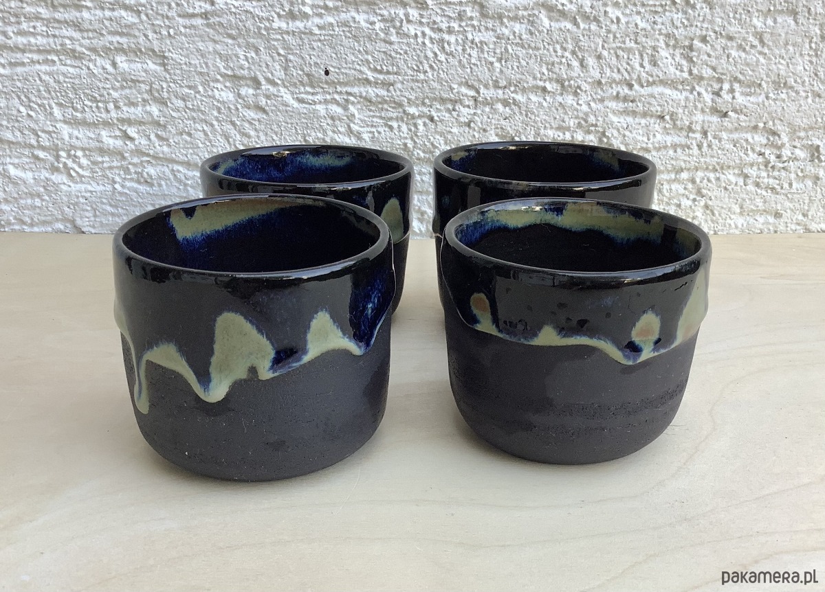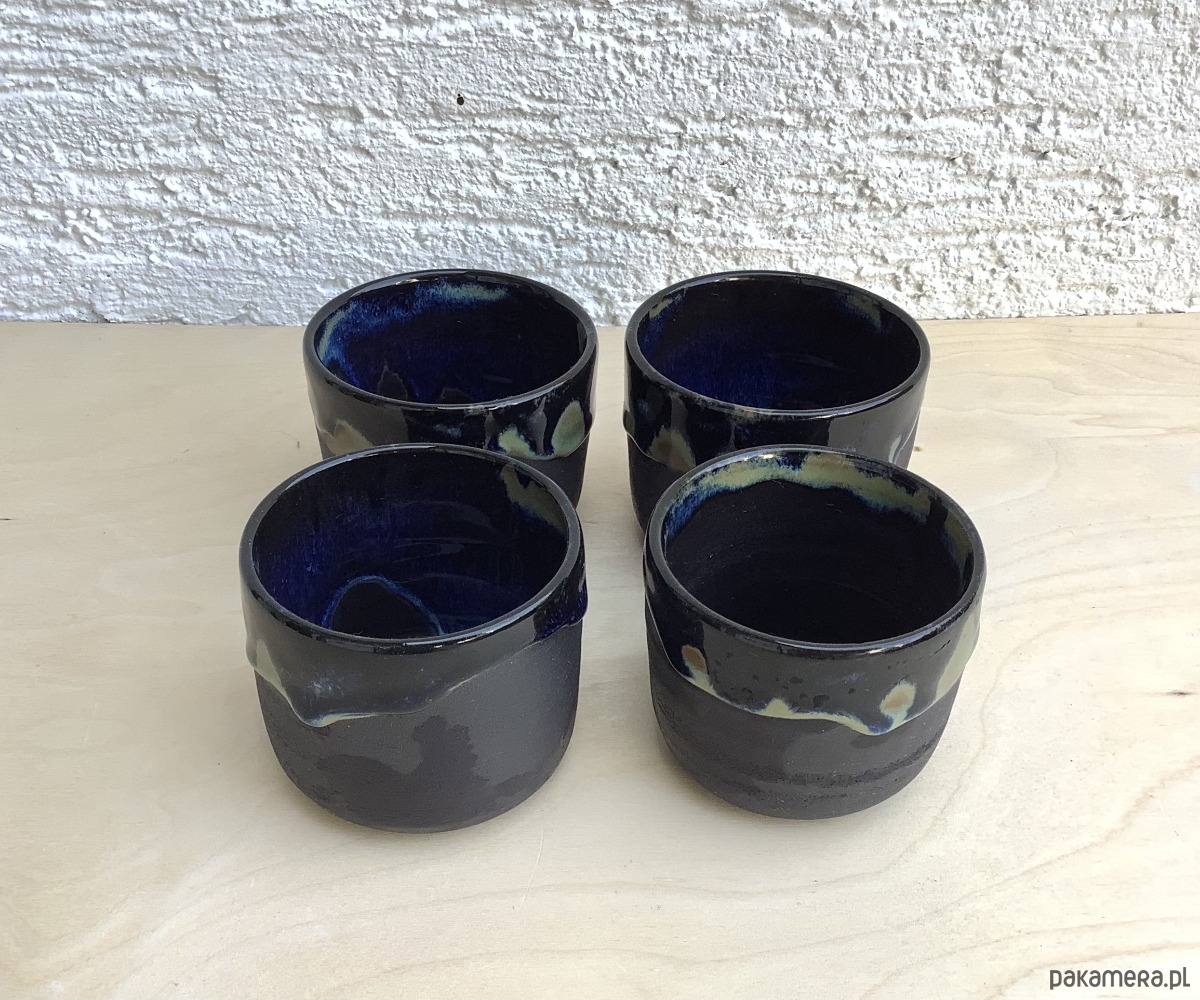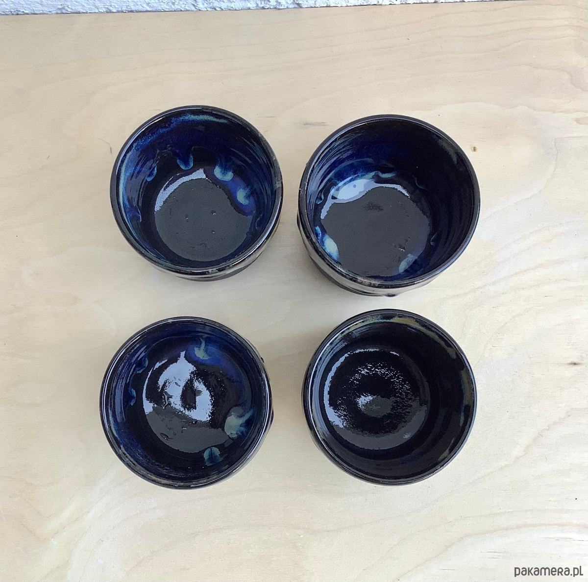 4 czarki. Każda trochę inna, każda wyjątkowa. Wytoczone na kole z czarnej gliny. Szkliwione w środku i częściowo na zewnątrz błyszczącym niebiesko-błękitnym, granatowym i zielonym szkliwem.
