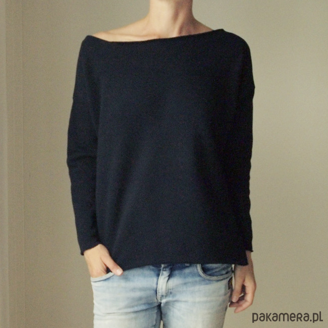 Dekolt w łódkę, zwężane rękawy, krawędzie cięte, bez podszywania (wychodzące nitki ;))