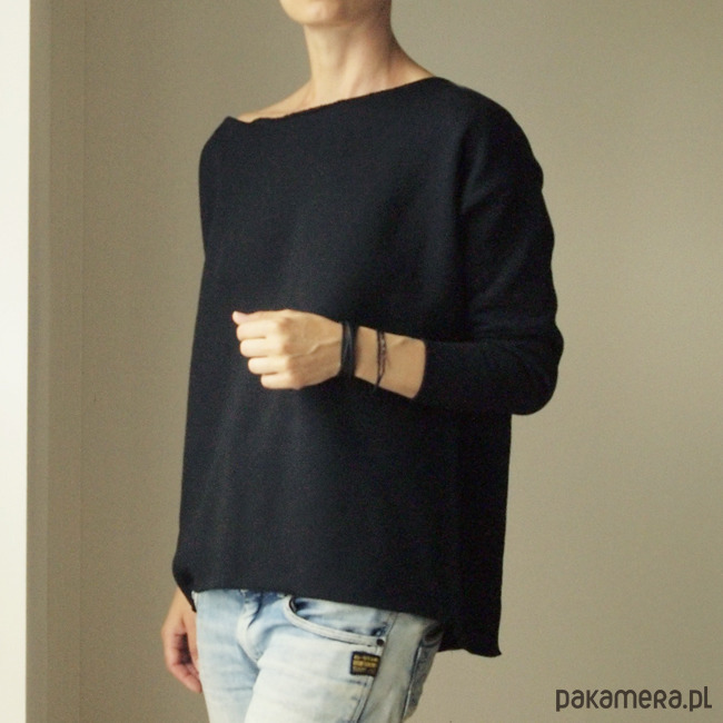Dekolt w łódkę, zwężane rękawy, krawędzie cięte, bez podszywania (wychodzące nitki ;))