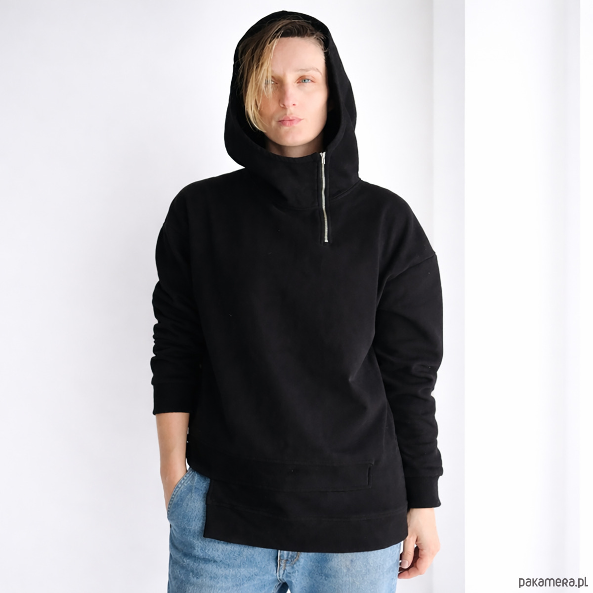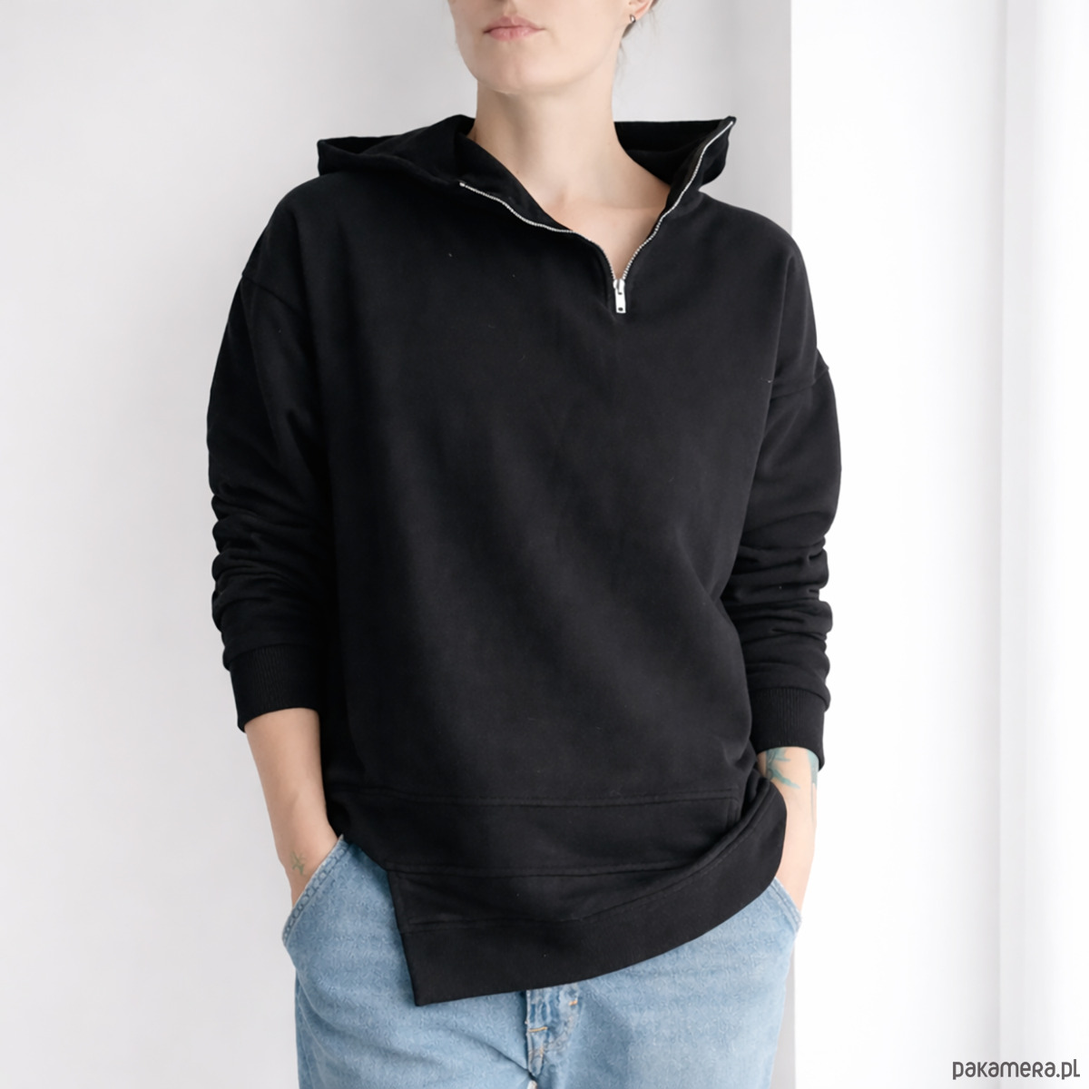 Asymetryczny dół z podwójnym przeszyciem po jednej stronie i krótszym wycięciem po drugiej nadaje jej nierówną, ciekawą linię. Do tego suwak przesunięty na bok i osadzony wysoko kaptur, który mocno zaznacza górę bluzy.