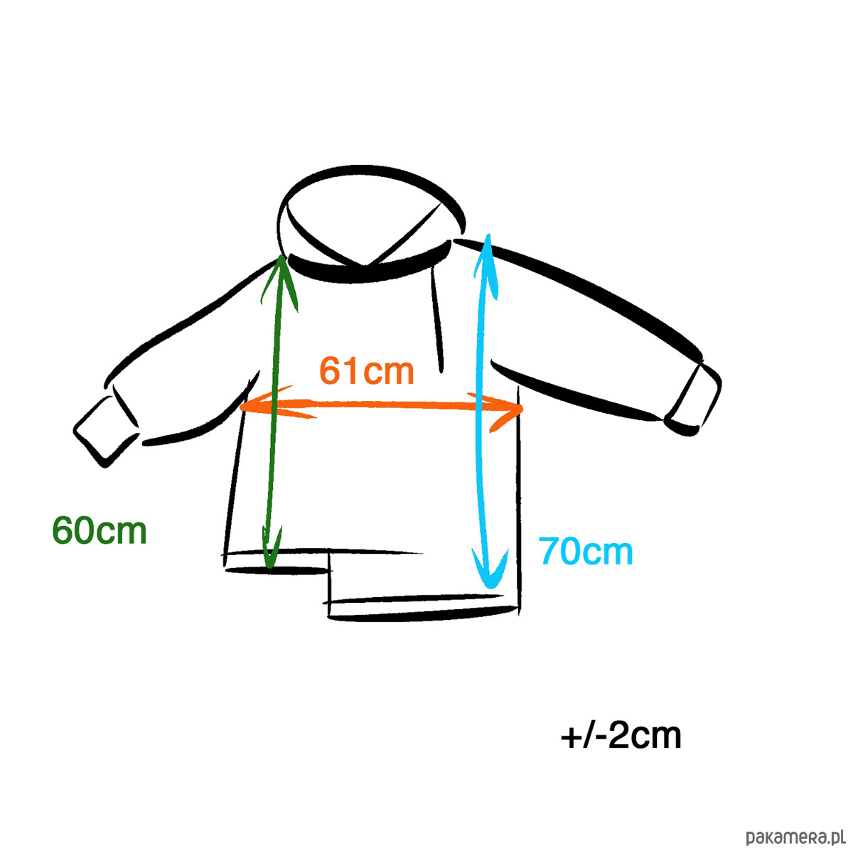 Jeden rozmiar, pokazany na rysunku. Długość od ramienia 135cm, szerokość pod pachami 66cm, wysokość wycięcia: 45cm.