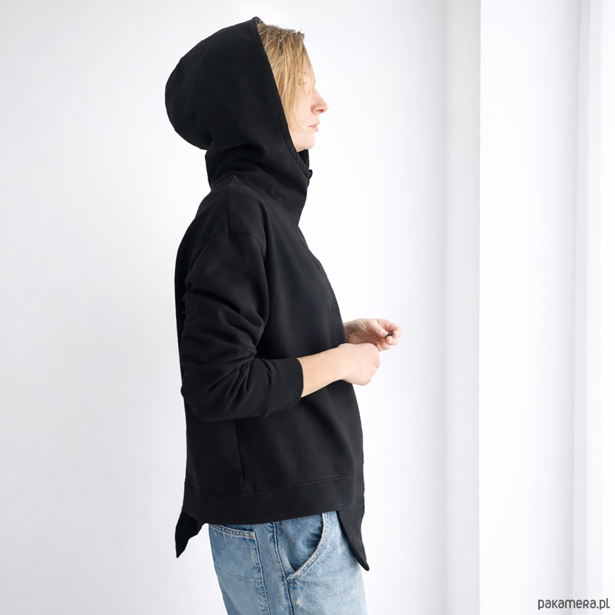 Czarna bluza oversize z kapturem i asymetrycznym dołem uszyta z grubej dresówki.