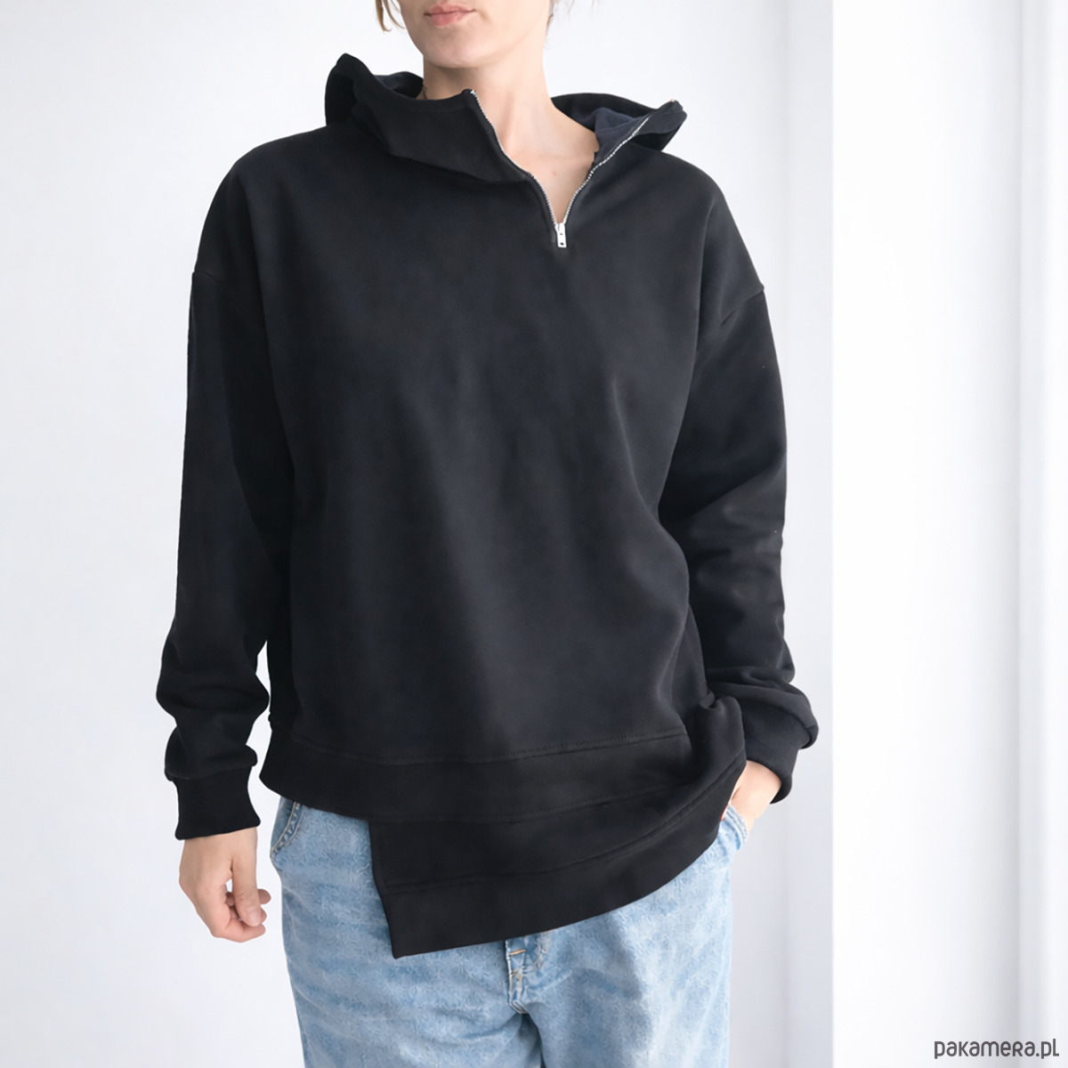 Czarna bluza oversize z kapturem i asymetrycznym dołem