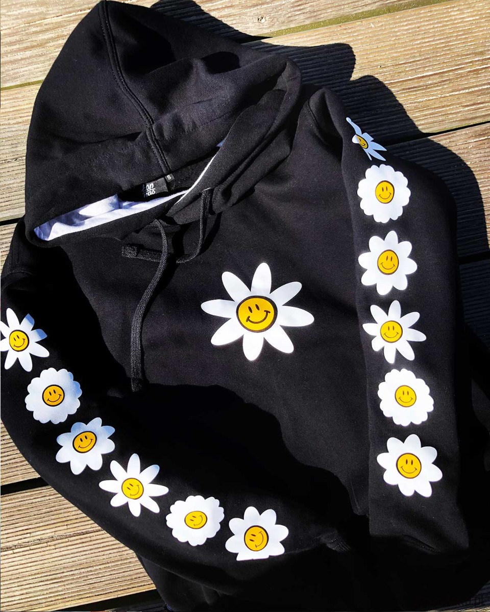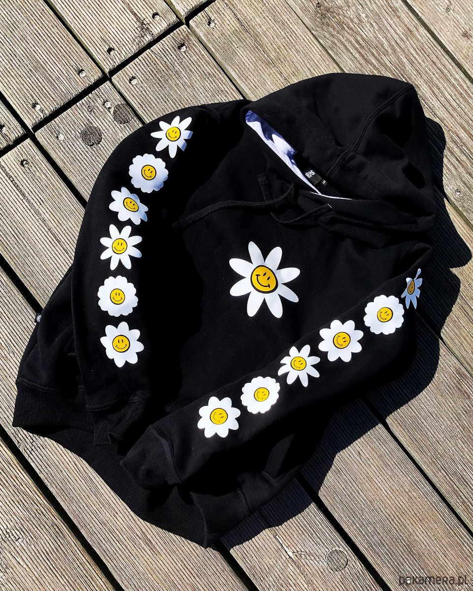 Czarna bluza z kapturem damska oversize z kwiatkami na rękawach i większym kwiatkiem na przodzie bluzy. Tył gładki. Czarna bluza damska z nadrukiem , kapturem i kieszeniami jest uszyta z wysokogatunkowej bawełny z certfikatami oeko-tex , krój jest luźny oversizowy jeżeli jednak nie lubisz kroju oversize zamów mniejszy rozmiar niz nosisz. Bluza jest gruba i mięsista ,