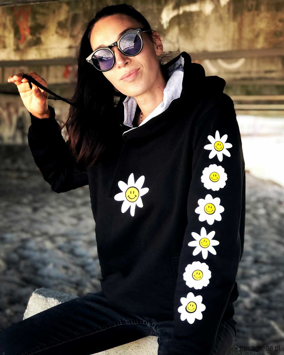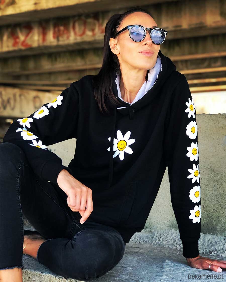 Czarna bluza z kapturem damska oversize z kwiatkami na rękawach