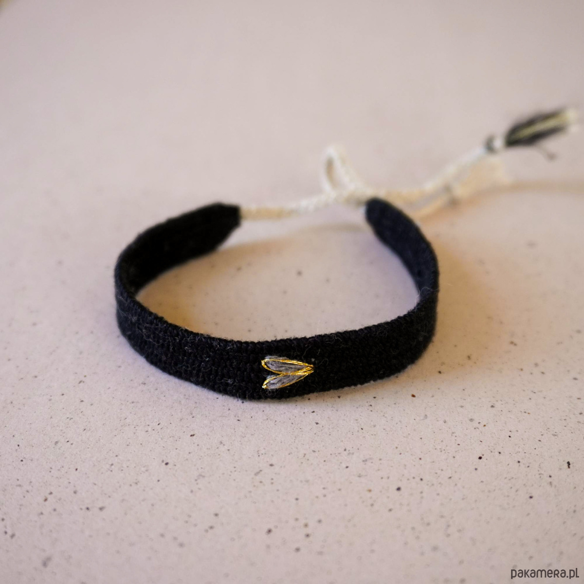 Czarna bransoletka z haftowanym serduszkiem, wiązna