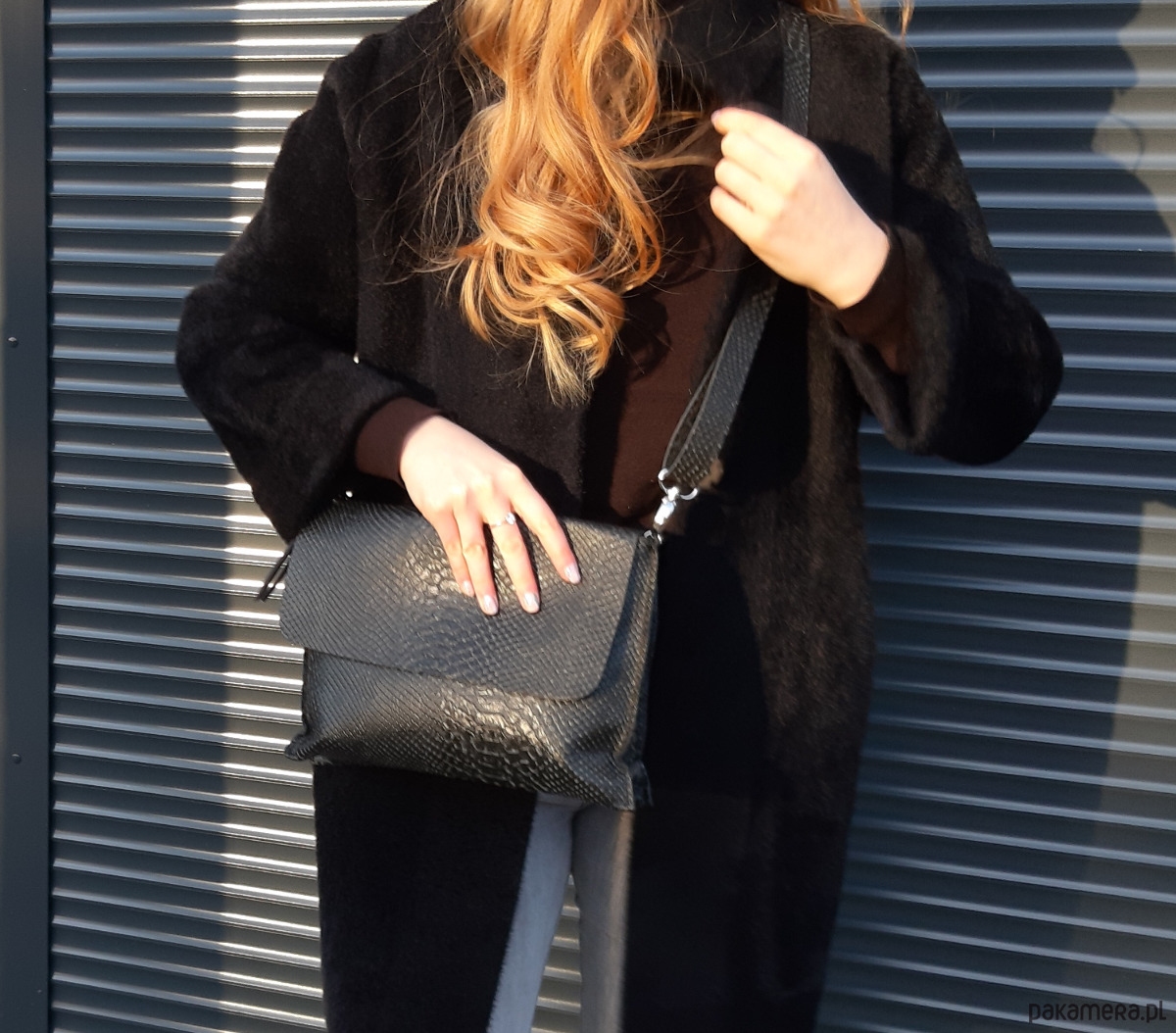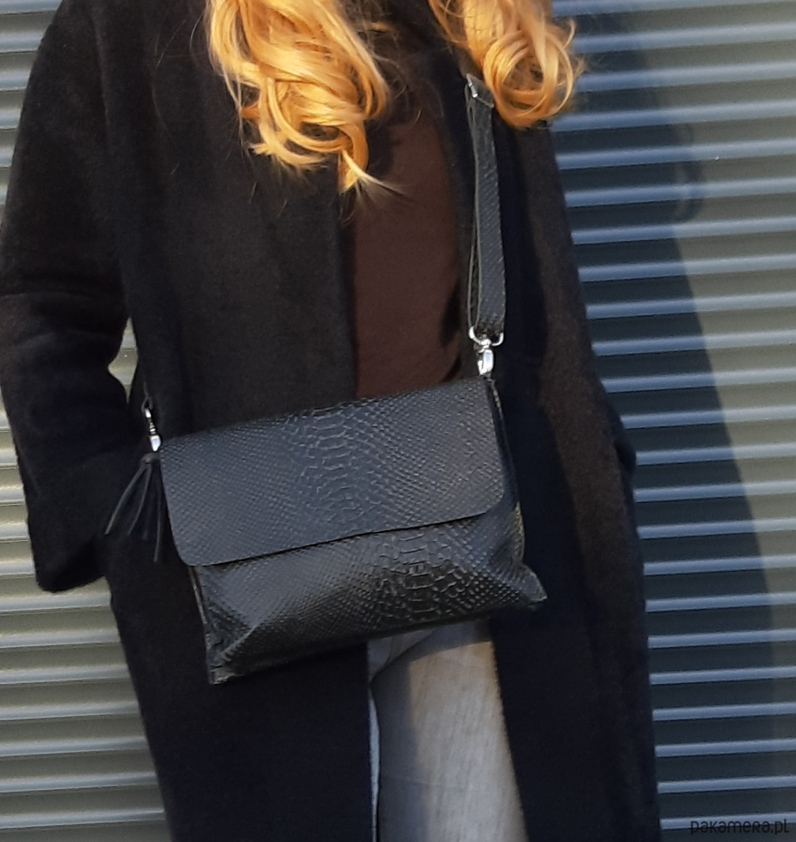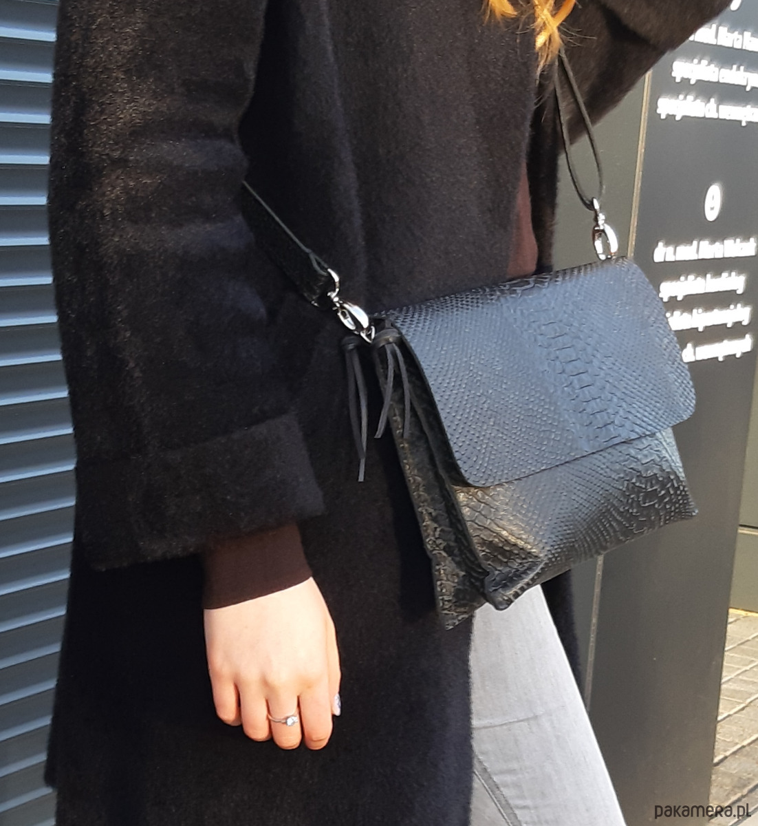 Torba posiada długi regulowany pasek - można nosić na skos, można tradycyjnie na ramieniu. Klapka swobodnie opada do połowy przodu torebki.