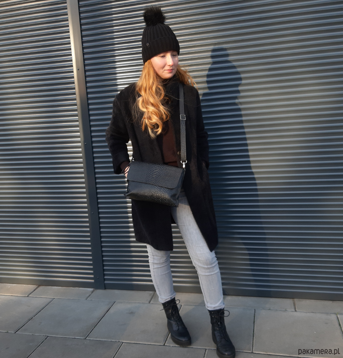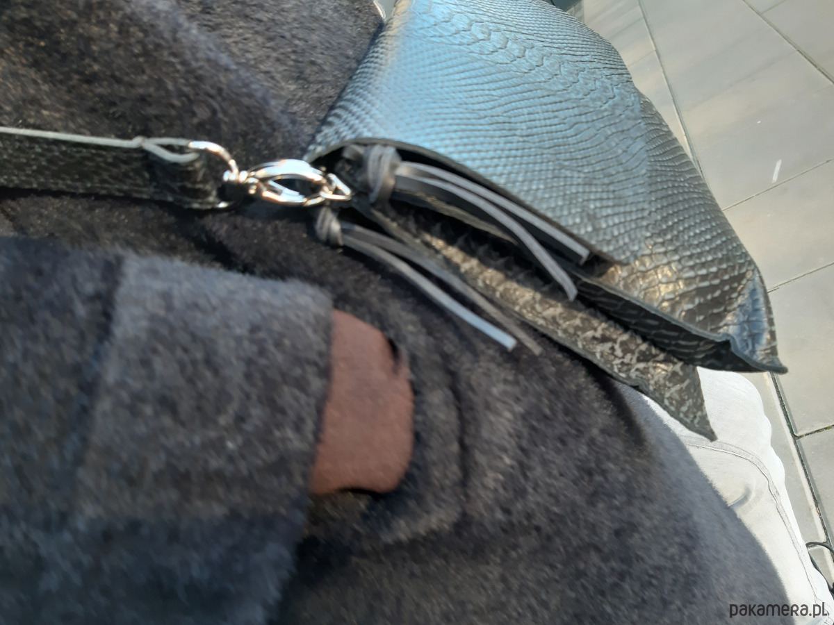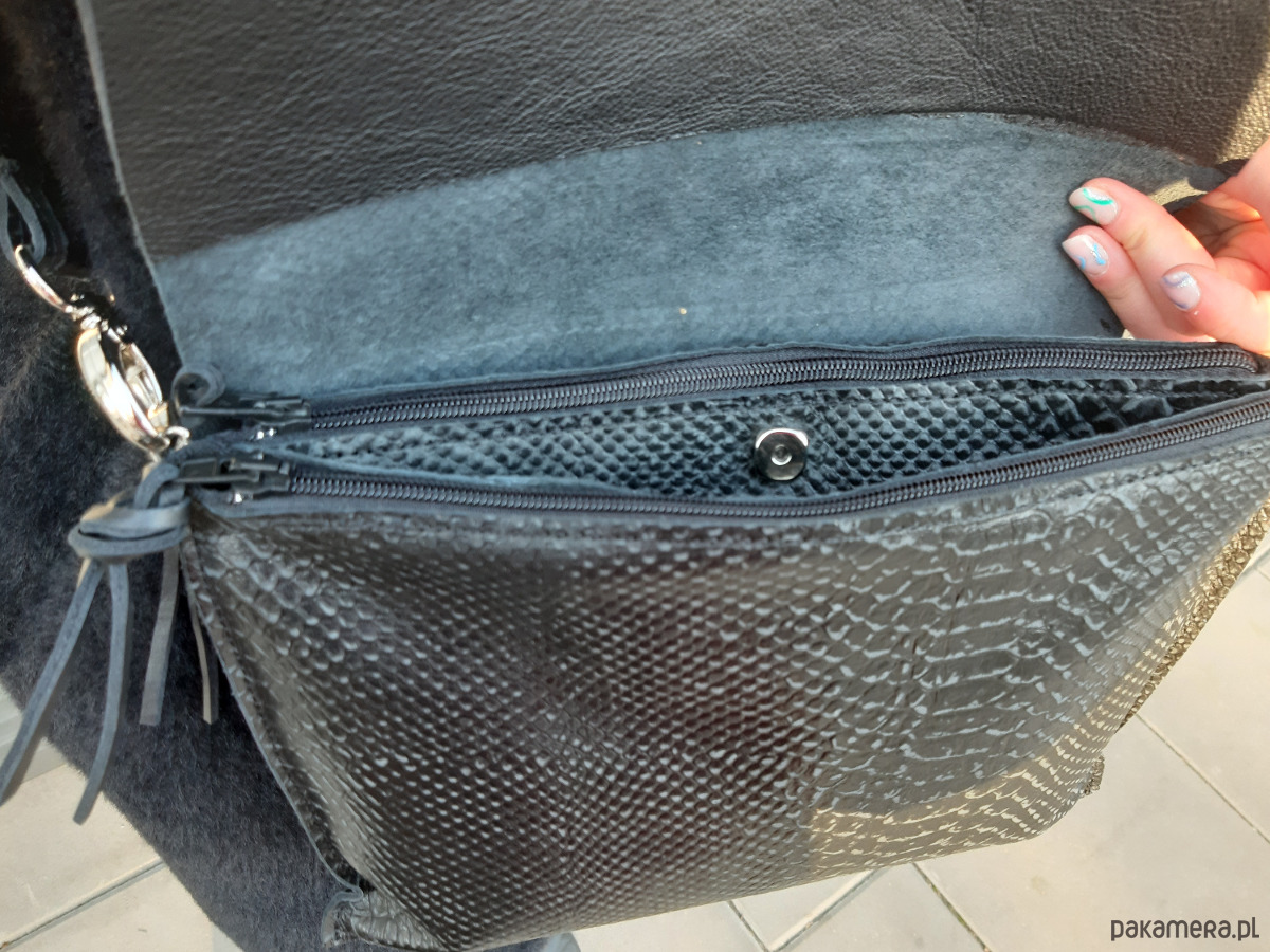Torba posiada długi regulowany pasek - można nosić na skos, można tradycyjnie na ramieniu. Klapka swobodnie opada do połowy przodu torebki.