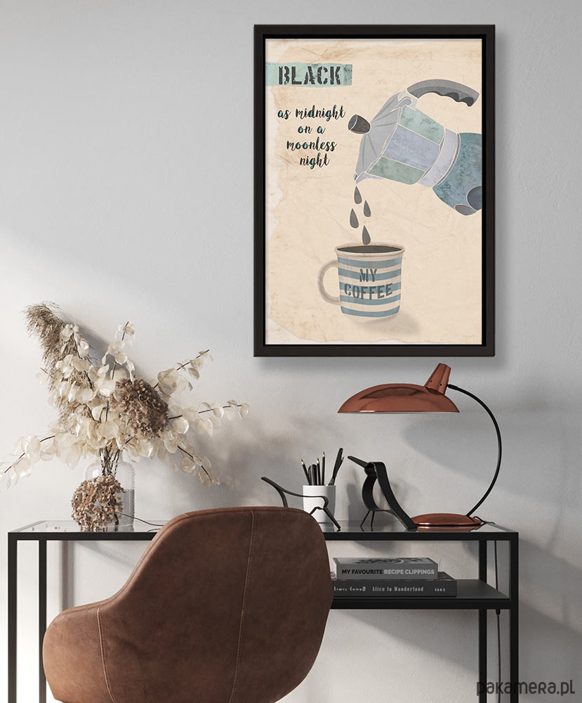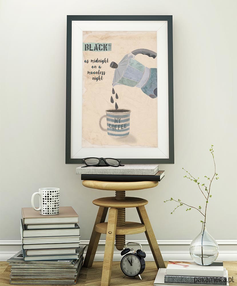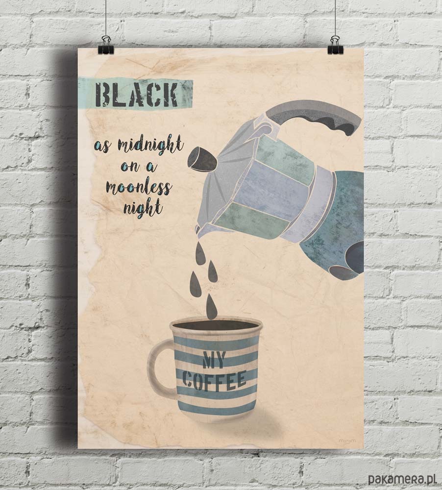 Plakat w stylu vintage dla wszystkich, którzy nie wyobrażają sobie dnia bez kawy. Na kubku, do którego nalewana jest kawa z kawiarki widnieje cytat z kultowego serialu Twin Peaks, mówiący o tym, że kawa powinna być czarna, jak niebo o północy, w bezksiężycową noc.