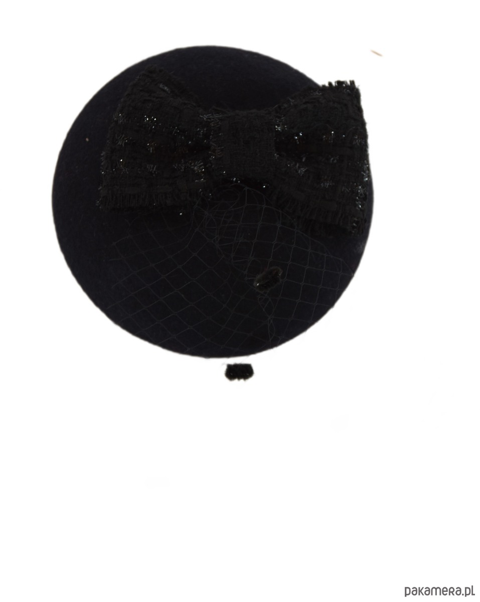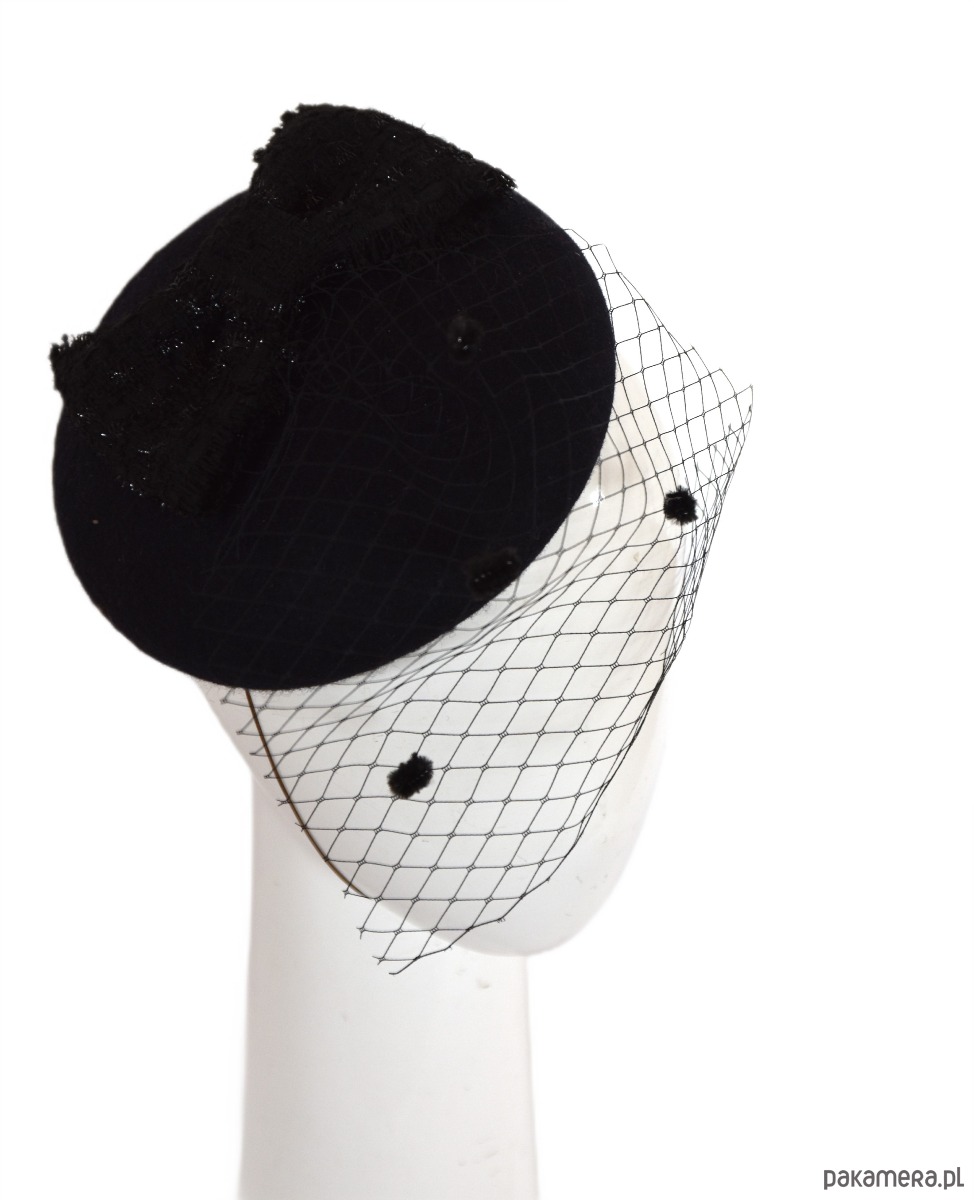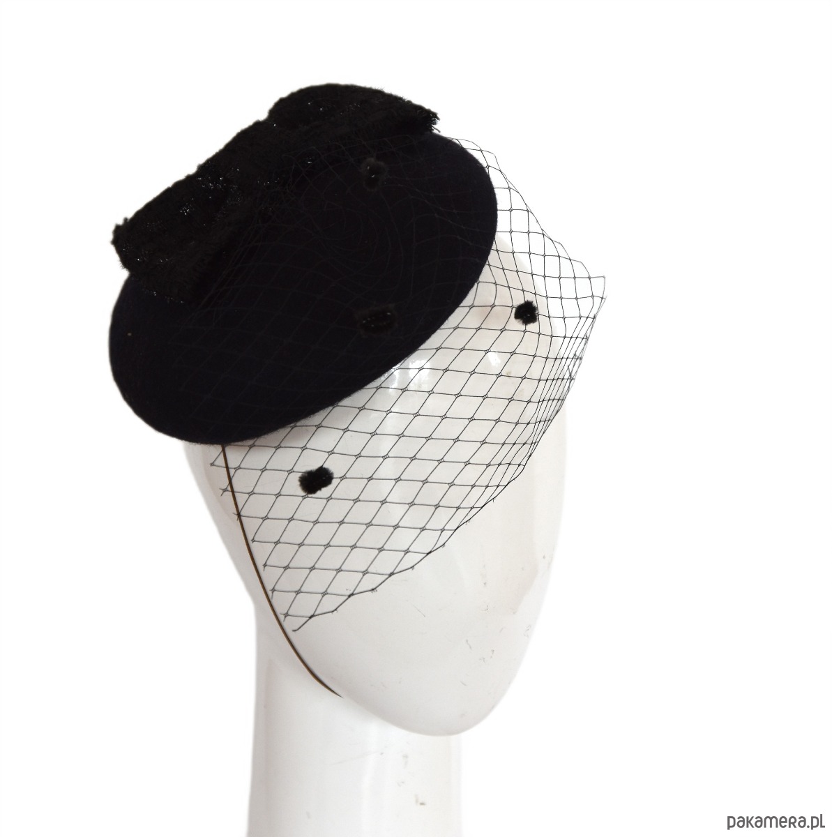 Toczek wykonany z filcu w kolorze czarnym. Zdobiony czarną kokardą z wełny i woalką. Mocowany na gumce kapeluszowej. Rozmiar 20cm średnica