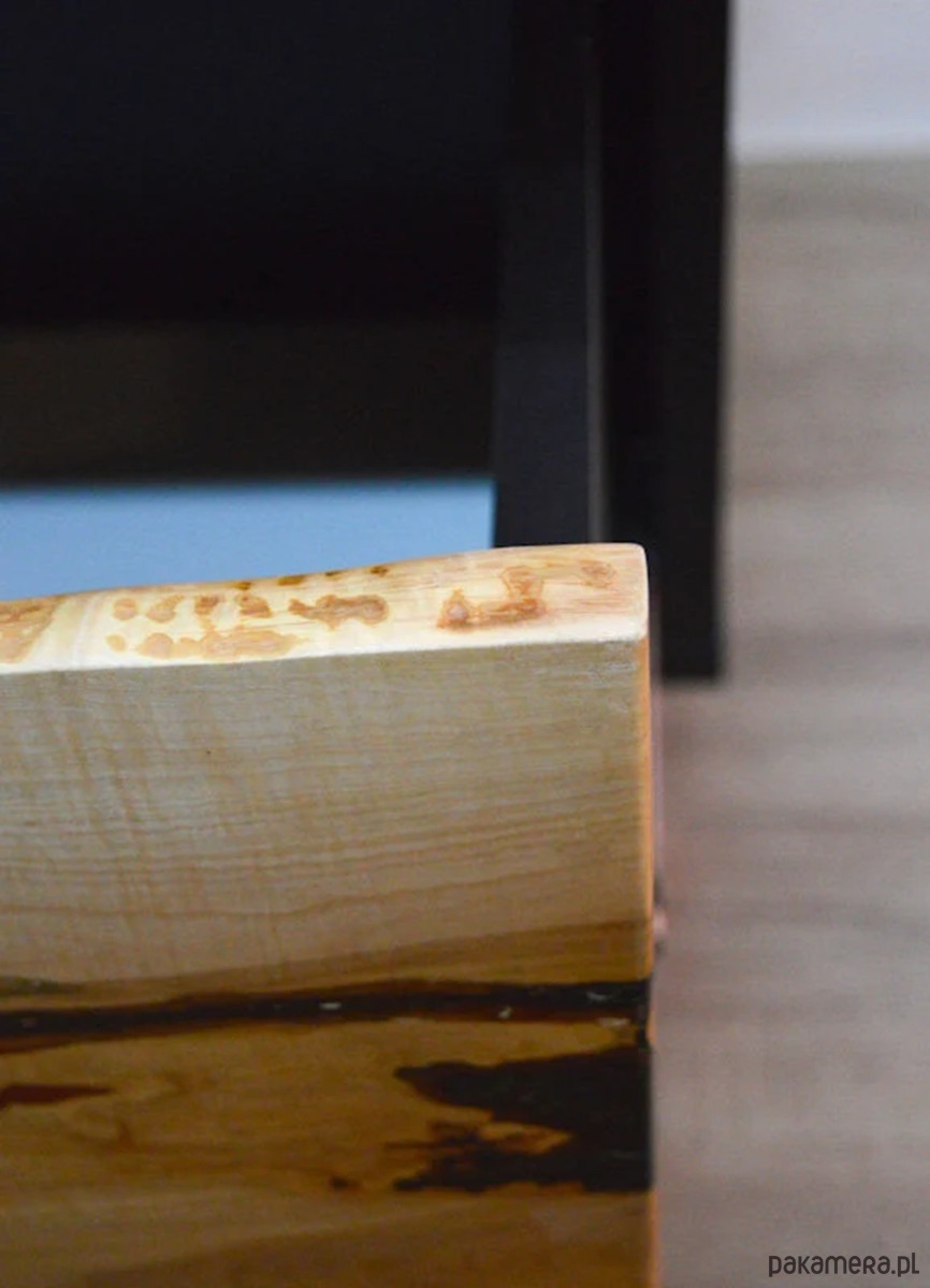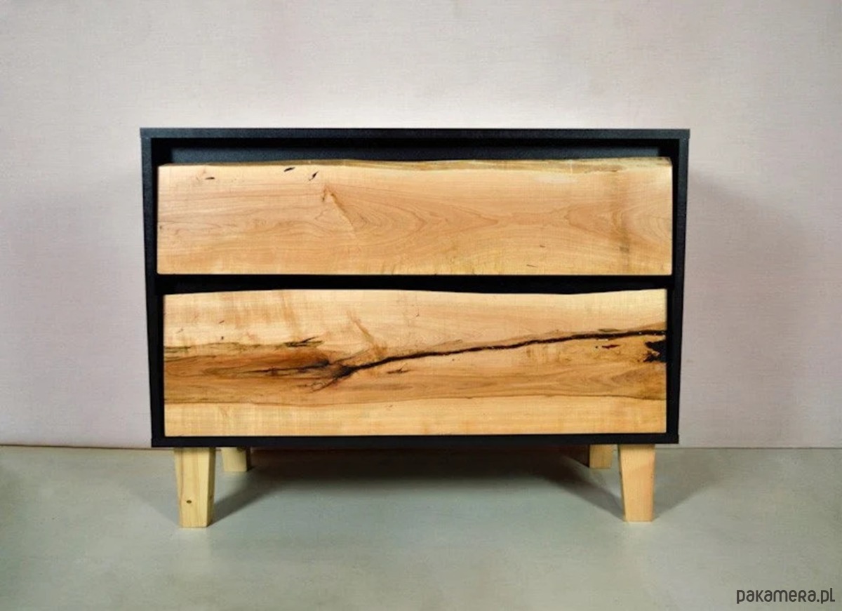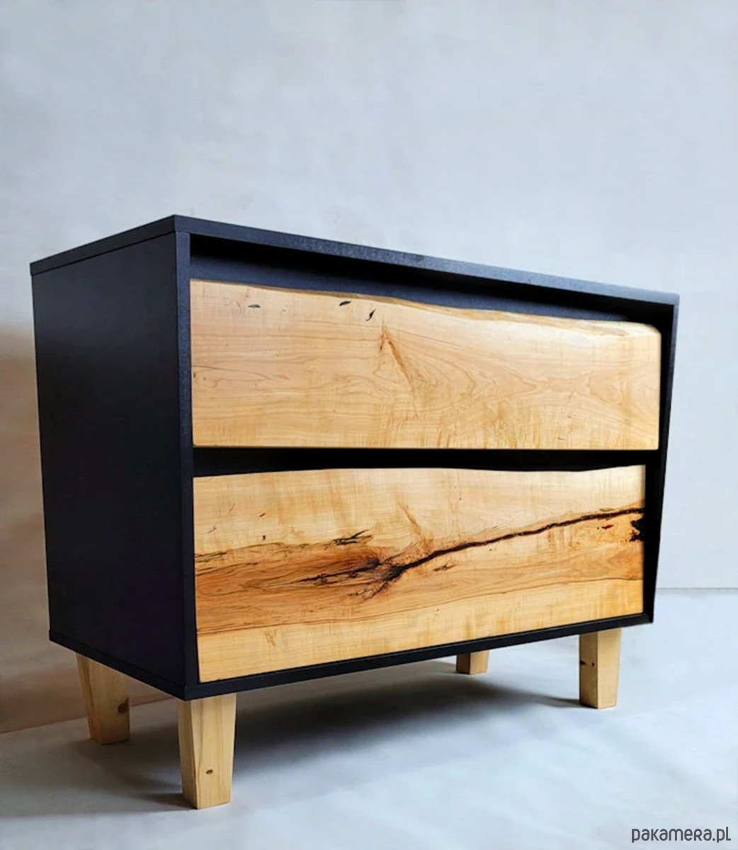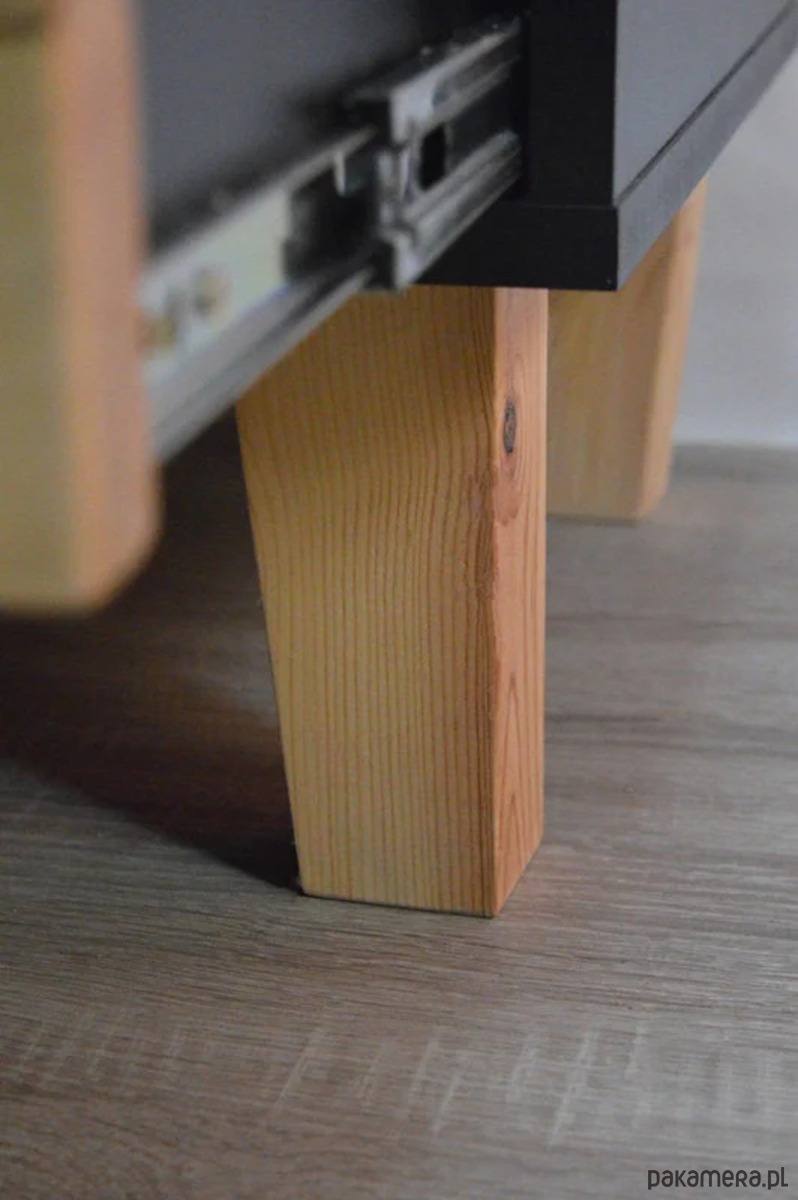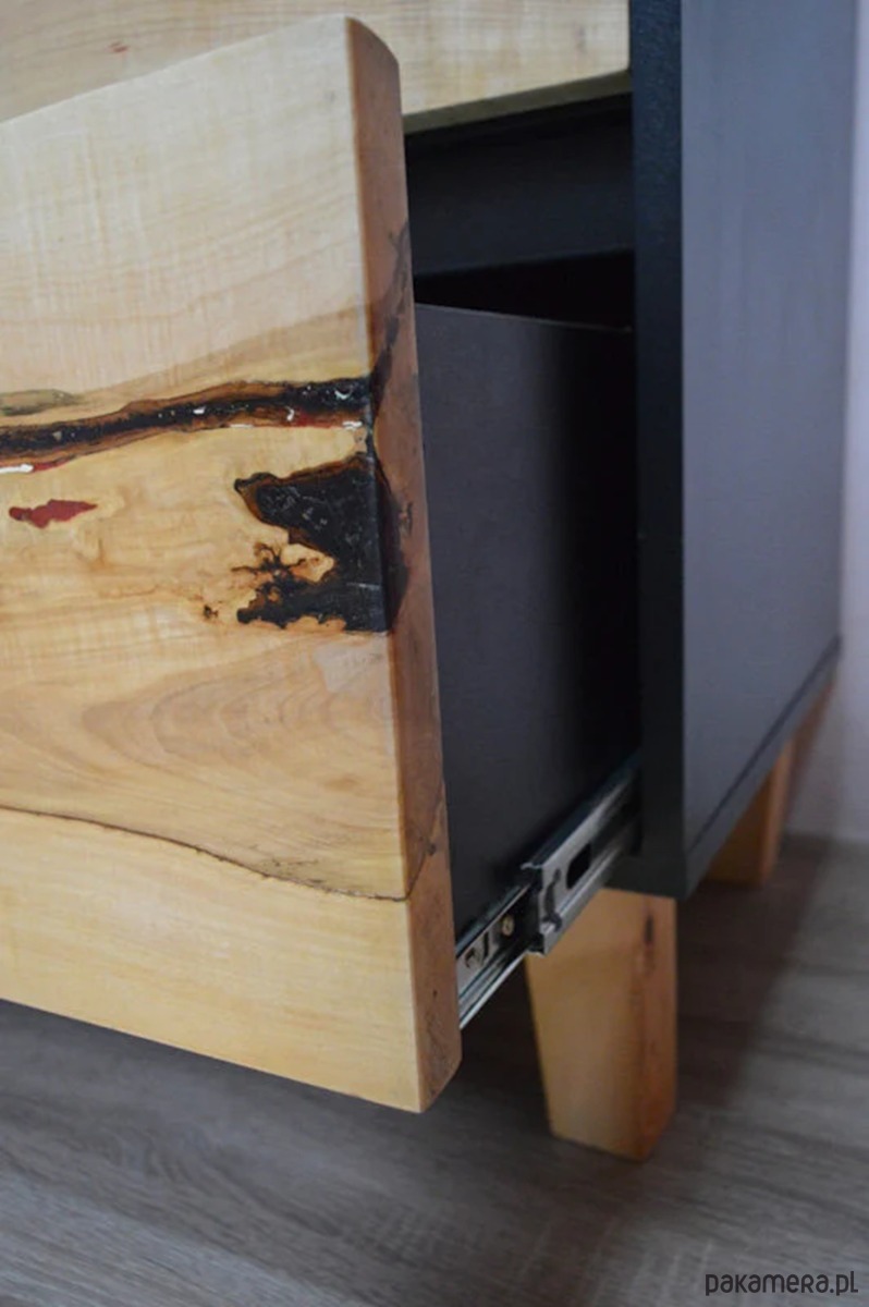 Oprócz niepowtarzalnego wyglądu, szafka posiada praktyczne atrybuty w formie zamykanych poziomo szuflad, które pozwolą wygospodarować miejsce do przechowywania podręcznych atrybutów. Na zdjęciu można zobaczyć solidne systemy mocowania w wersji podstawowej. Na zamówienie, możemy też zainstalować systemy z mechanicznym hamowaniem od naszych profesjonalnych Dostawców. W rezultacie, "każdy mebel zamyka się delikatnie i cicho - niezależnie od wagi szuflady, drzwi czy frontu zawiasowego. W standardzie każdej komody montujemy drewniane nogi, które ręcznie wytwarza dla nas, nasz lokalny Stolarz.