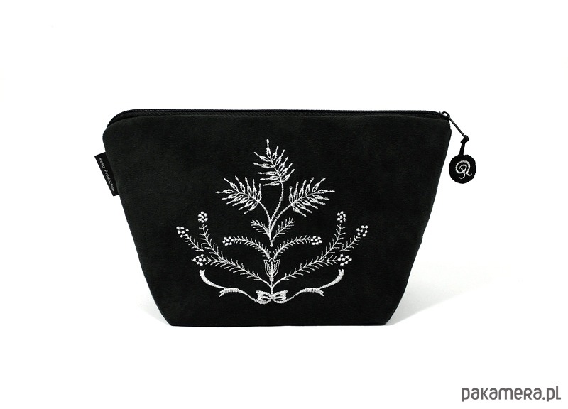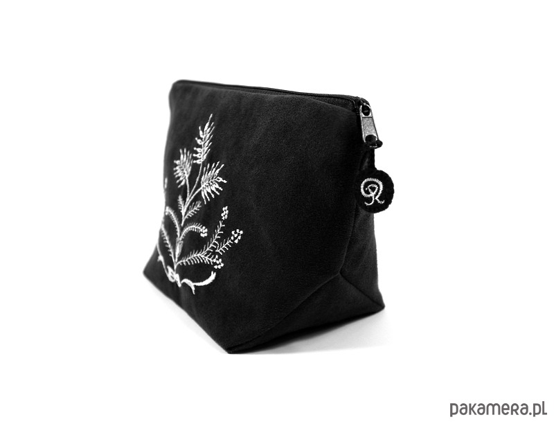 Kosmetyczka średniej wielkości. Bardzo pakowna, więc idealnie spisze się podczas podróży. Uszyta została z eko zamszu alkantara w kolorze czarnym. Z przodu ozdobiona została pięknym haftem w kolorze białym. Kosmetyczka została usztywniona w taki sposób, że nawet pusta trzyma fason. Do środka kosmetyczki została wszyta podszewka bawełniana. Kosmetyczka zapinana jest na zamek w kolorze czarnym.