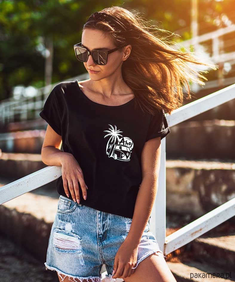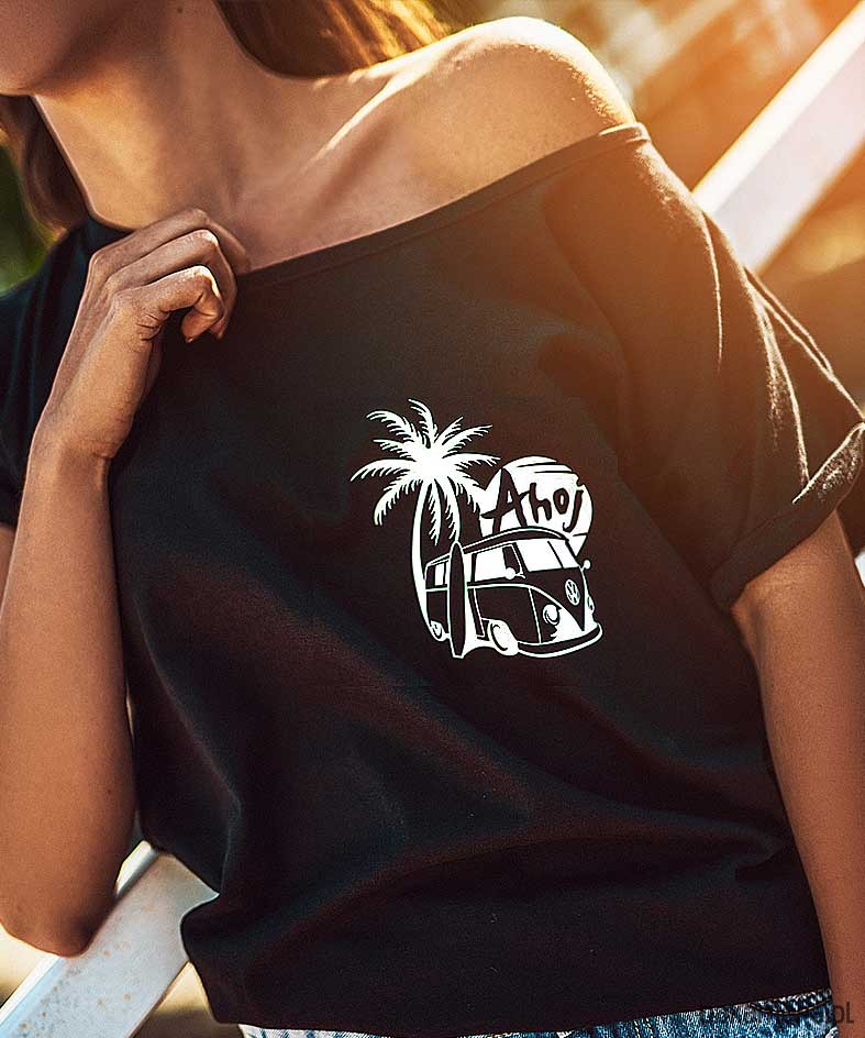 czarna damska surferska koszulka z nadrukiem ahoj przygodo