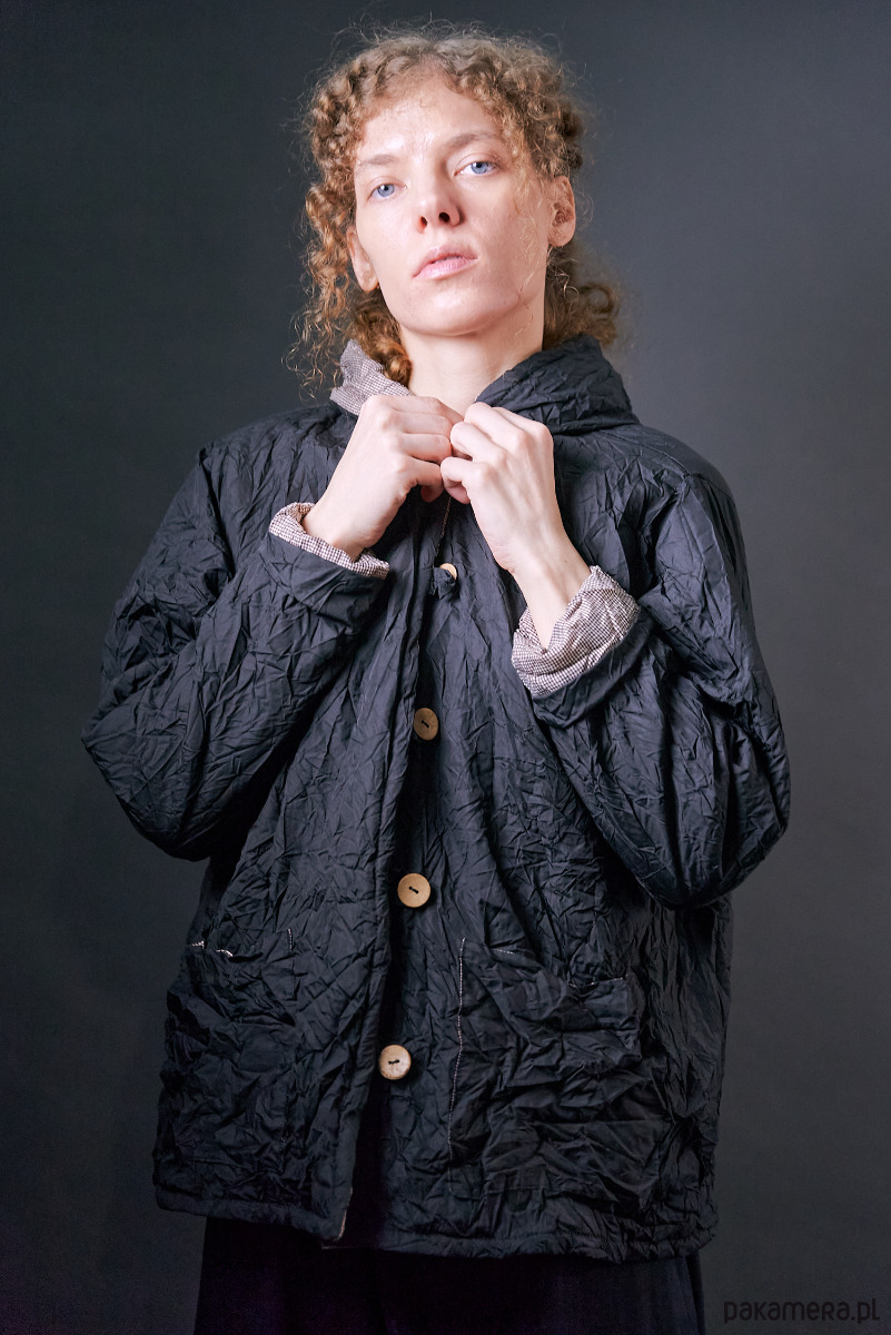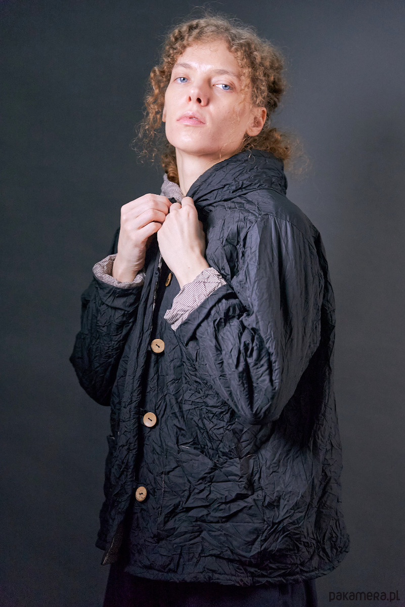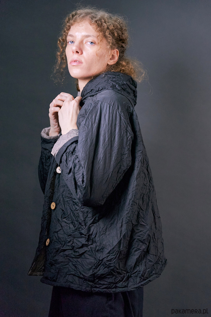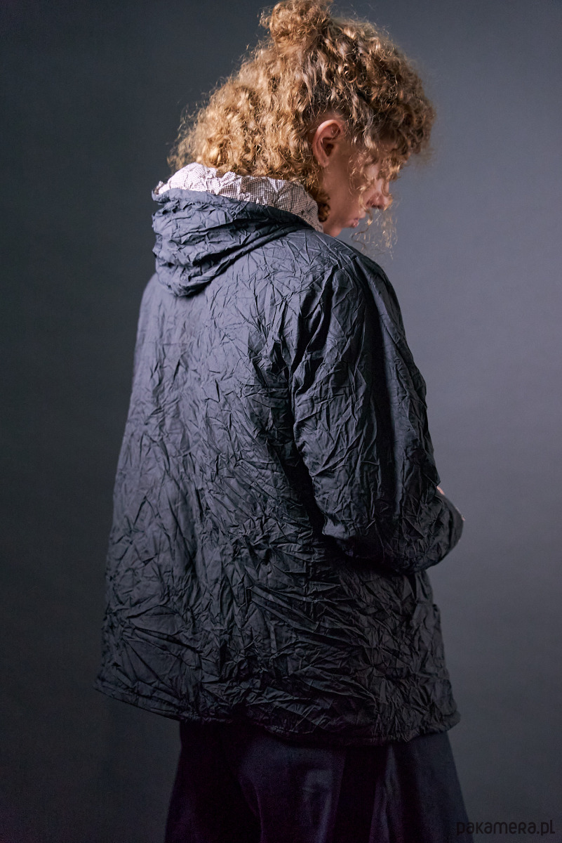 Czarna kurtka ocieplana z kapturem wykonana z plisowanego / gniecionego poliestru .