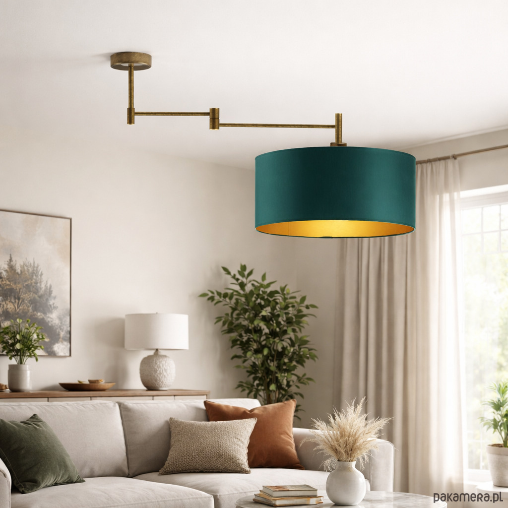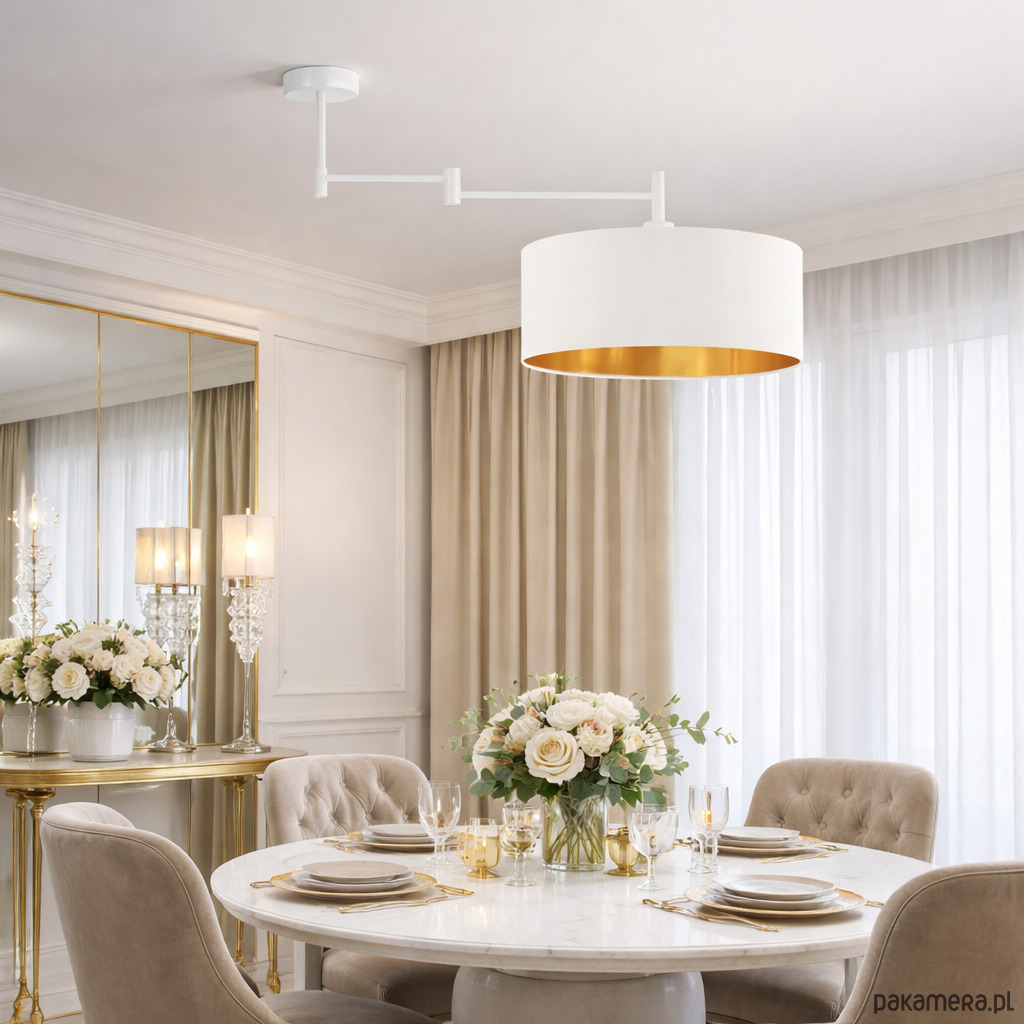Plafon RANGUN GOLD to niezwykle oryginalna propozycja oświetlenia. Lampa zaskakuje nie tylko nietypowym designem ale również innowacyjnymi udogodnieniami. Jej złote wnętrze charakteryzuje się również dwojakim typem faktury, w przypadku białego abażuru jest ona połyskująca zaś w czarnej, zielonej, szarej oraz granatowej wersji całkowicie matowa. Lampę wyróżnia również fakt zastosowania w niej ruchomego wysięgnika dzięki, któremu możliwe jest zmienianie kąta padania światła w dowolnym momencie.
