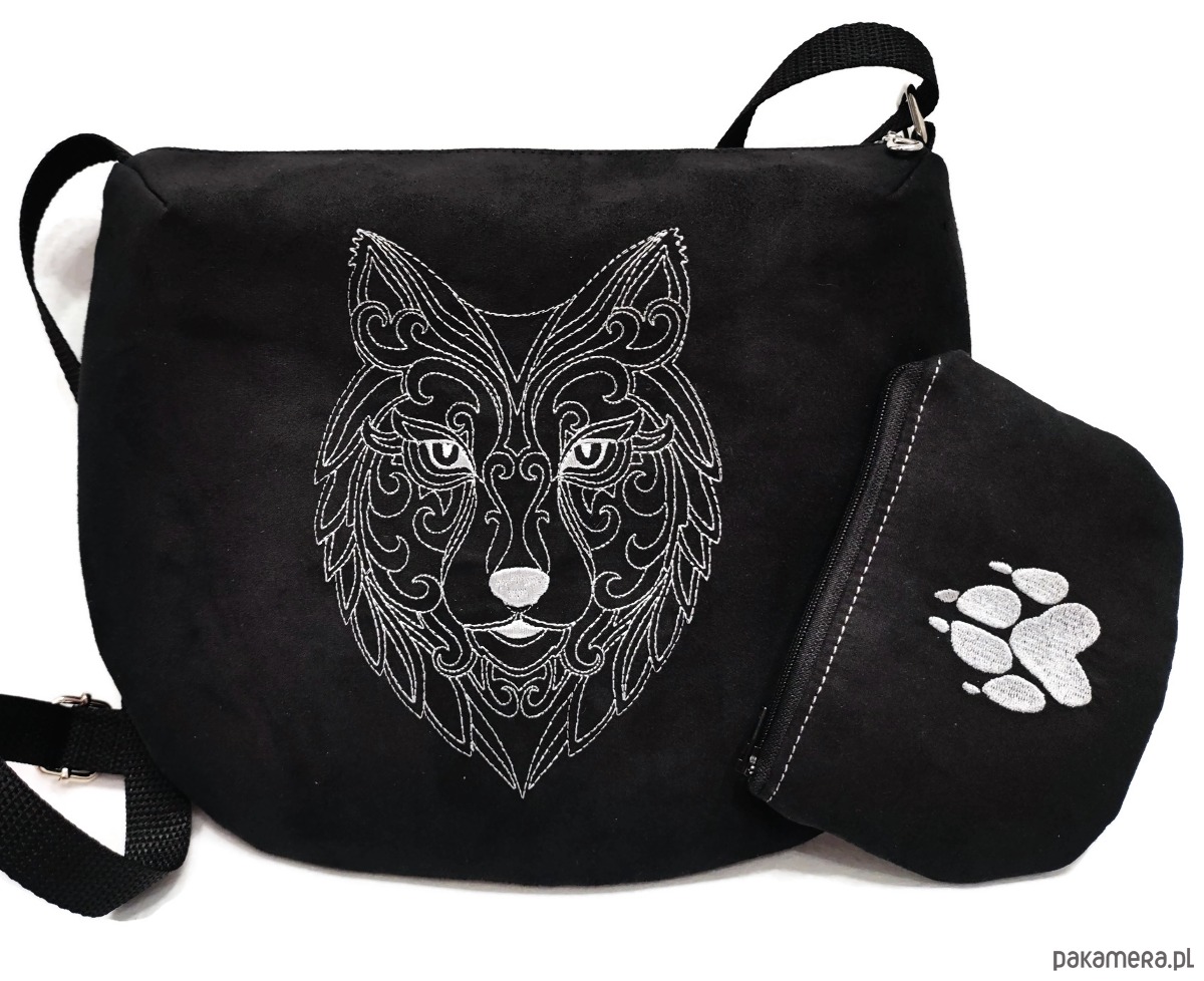Czarna listonoszka z wilkiem, torebka z wilkiem , portfelik łapa