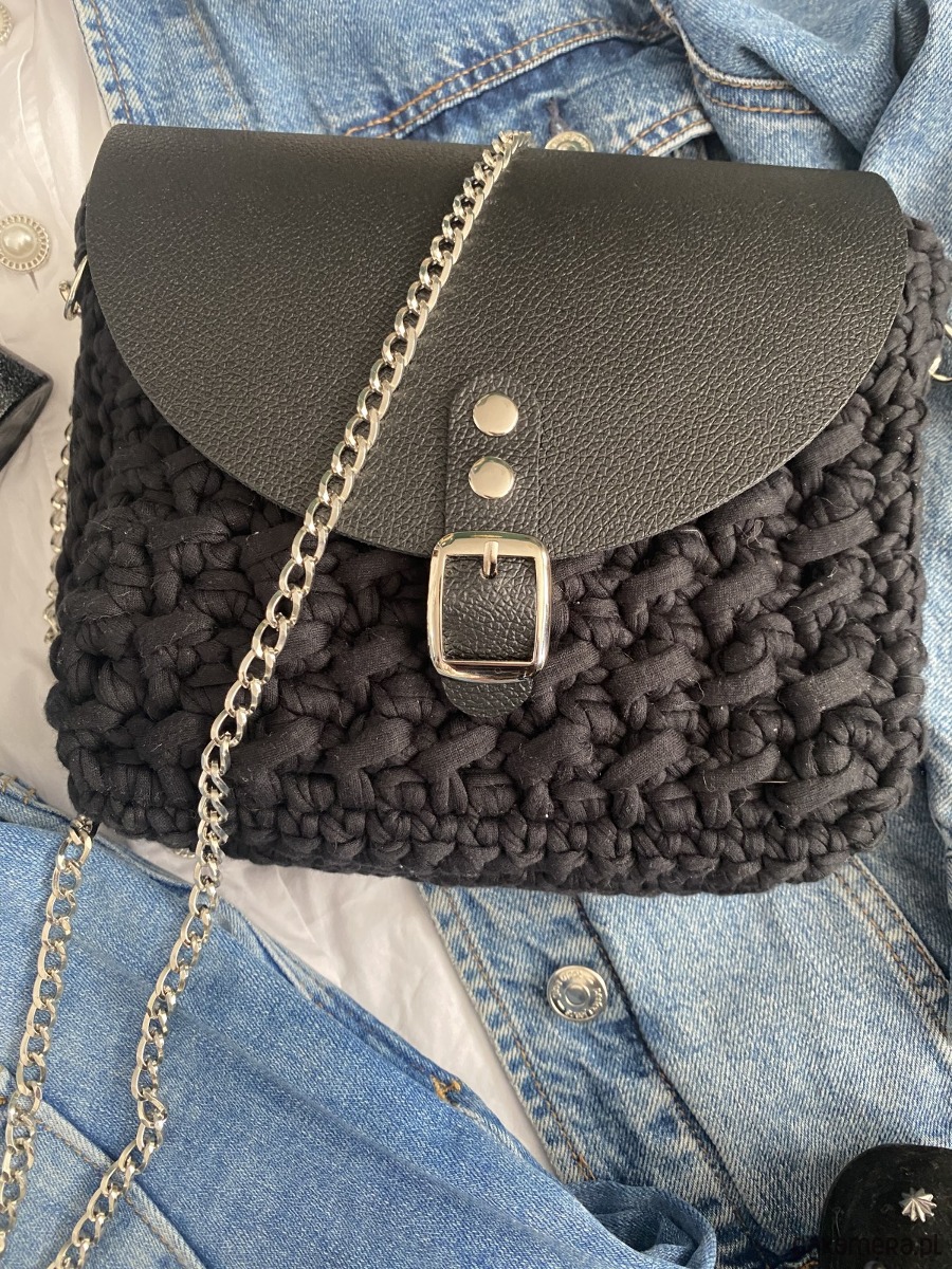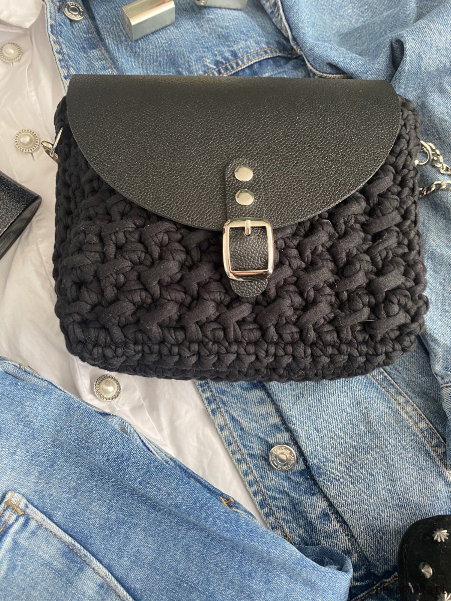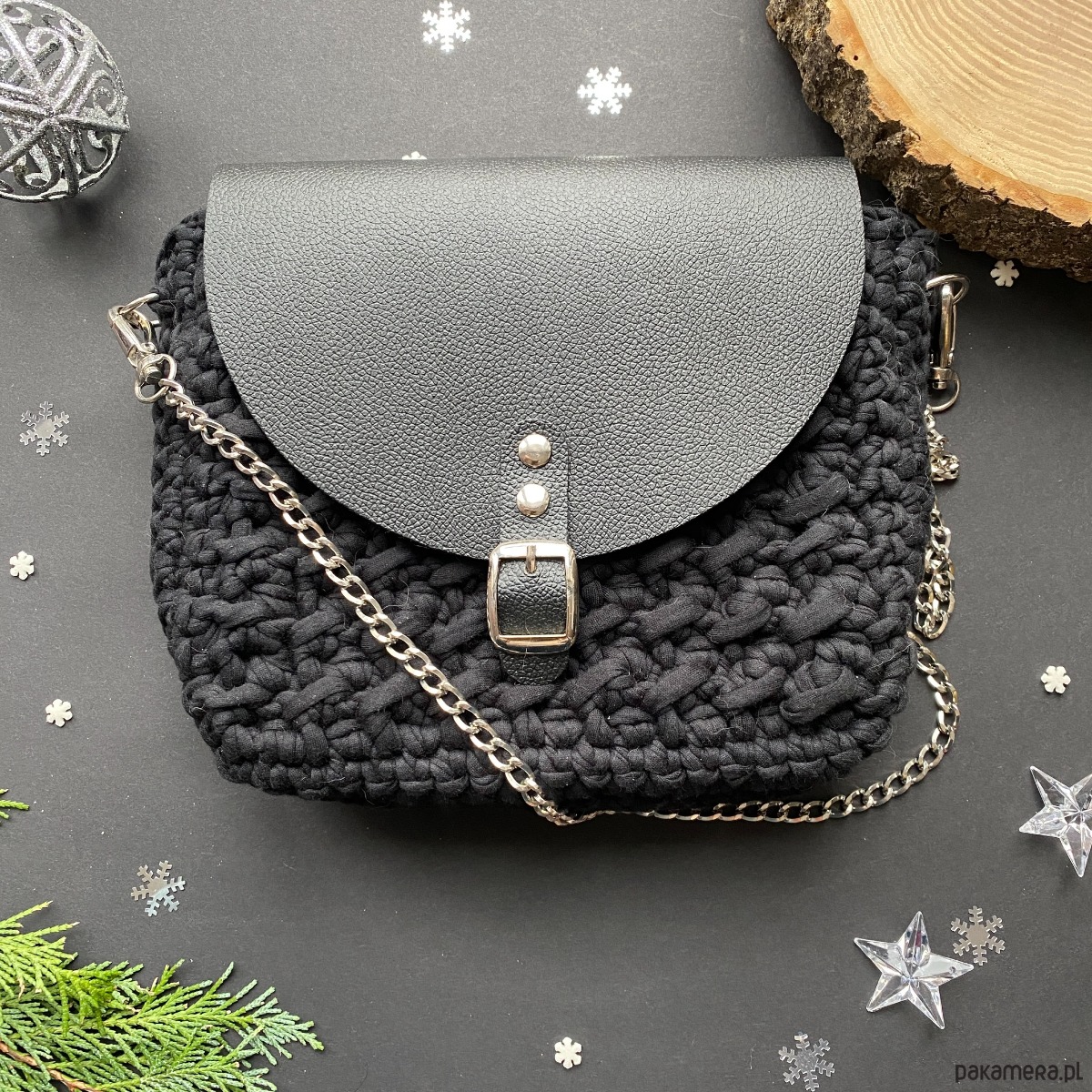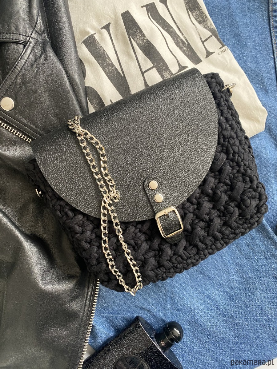 Szydełkowa torebka wykonana z bawełnianego sznurka w kolorze czarnym, posiada klapkę z ekoskóry w kolorze czarnym z metalowym srebrnym zatrzaskiem. Swoim designem łączy w sobie elegancję ze sportowym akcentem.
