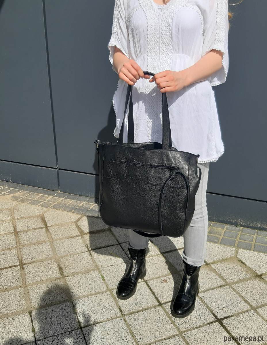 Duża torba uszyta ze skóry naturalnej w kolorze czarnym.